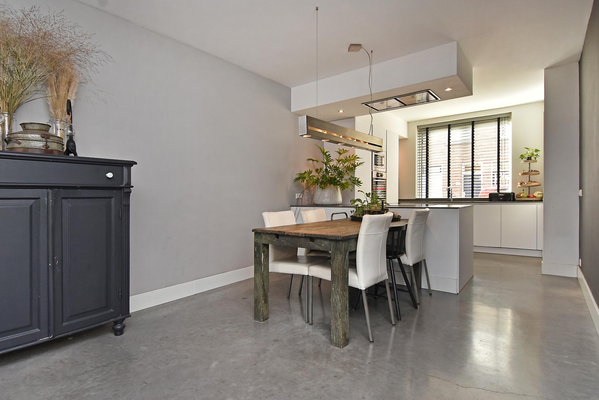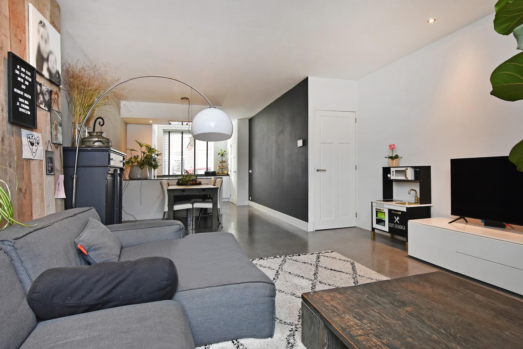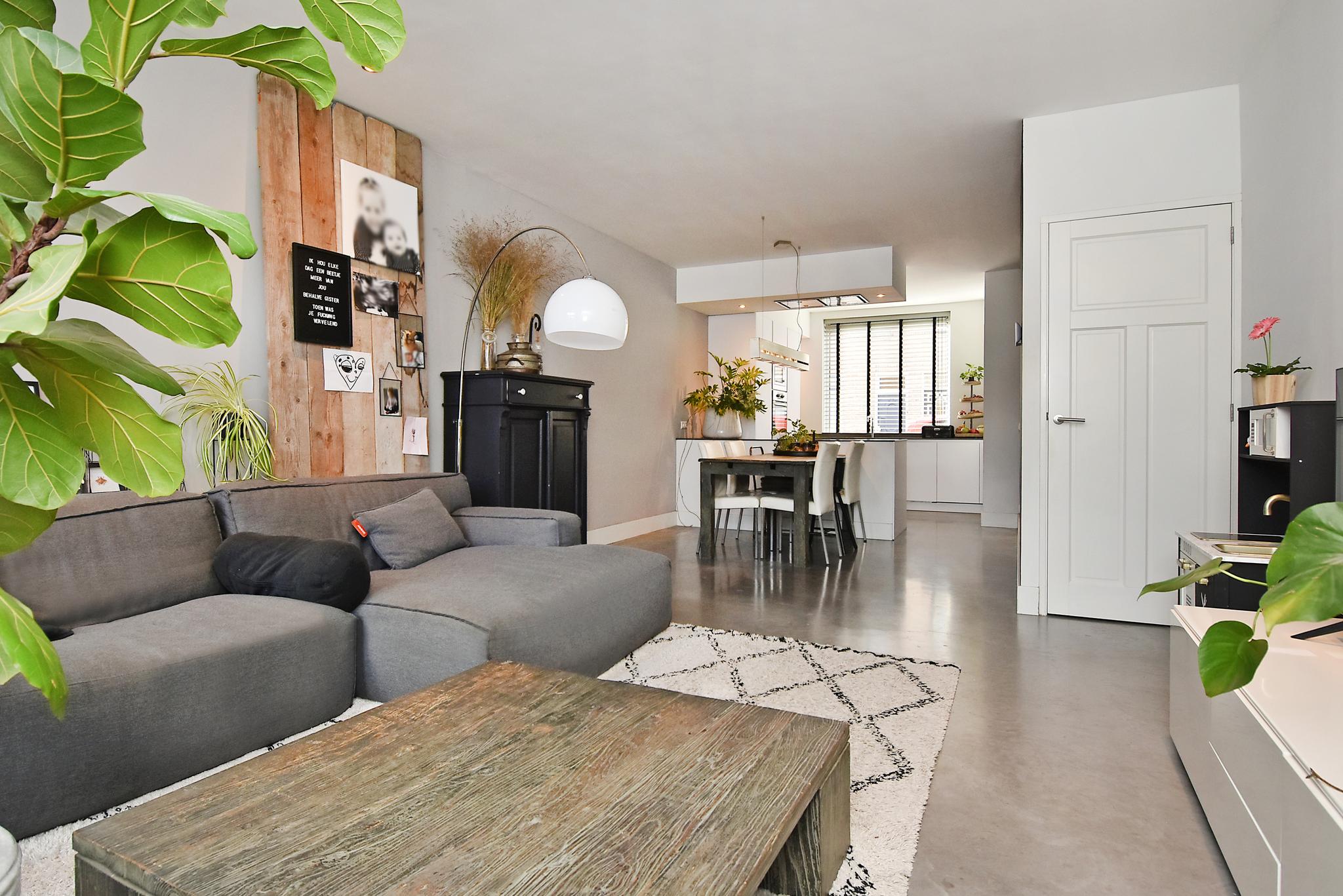 Woonkamer: ruime, uitgebouwde woonkamer met gecoate betonvloer voor een stoere/industriële uitstraling. Uiteraard is de vloer wel v.v. comfortabele vloerverwarming. Via openslaande deuren toegang tot de tuin.