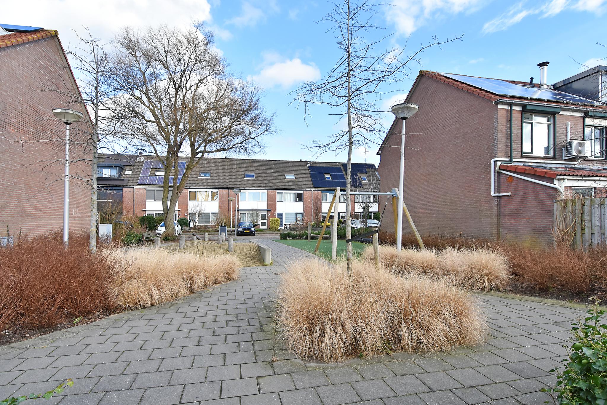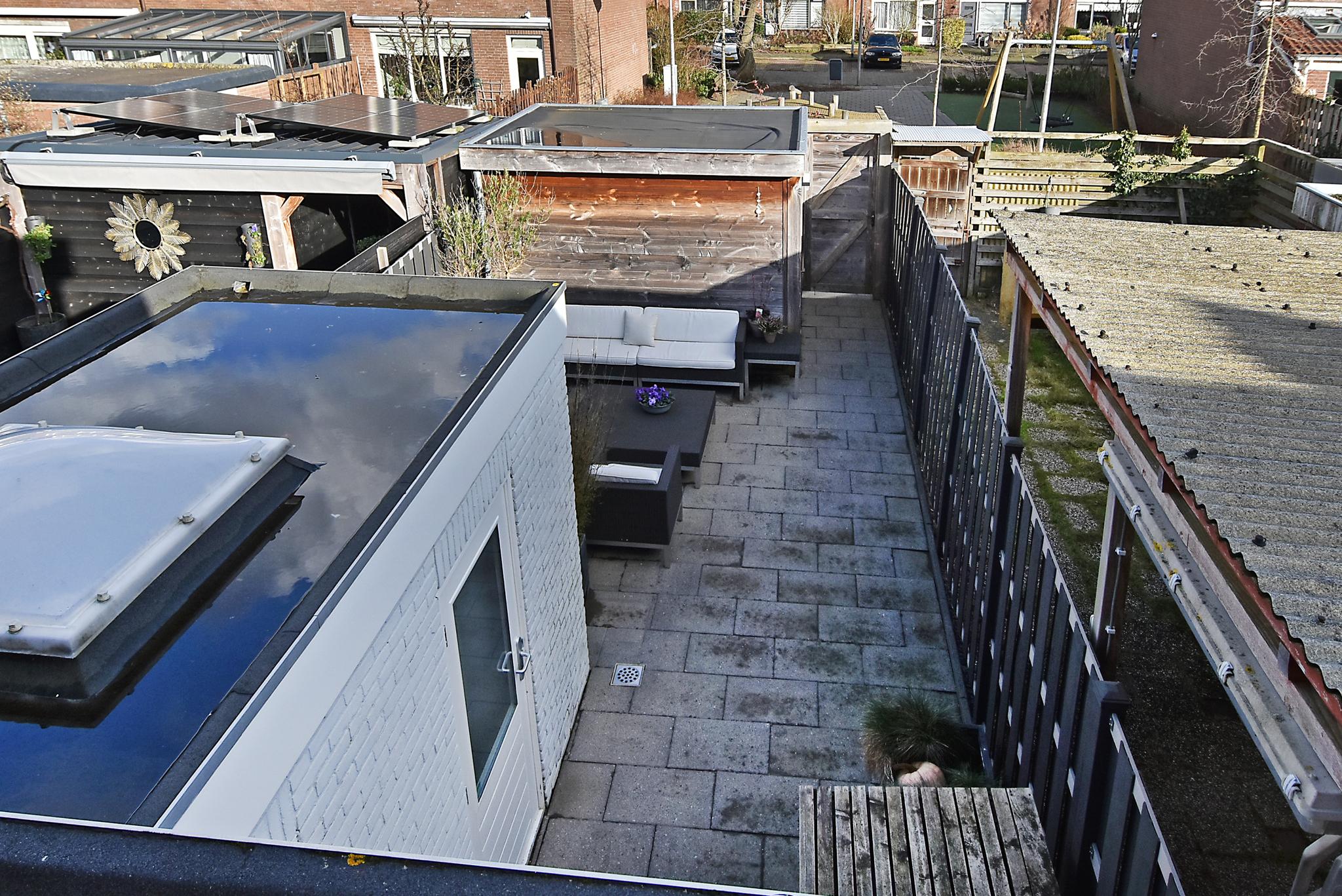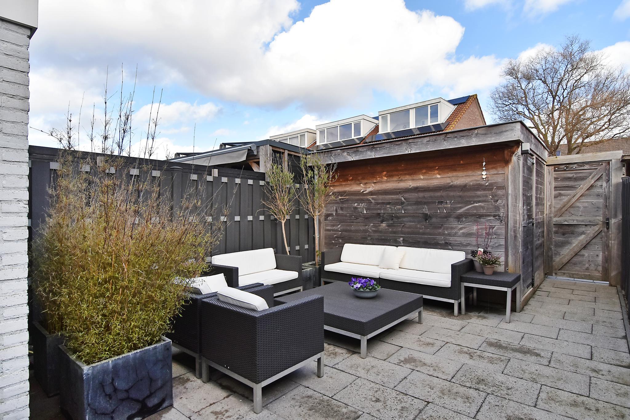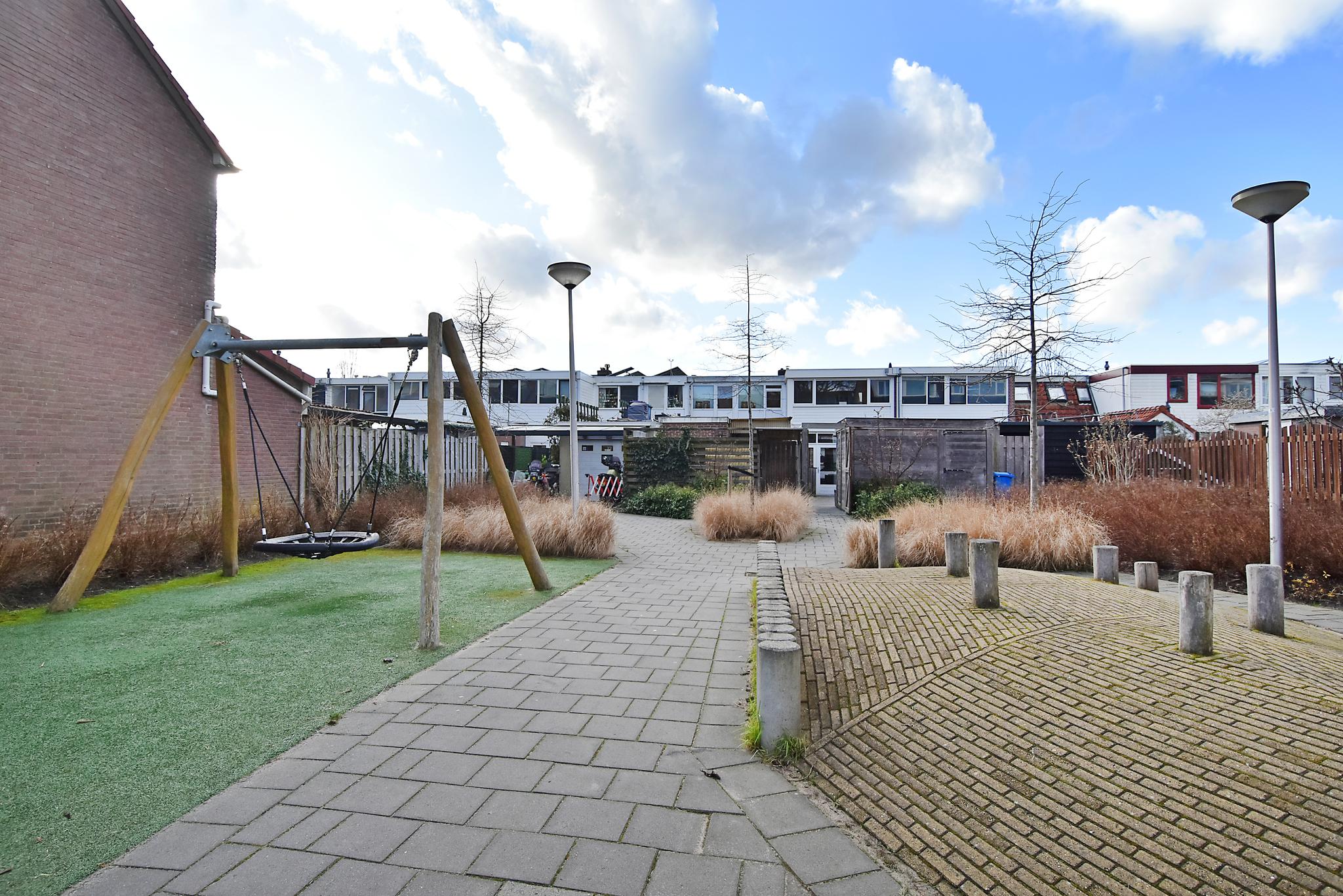 Tuin: modern aangelegde tuin met houten berging in de achtertuin. Via de poort doorloop naar een speeltuintje.