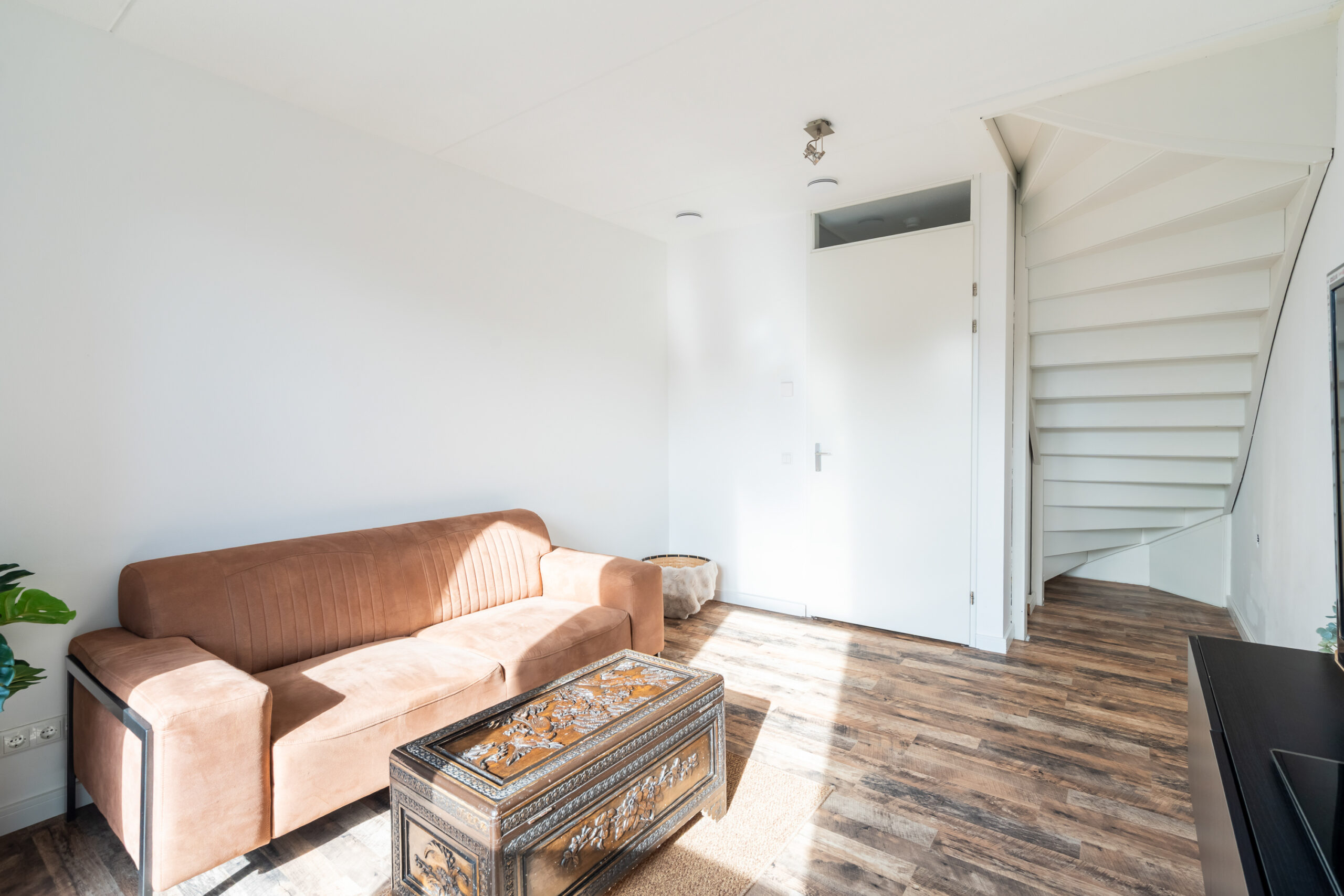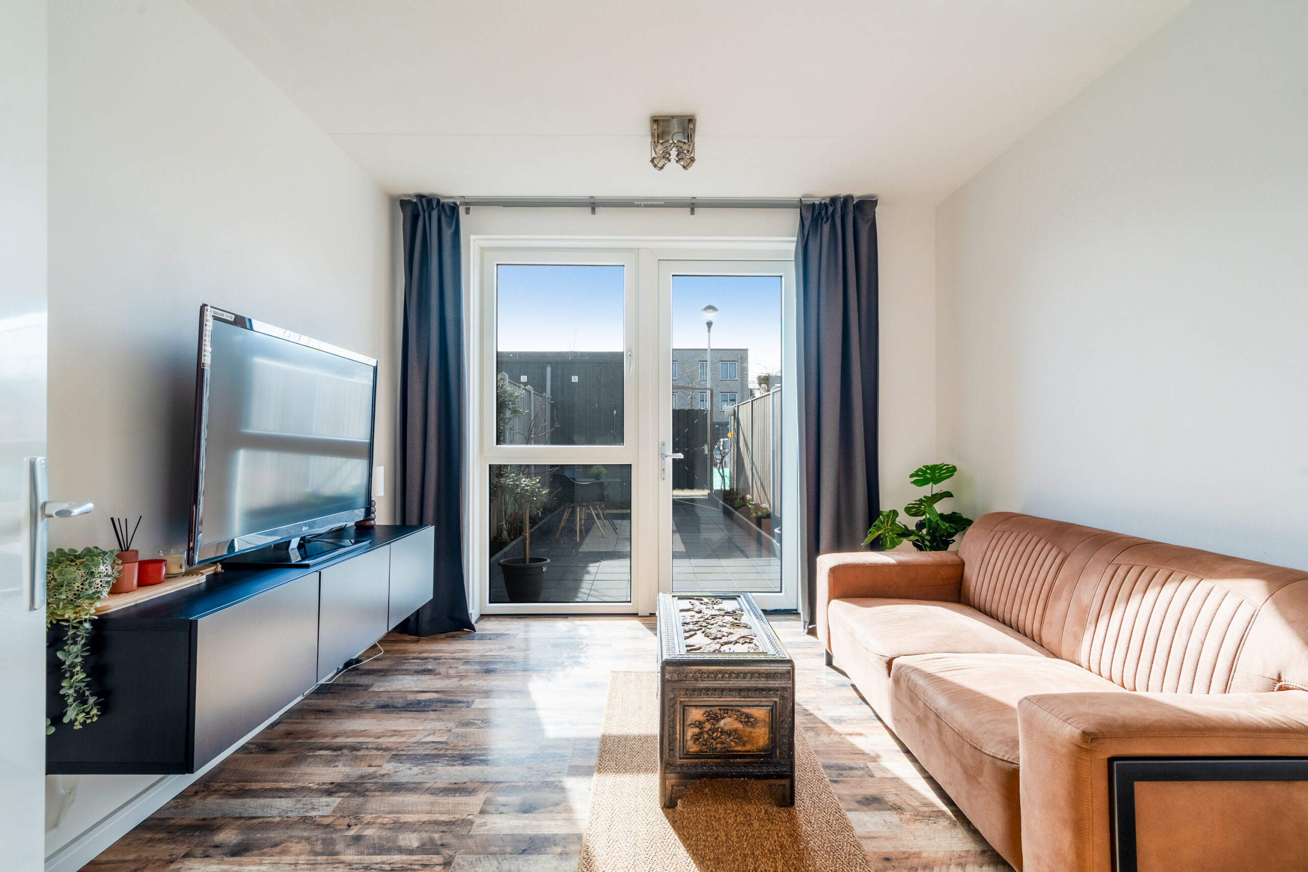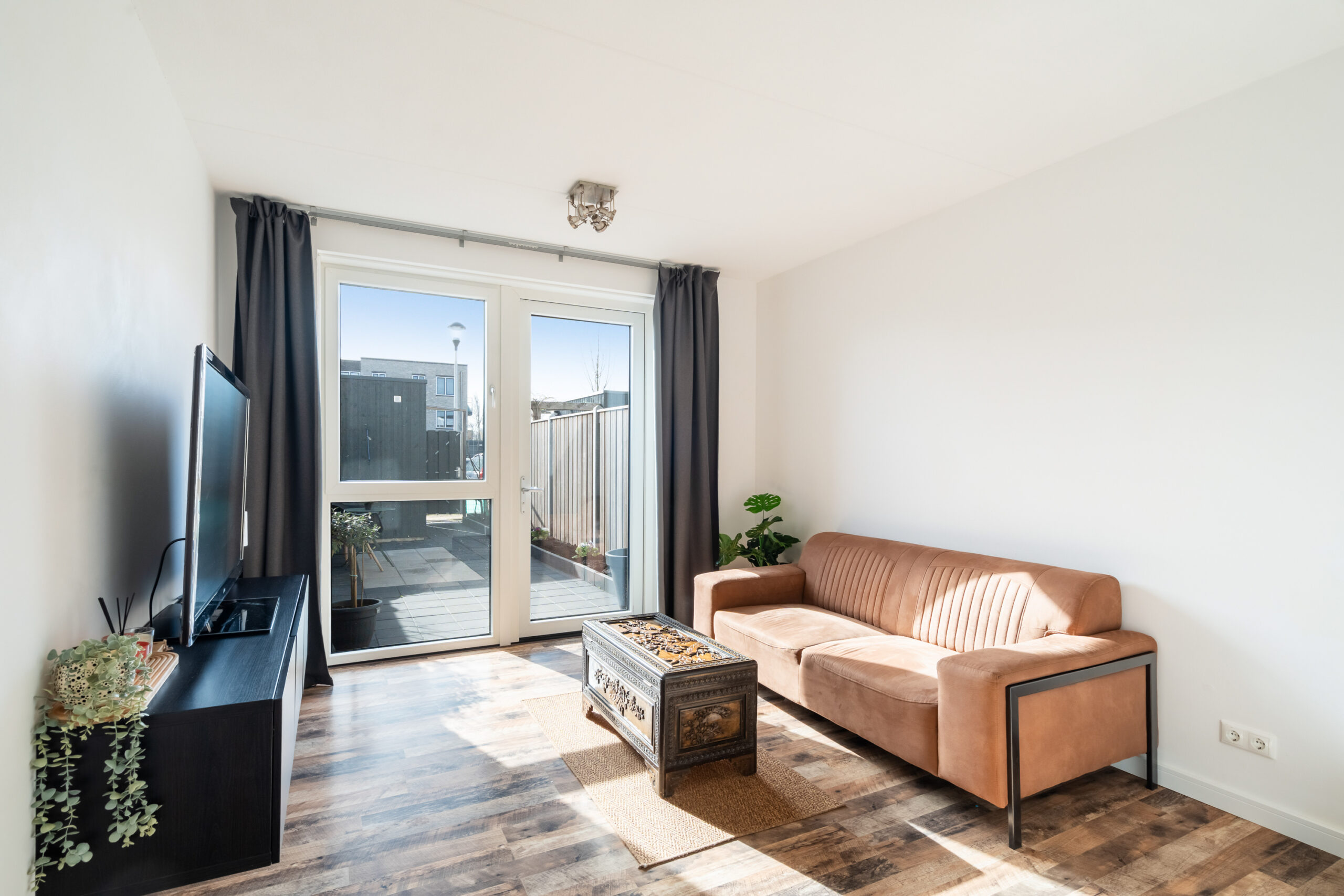 De tuingerichte woonkamer ligt aan de achterzijde en heeft een deur naar de achtertuin, waardoor binnen en buiten mooi met elkaar verbonden zijn.