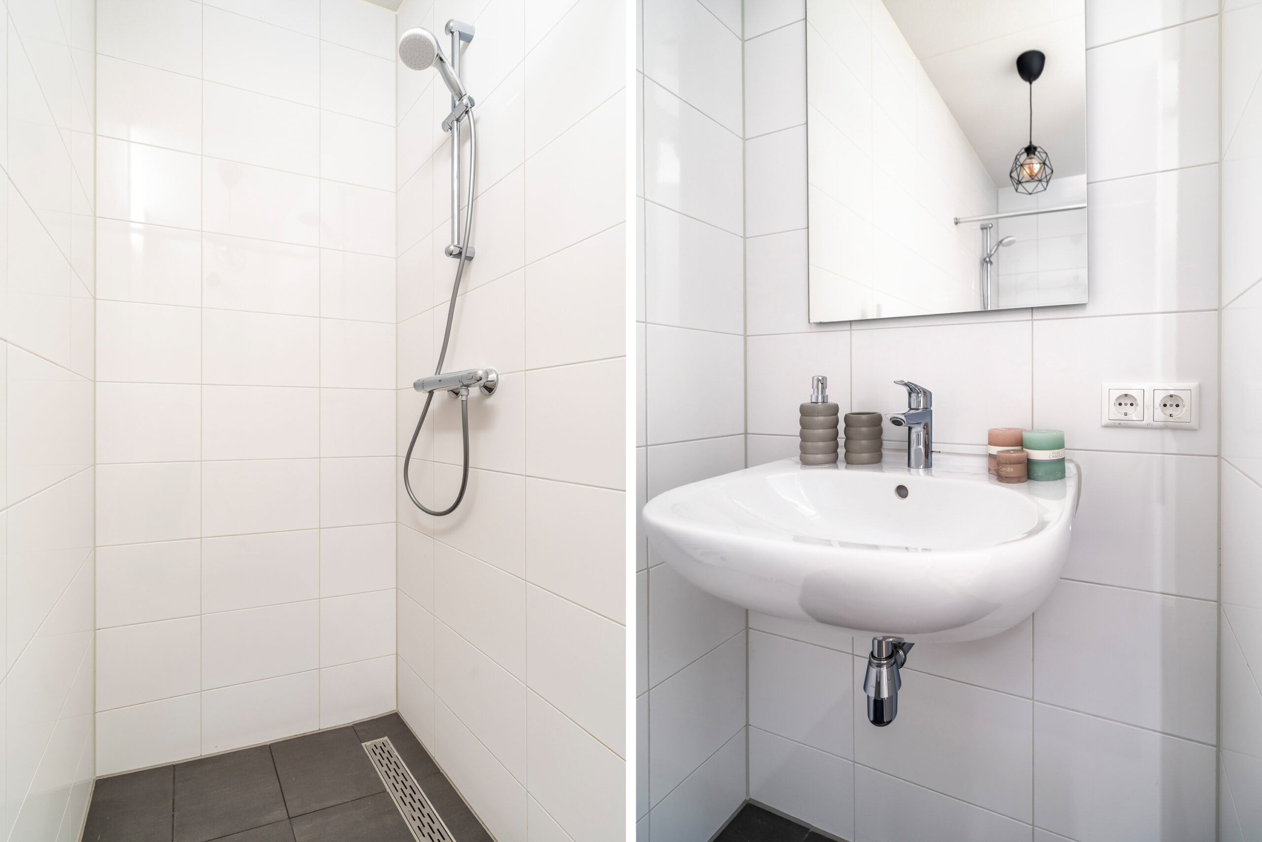 De moderne badkamer is uitgerust met een douche en een wastafel.