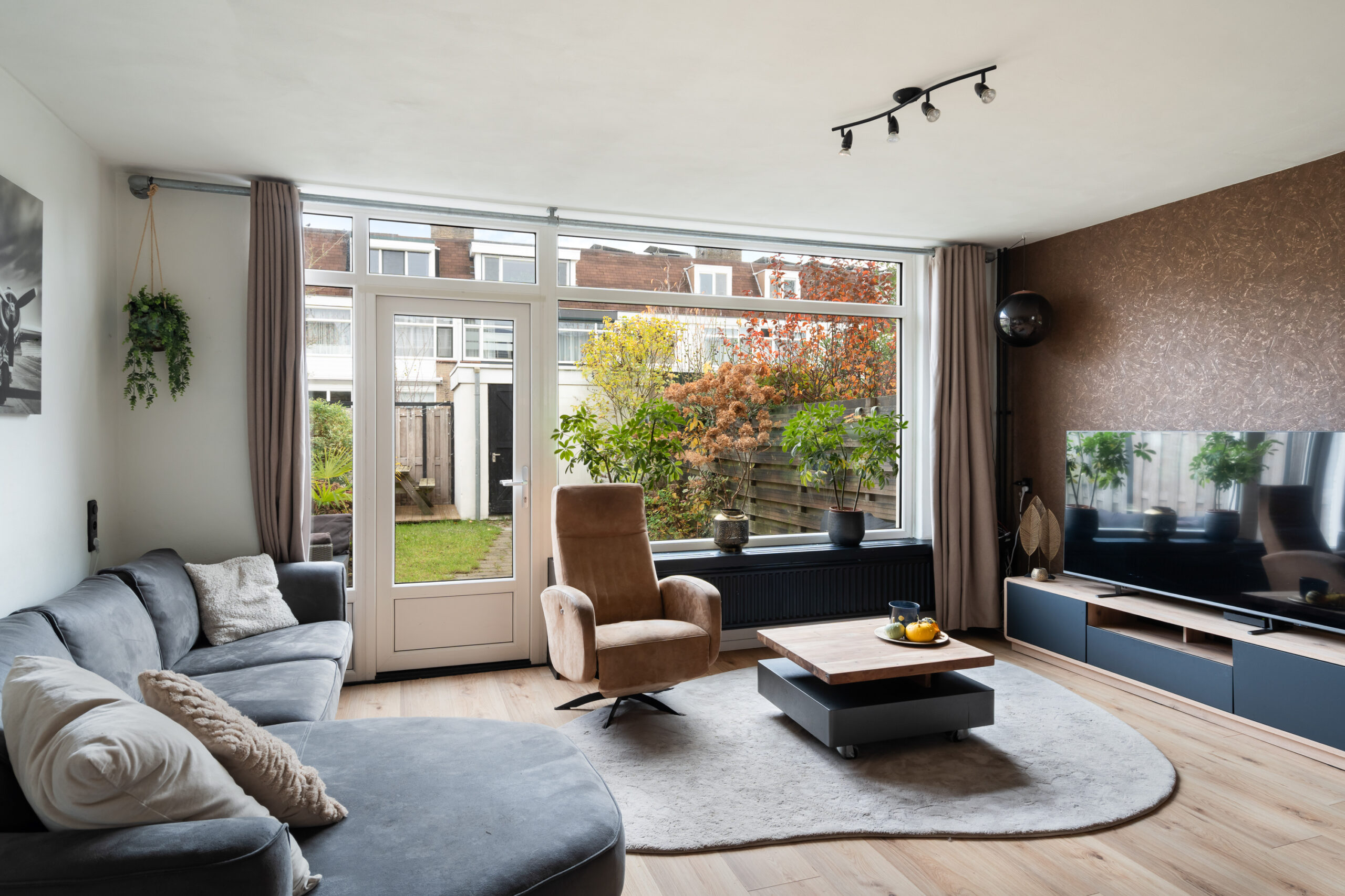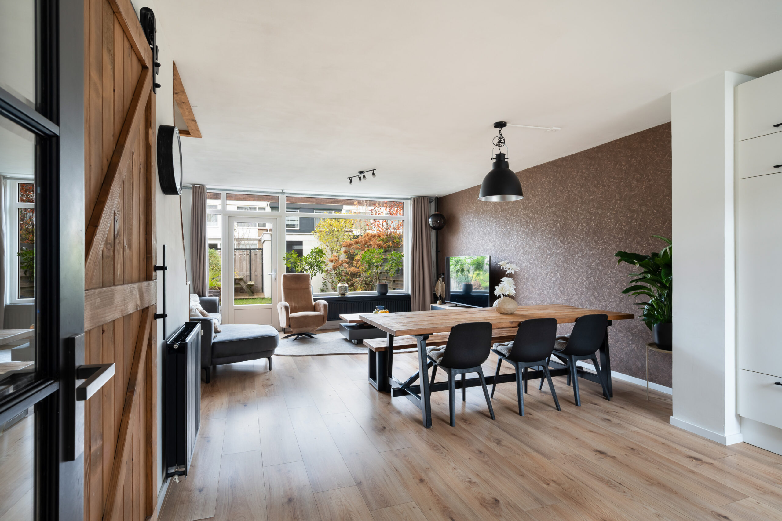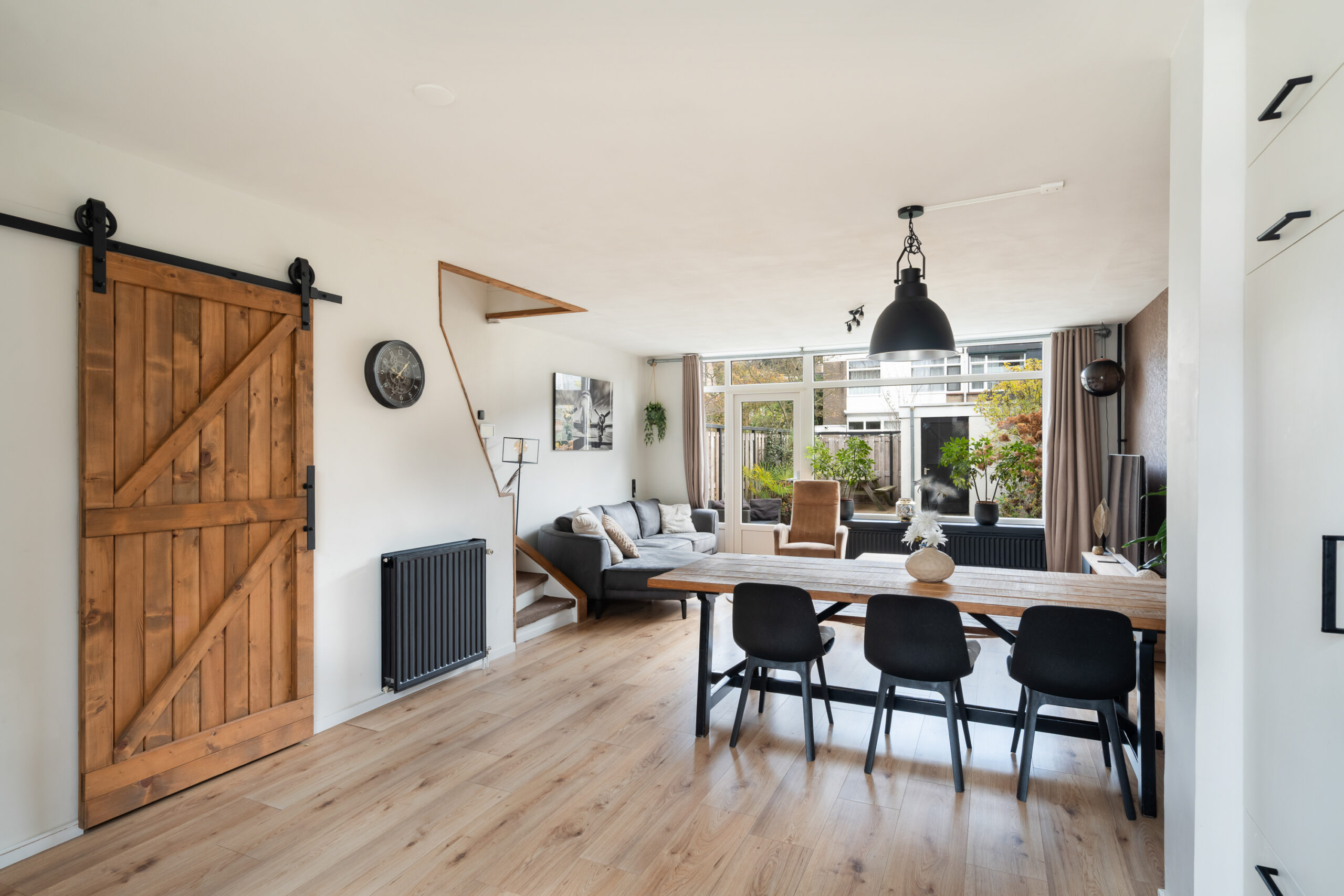 – Woonkamer met trapkast en een nieuwe laminaatvloer van 2024