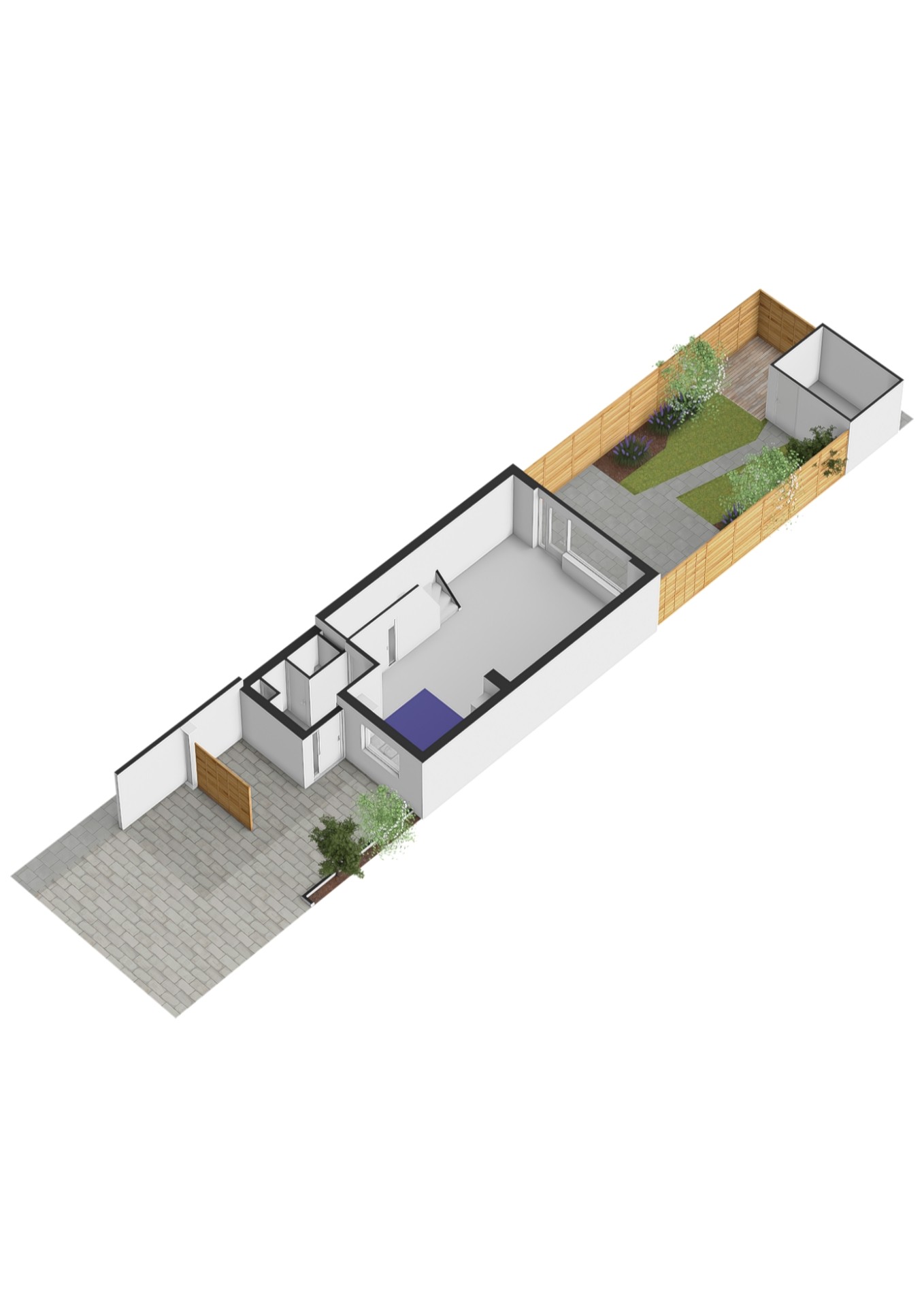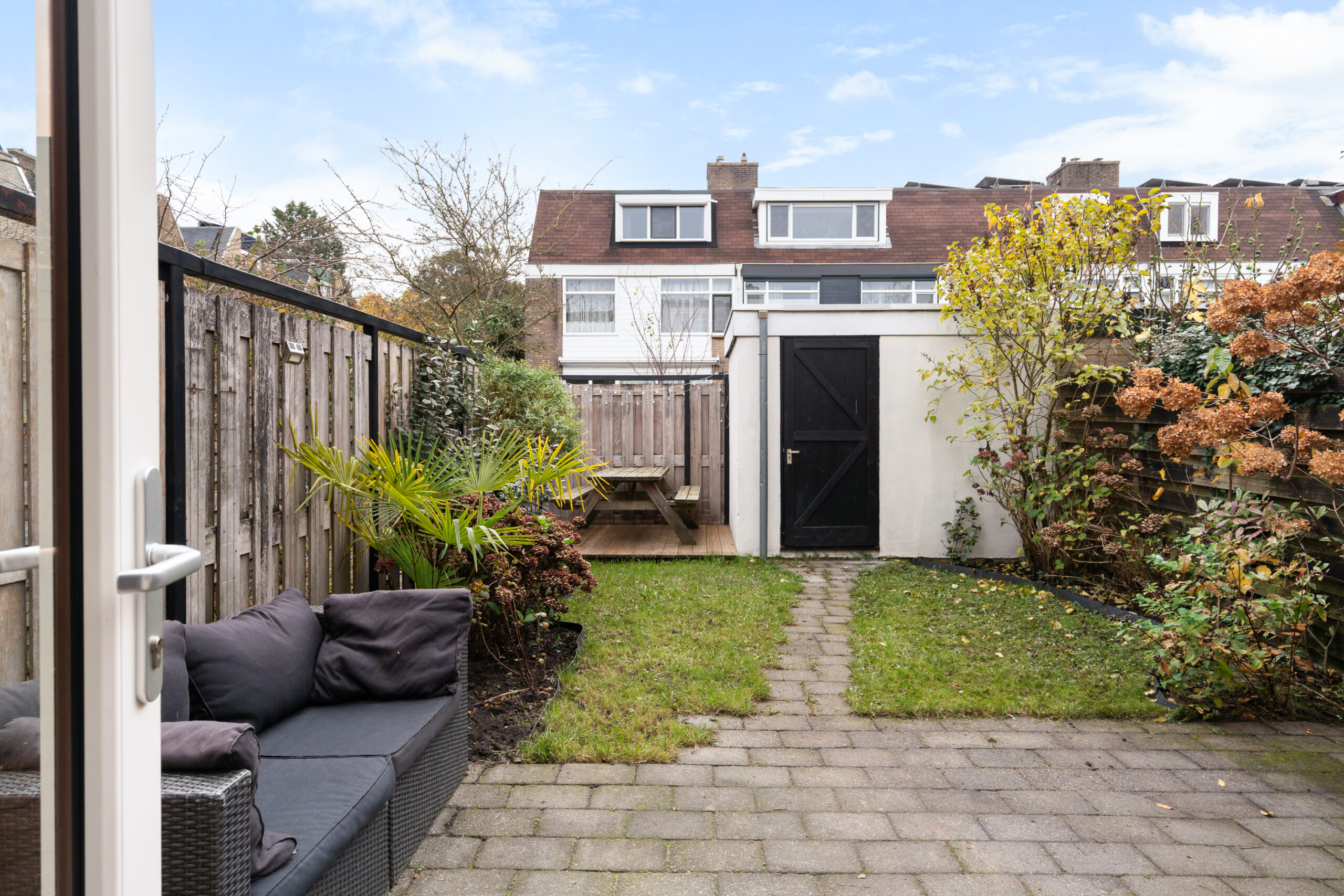 De tuin is op het Oosten gesitueerd, heeft een stenen berging en een achterom.