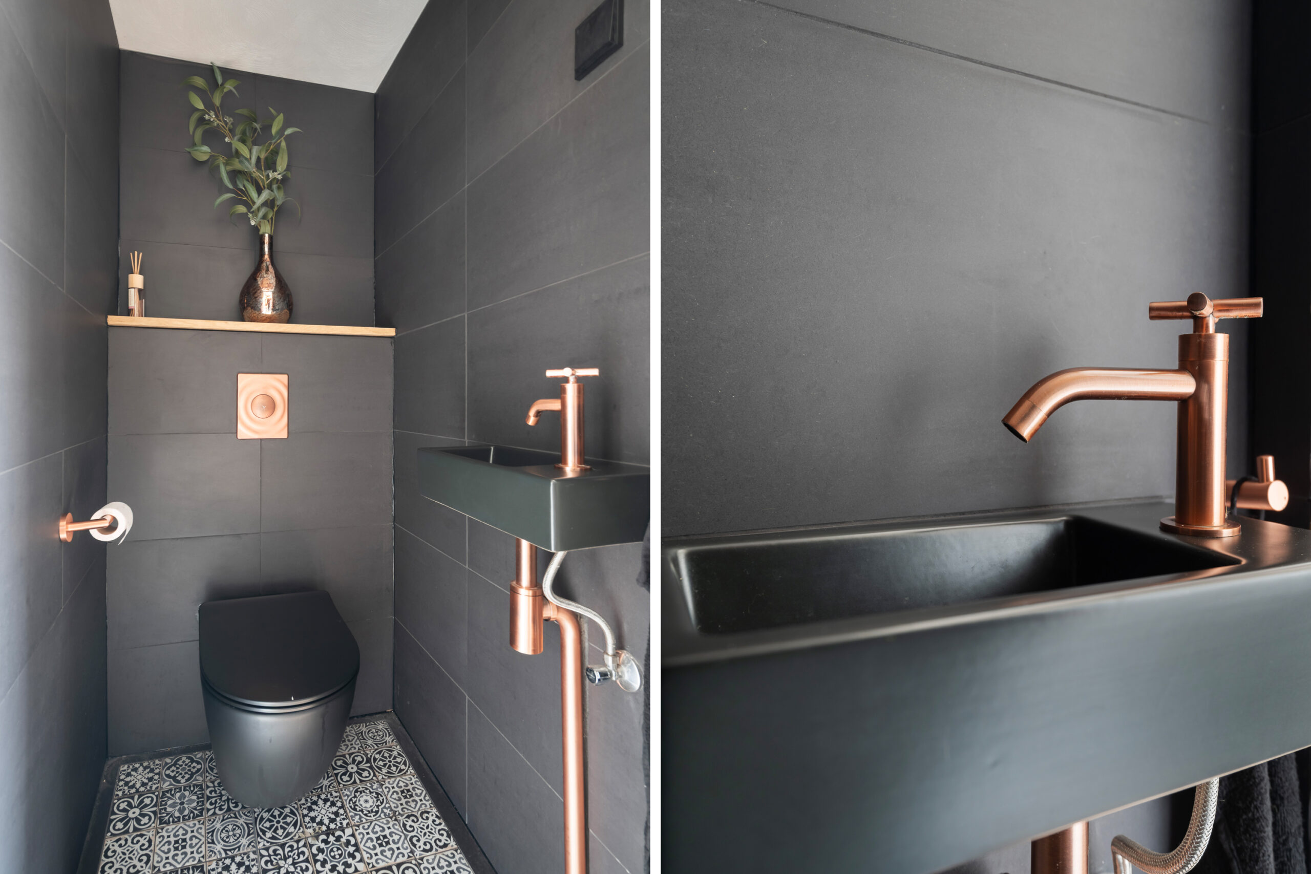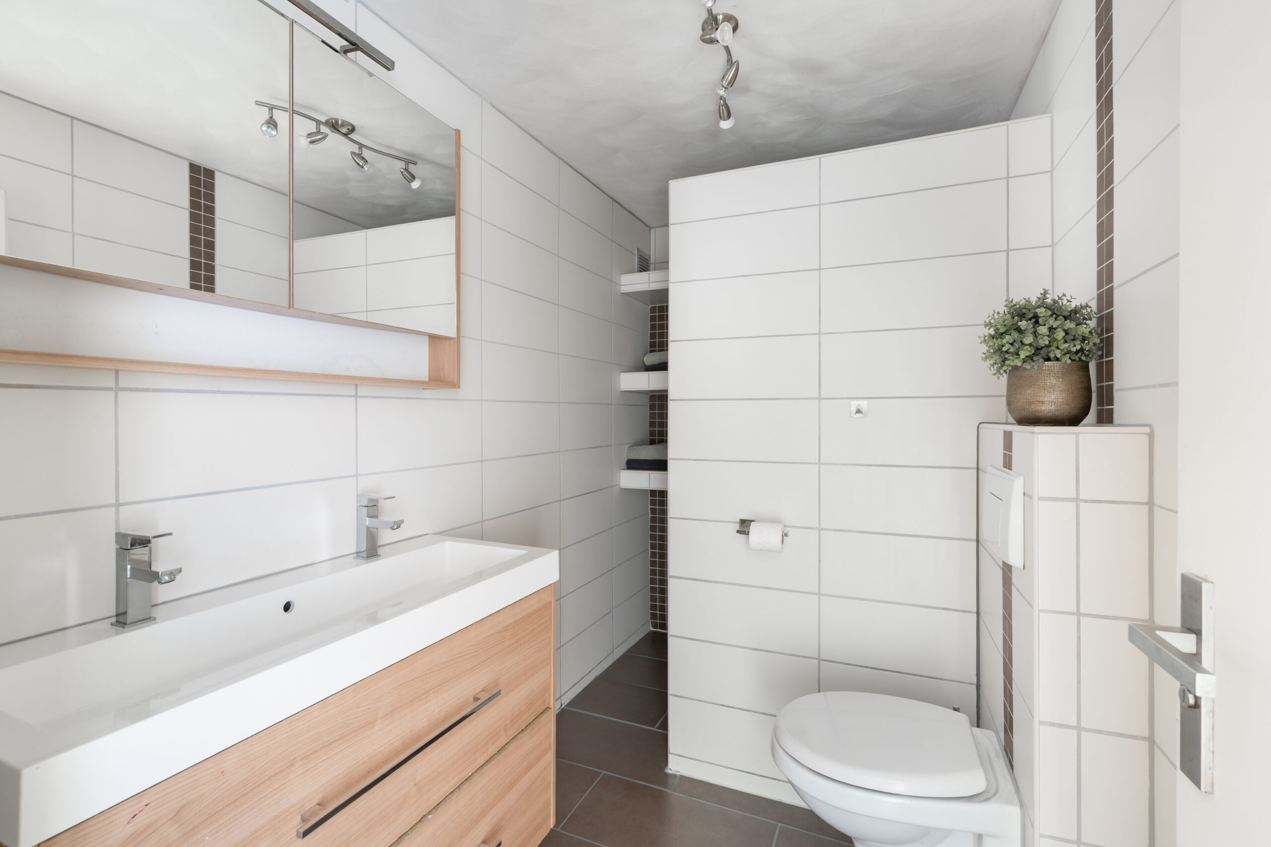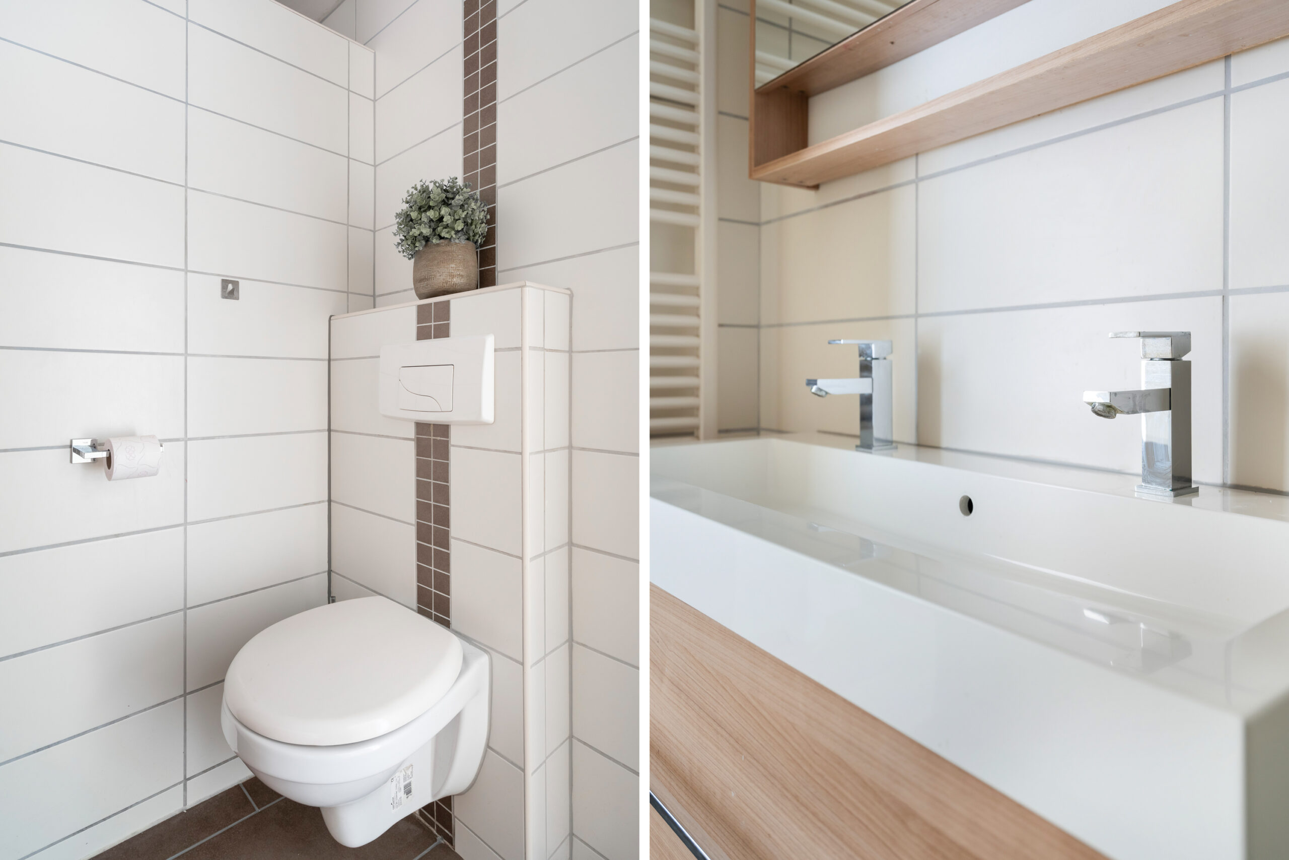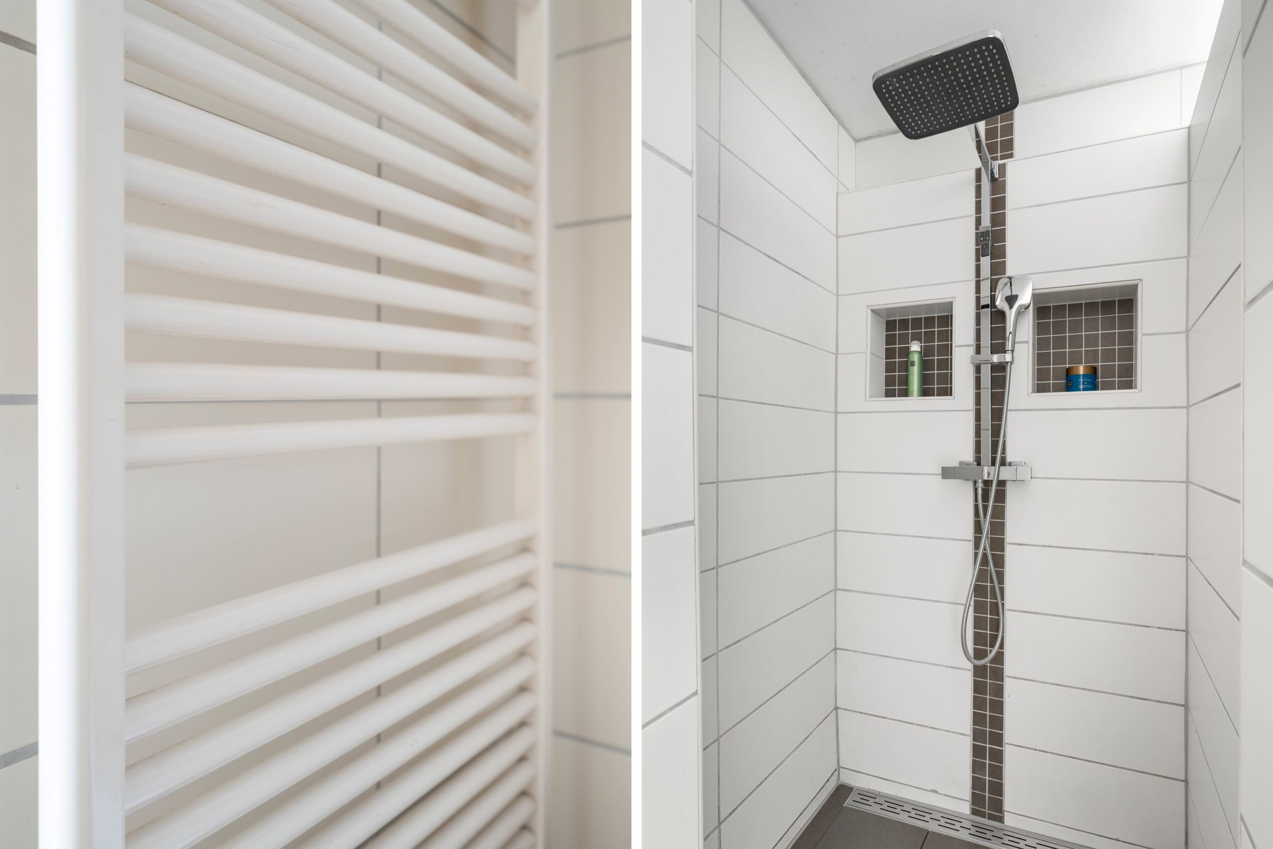 – Badkamer met inloopdouche, 2e toilet, wastafelmeubel en design radiator