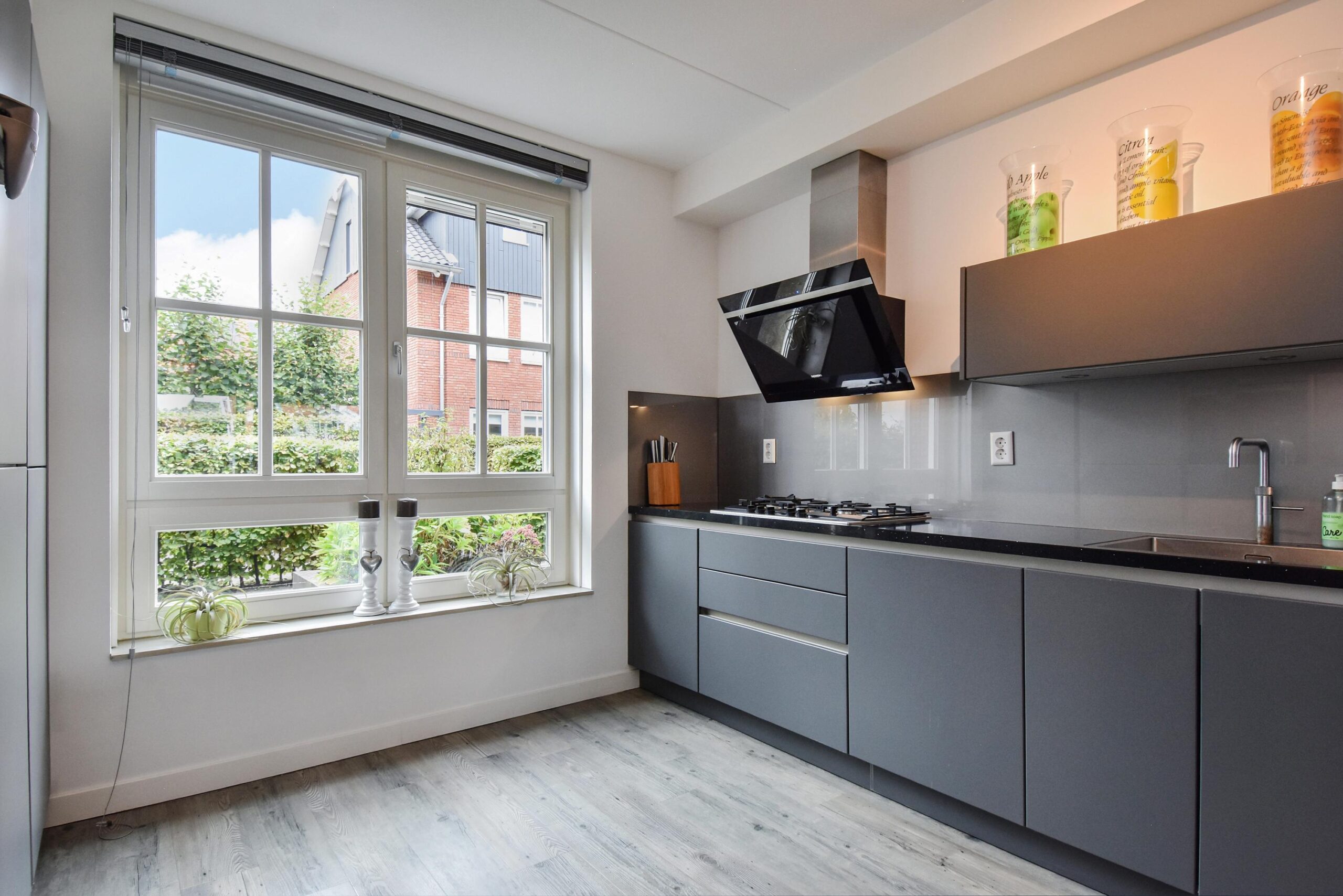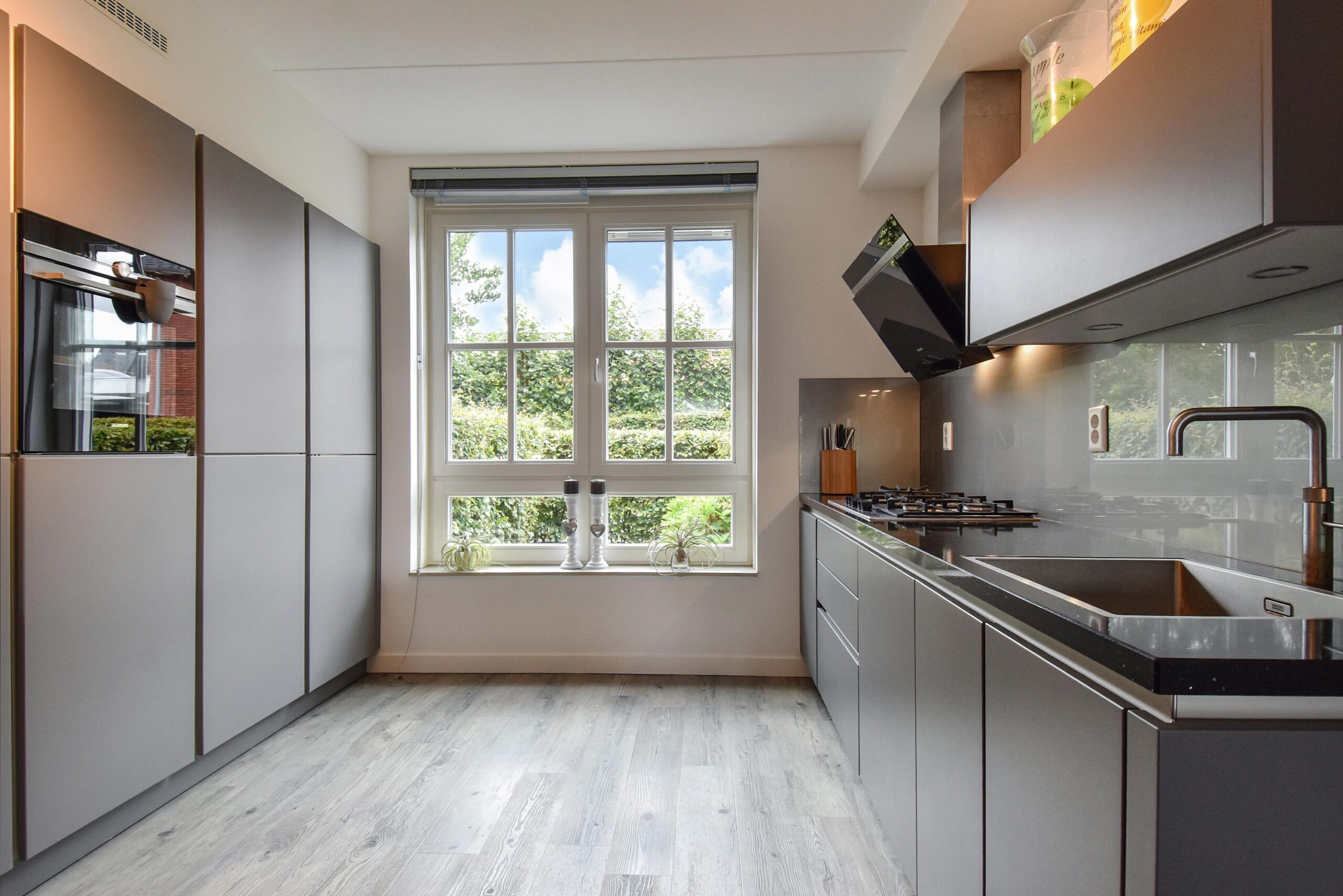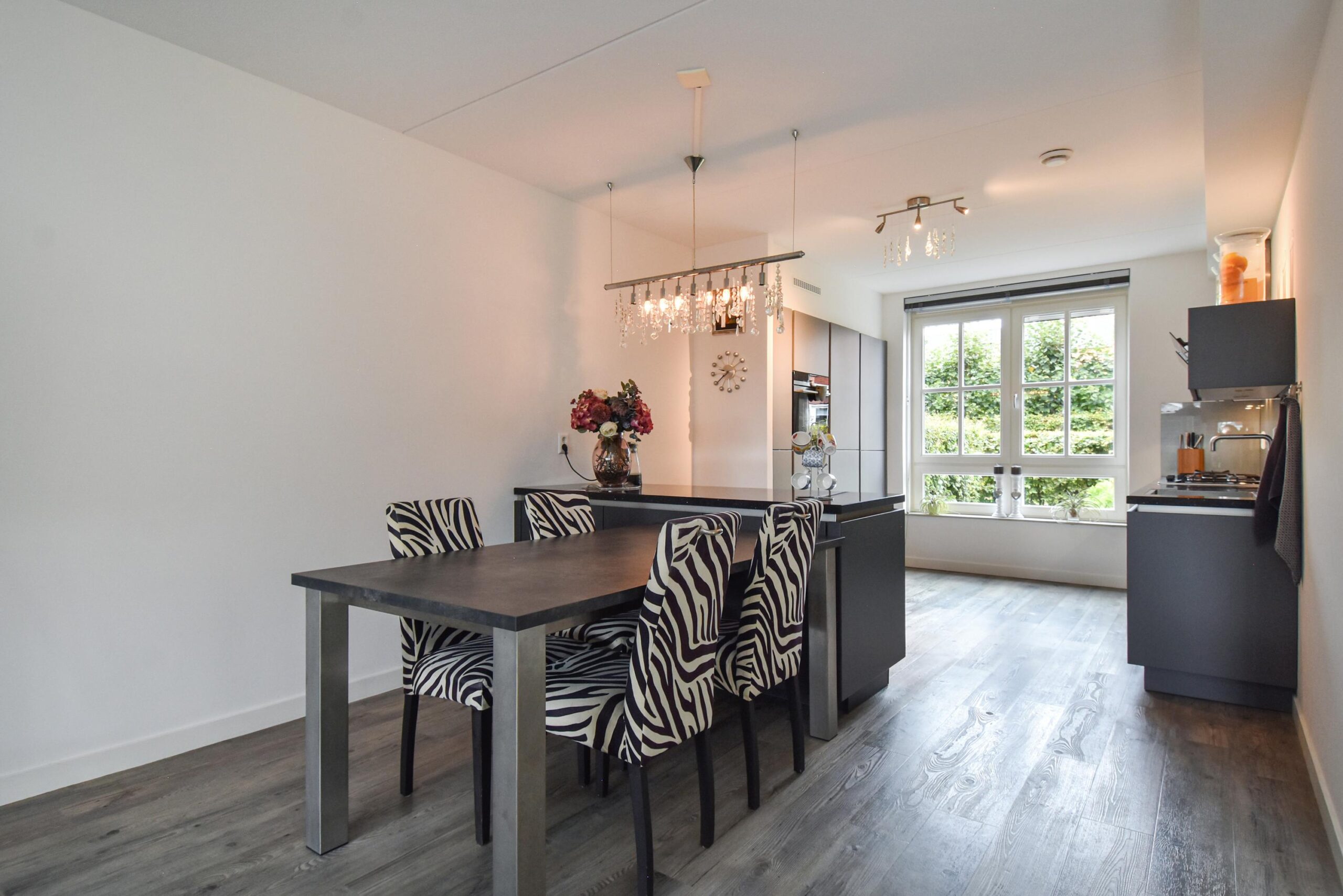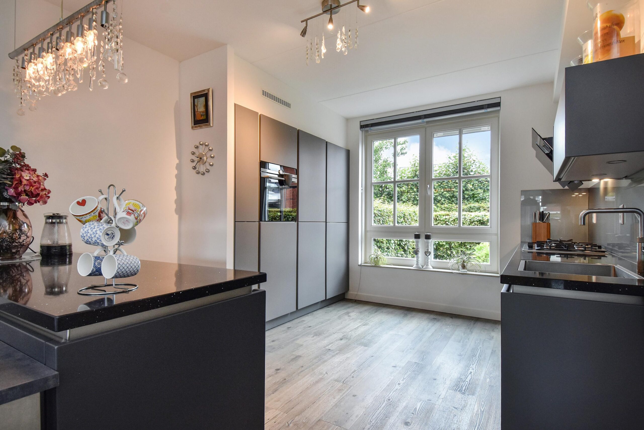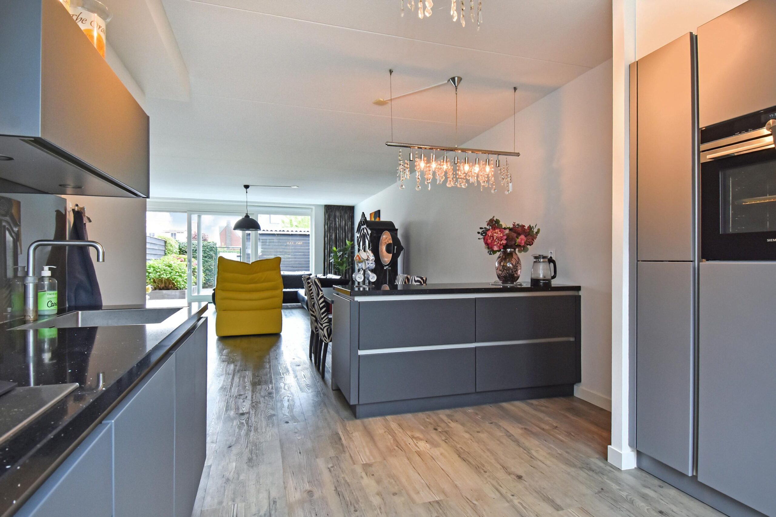 – woonkeuken met uitgebreide inbouwapparatuur en extra aanrecht voorzien van diepe keukenladen.