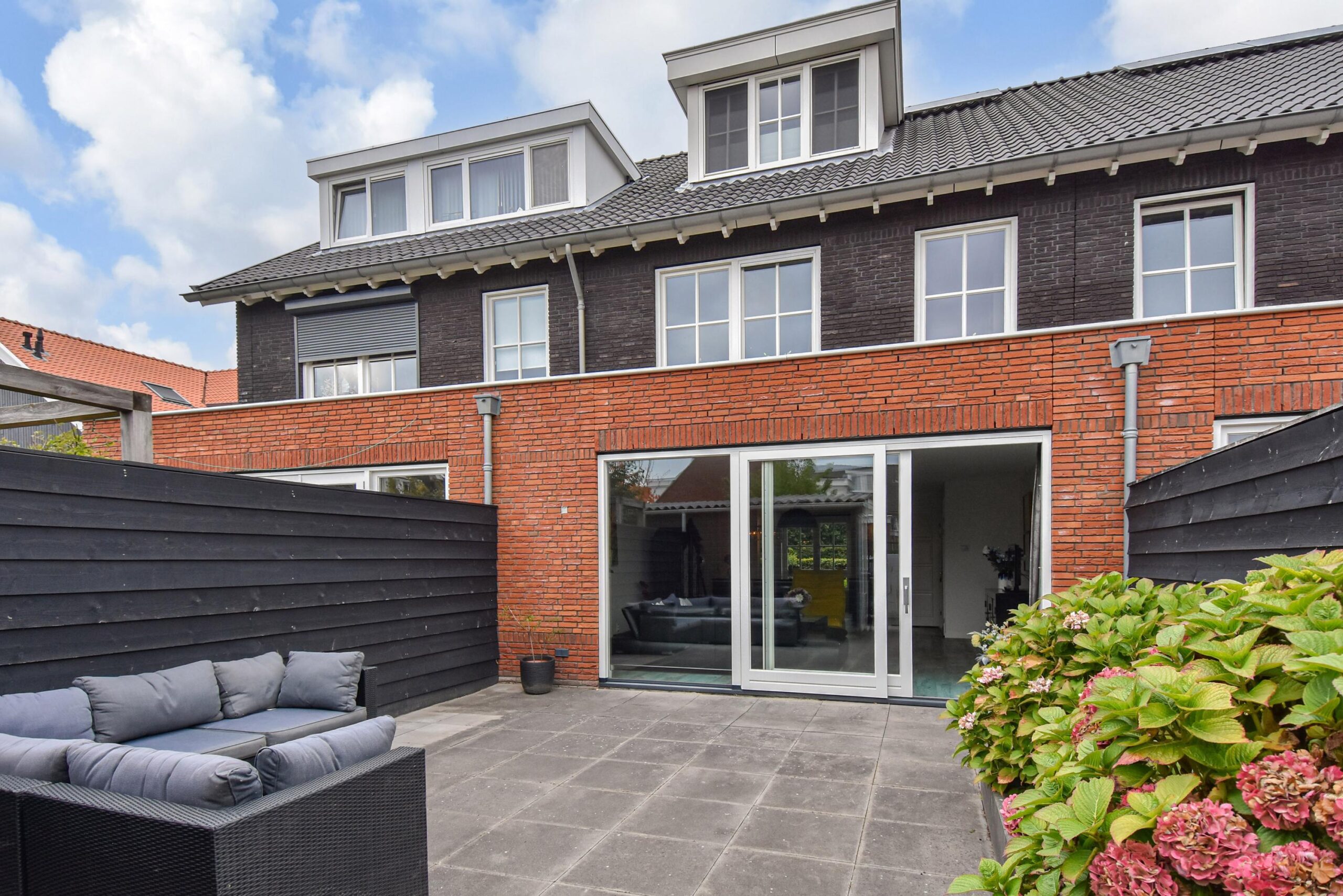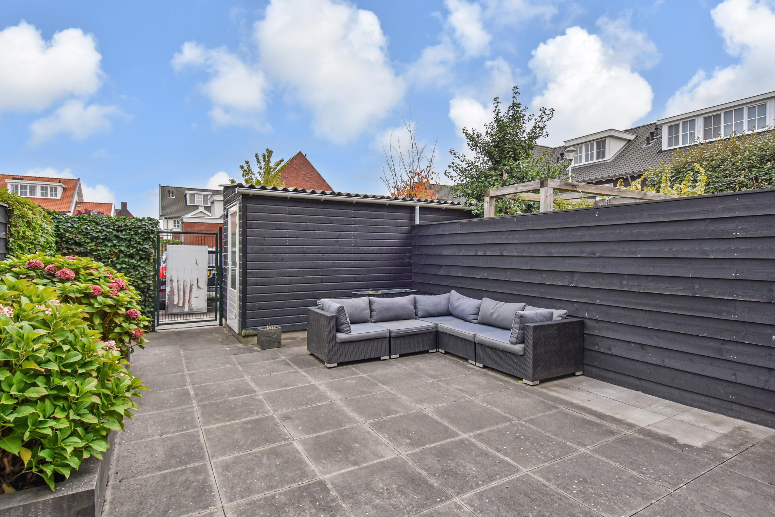 Tuin op het Zuiden met buitenkraan, elektra, berging, achterom.