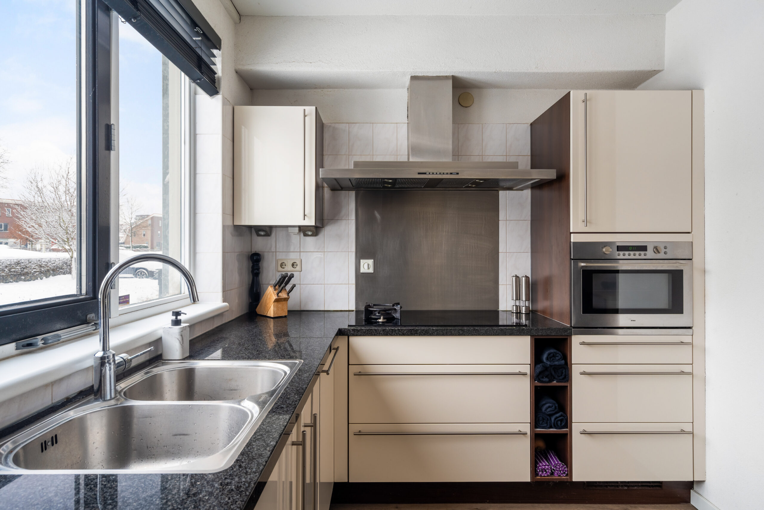 – Open keuken aan de voorzijde met apparatuur zoals koelkast, vriezer, vaatwasser, inductie kookplaat gecombineerd met een wok brander, afzuigkap, combi-oven, afgewerkt met composiet werkbladen