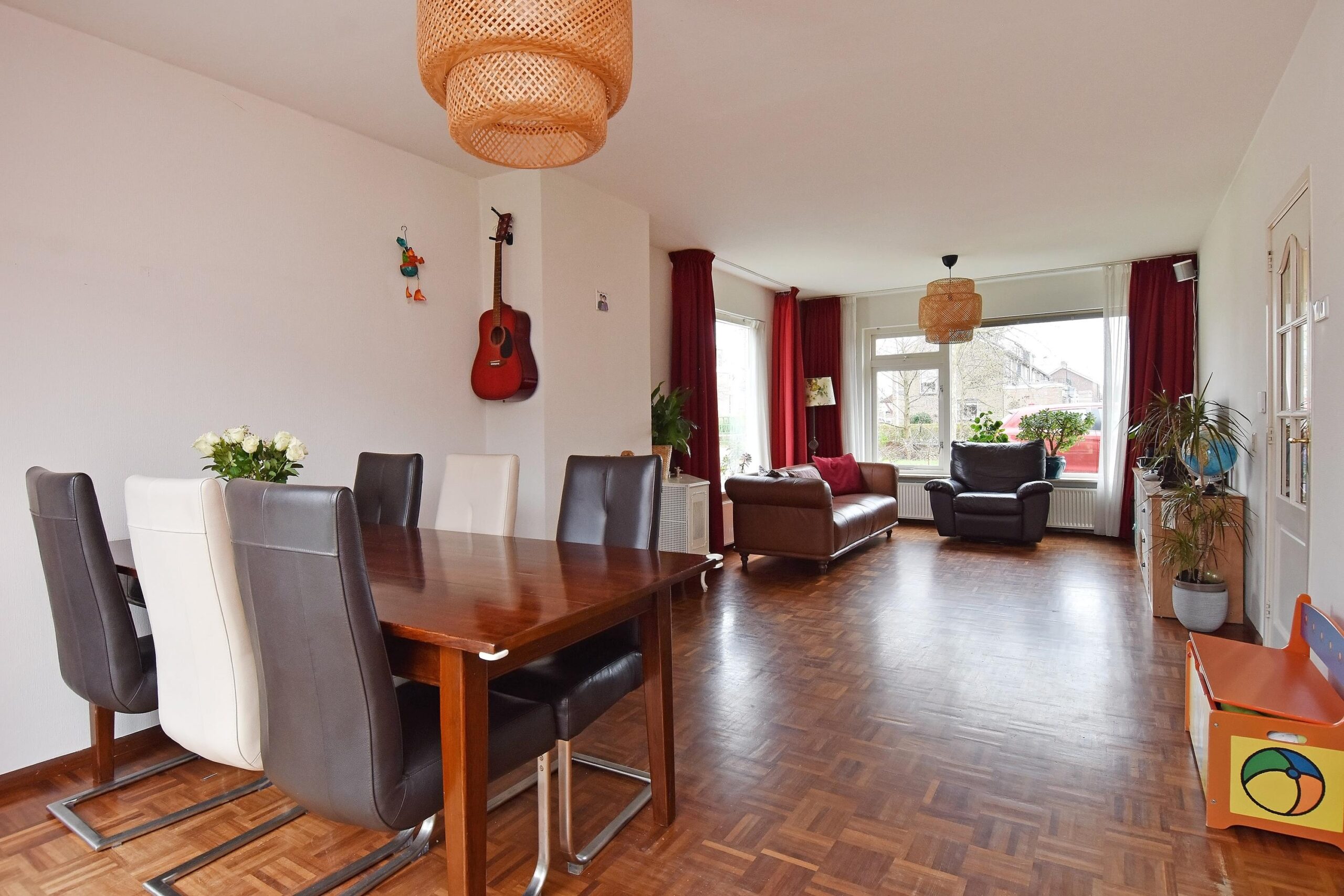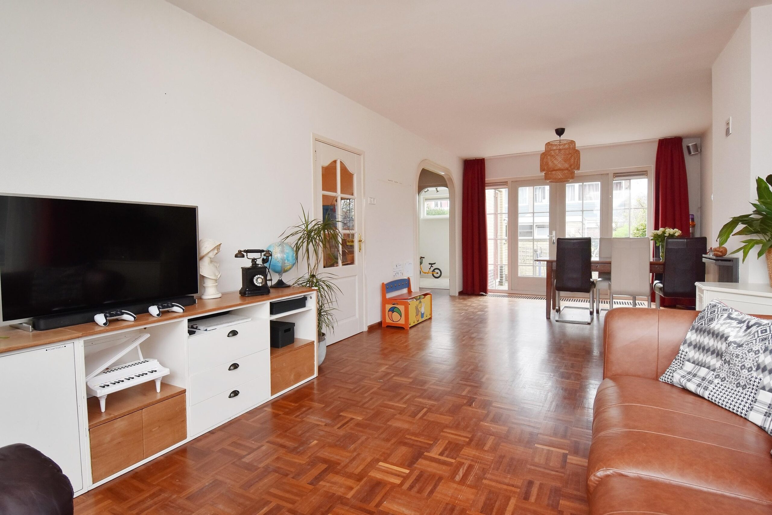 Binnenkomst via de hal met meterkast, toiletruimte en trapkast. De doorzon woonkamer valt direct op door de grote ramen en het vele daglicht, met openslaande deuren naar de tuin.