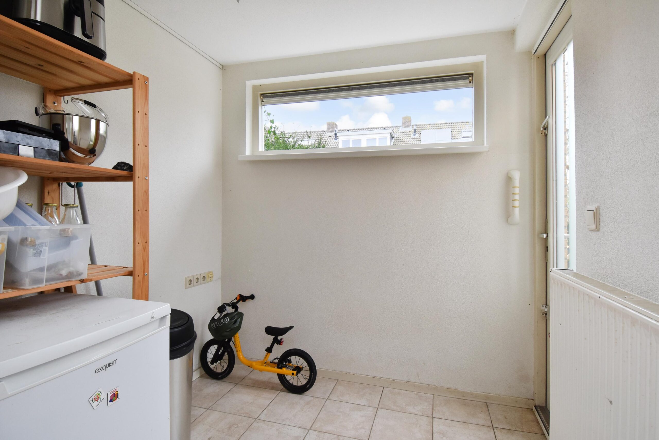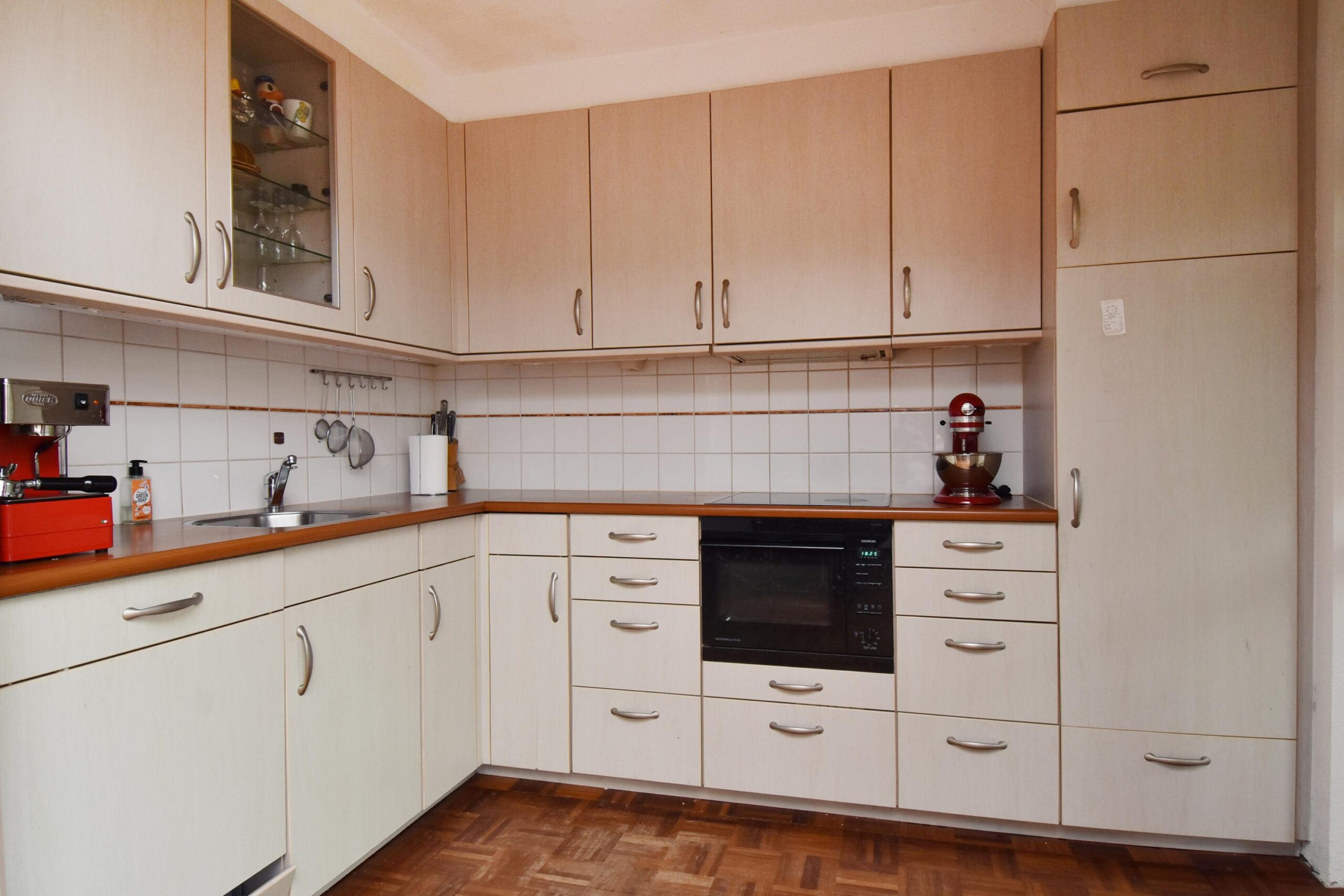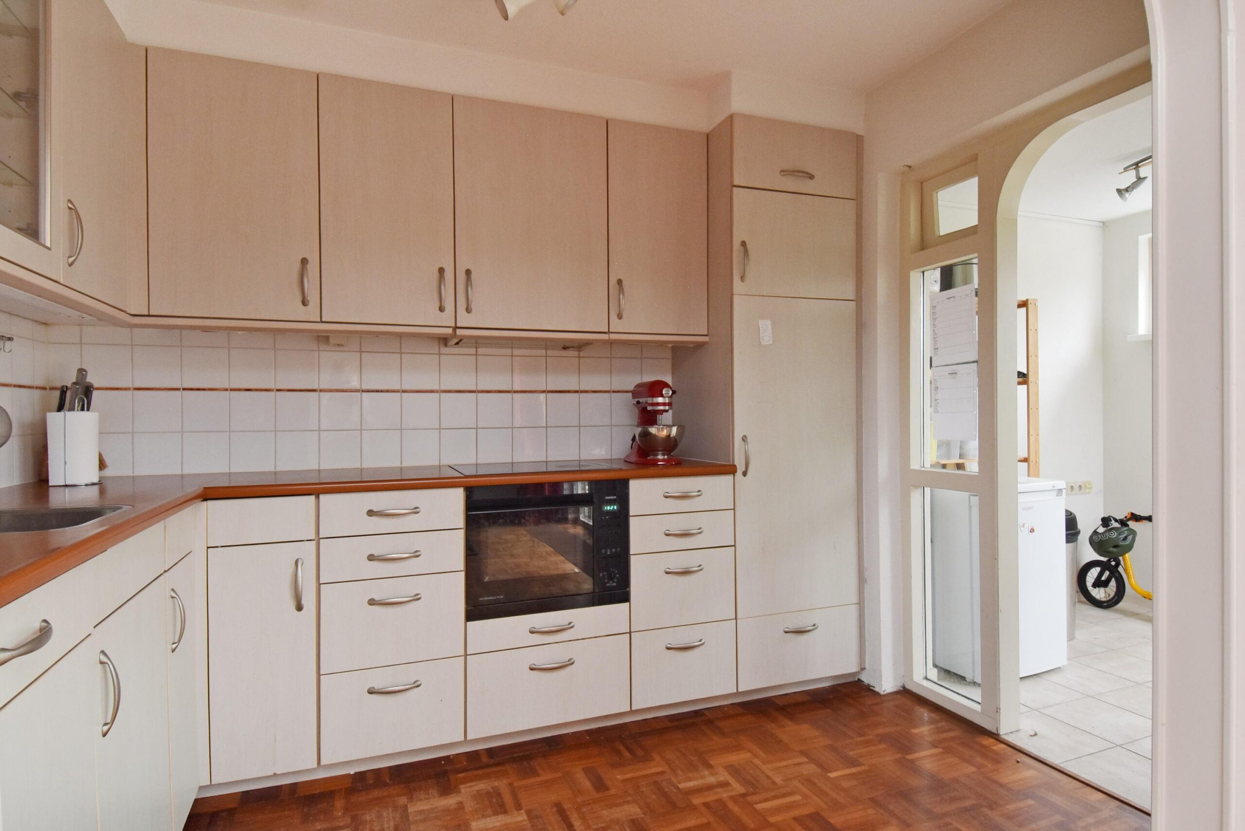 De open keuken sluit naadloos aan en biedt toegang tot een praktische bijkeuken met extra bergruimte en een deur naar buiten.