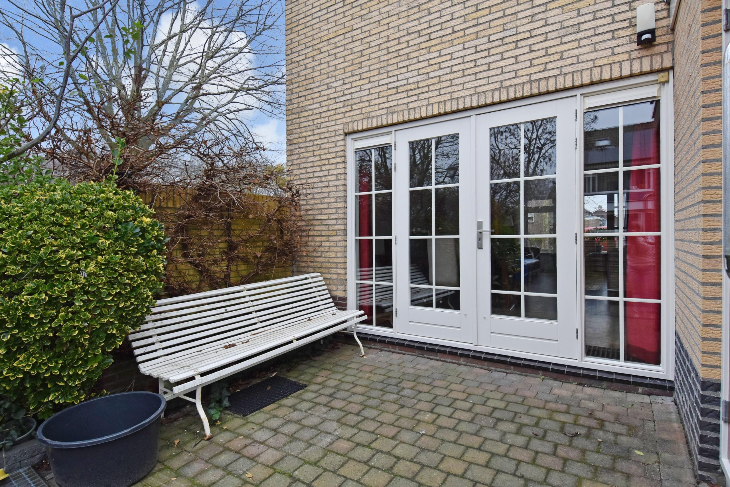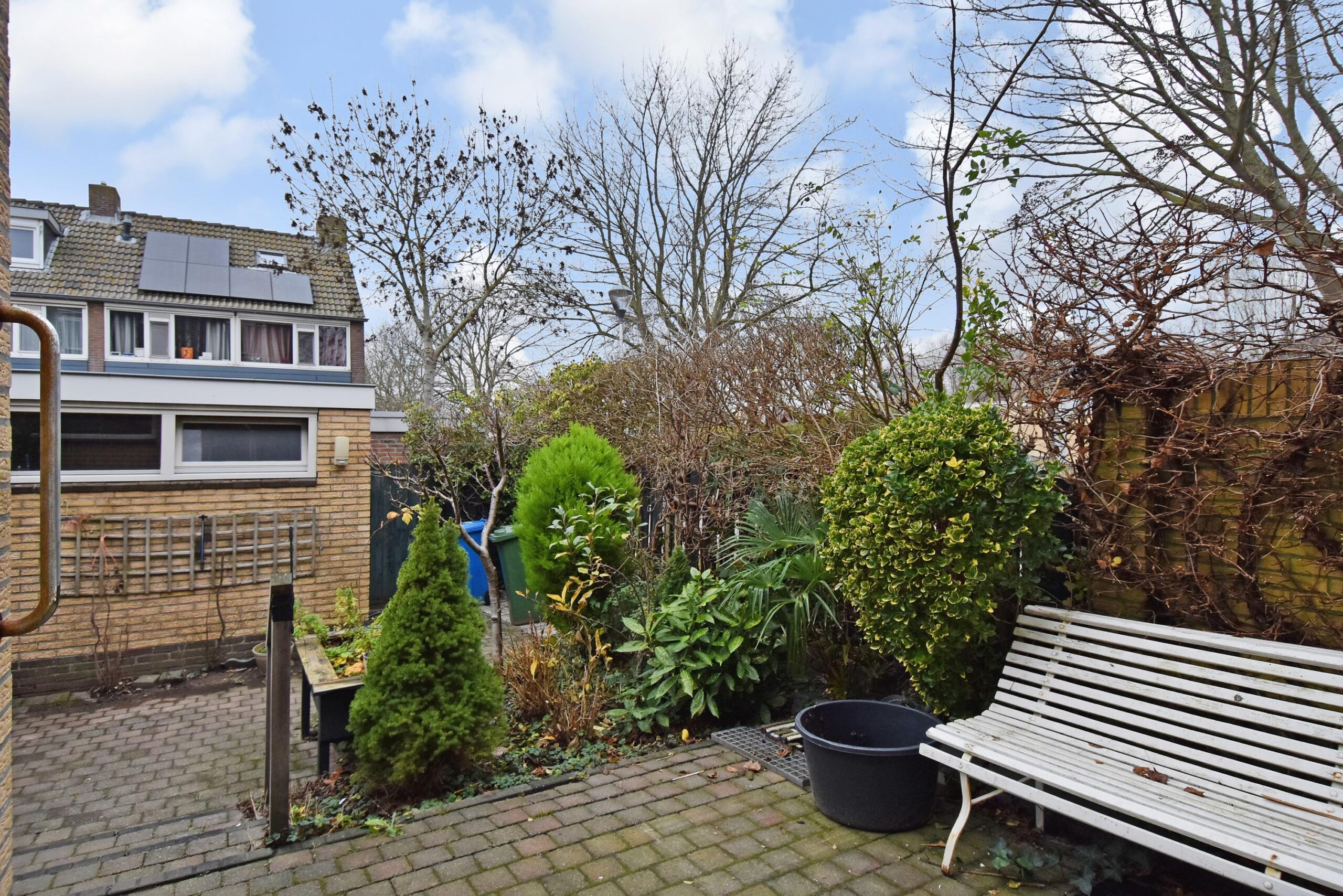 De achtertuin is aangelegd met sierbestrating en groen, en beschikt over een stenen berging met elektra.