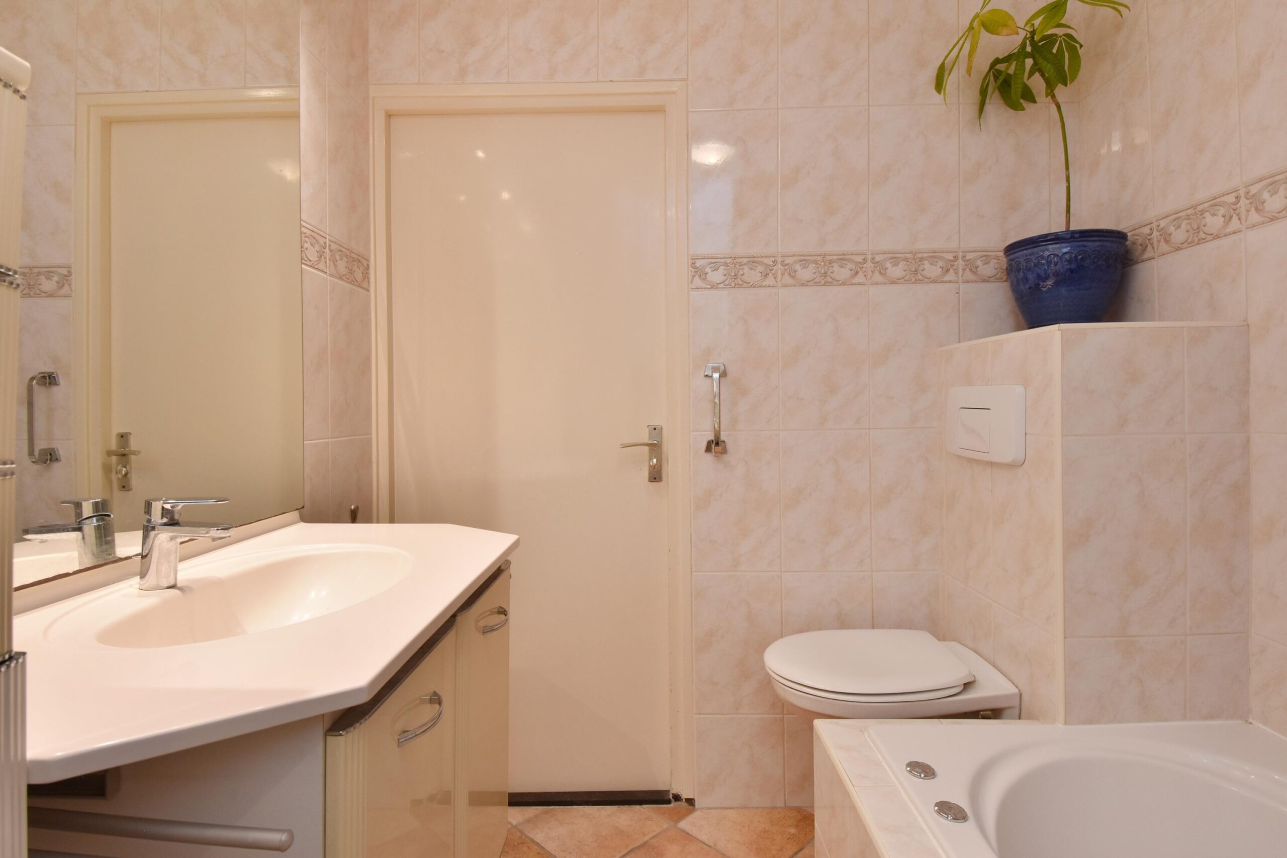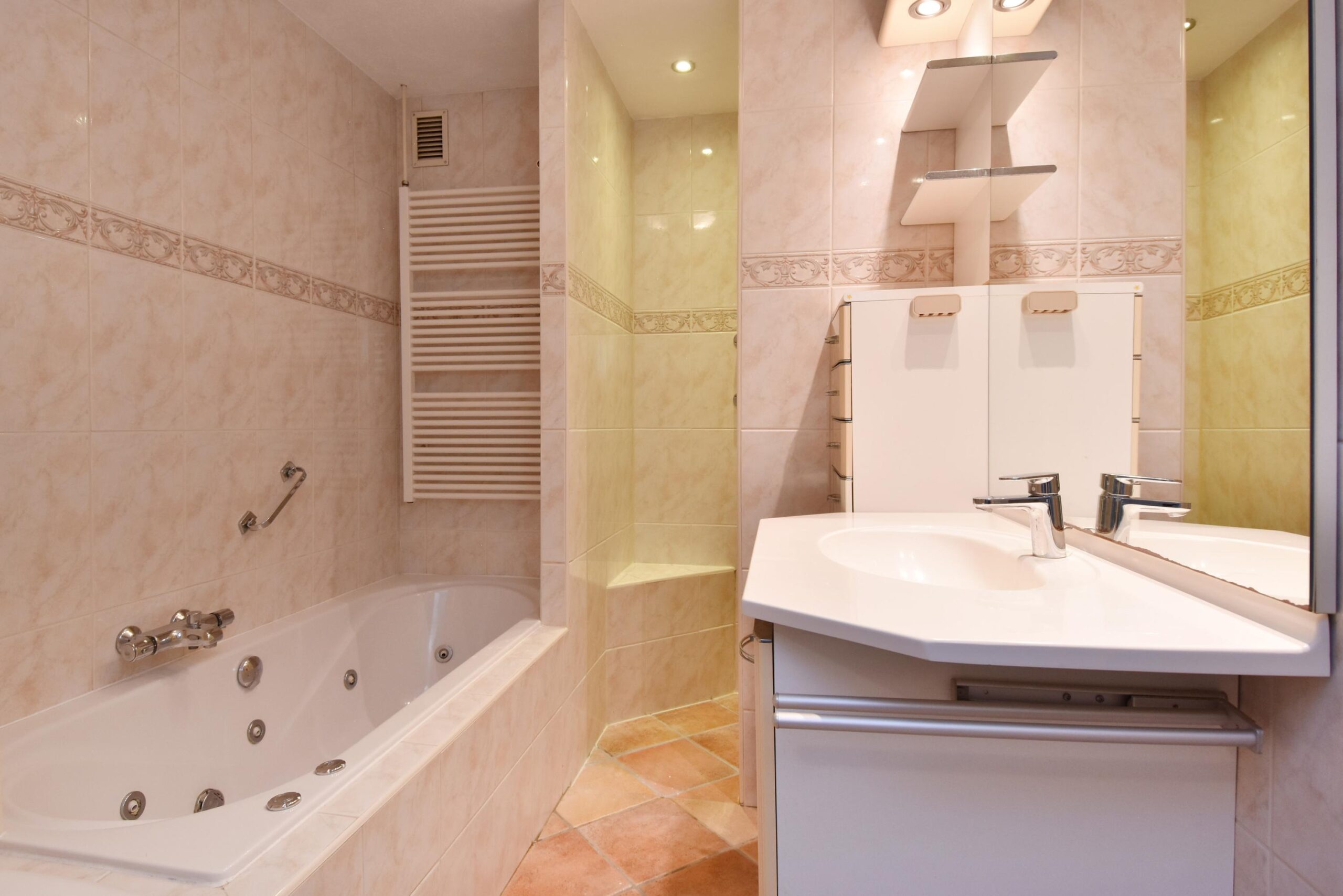 De badkamer is uitgerust met whirlpool, inloopdouche, toilet, wastafelmeubel en vloerverwarming.