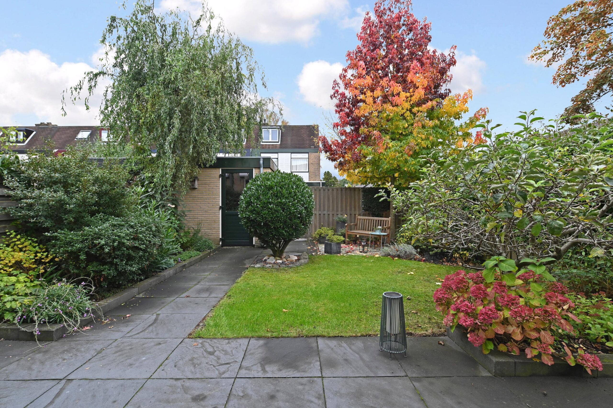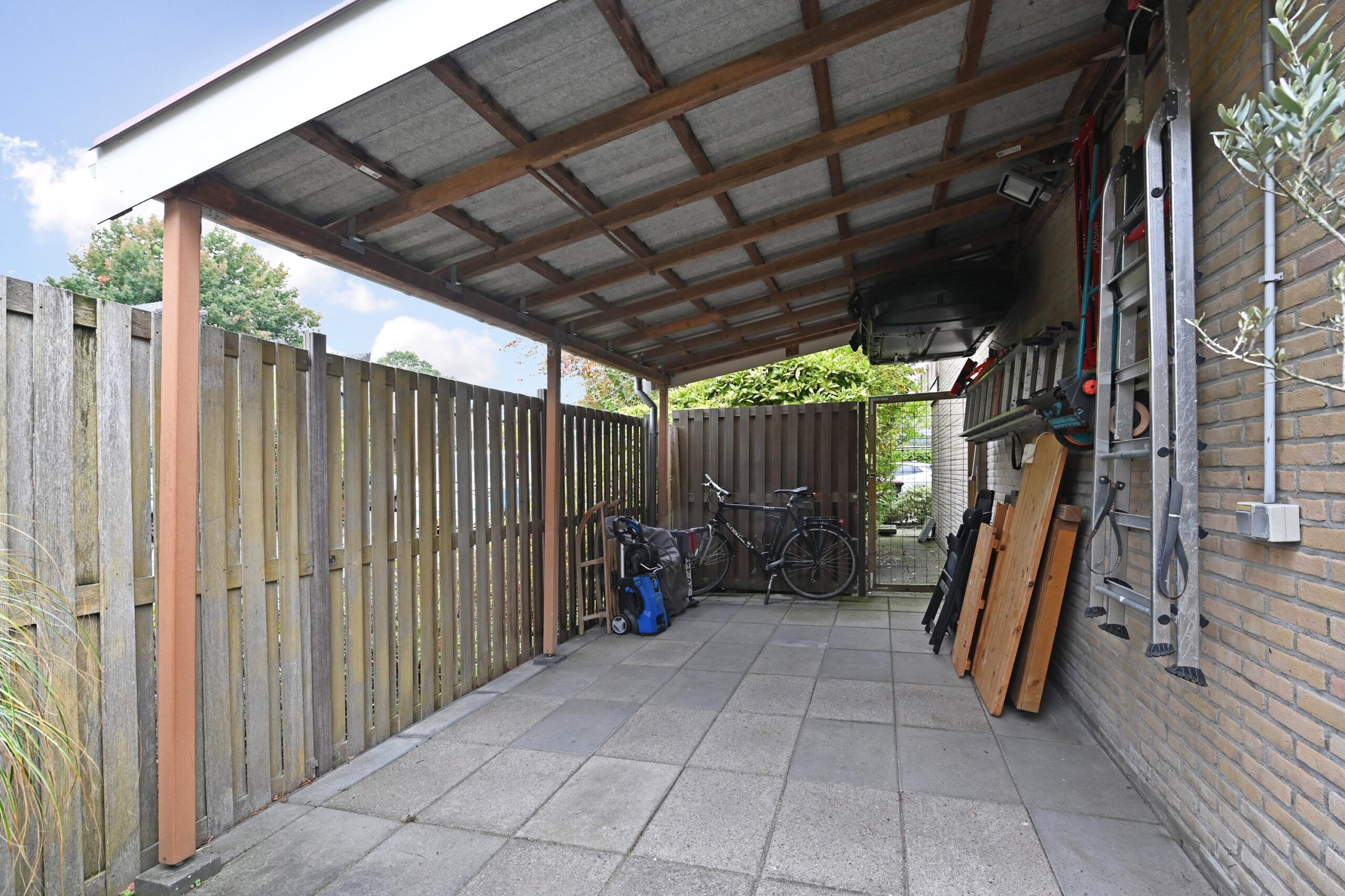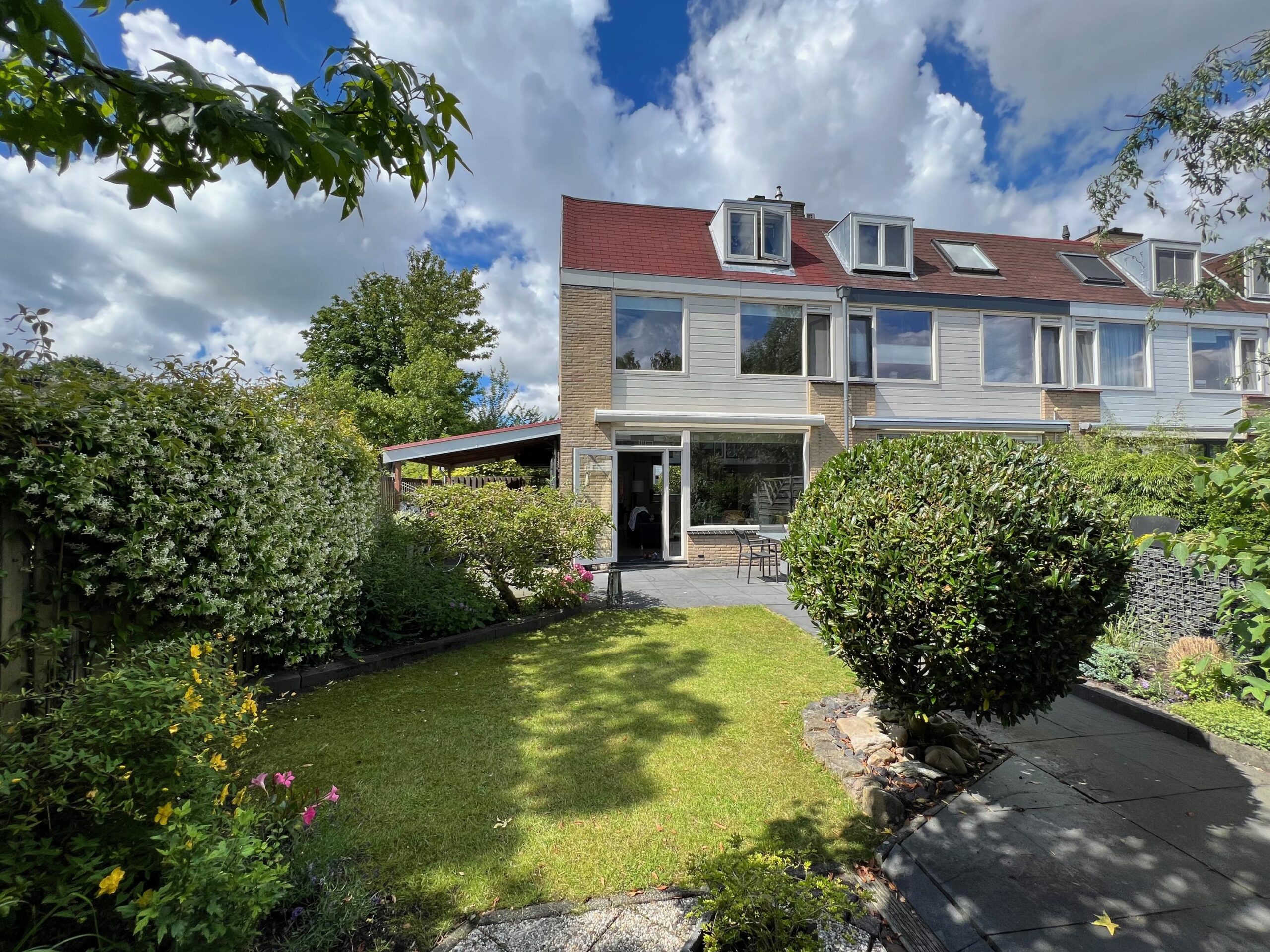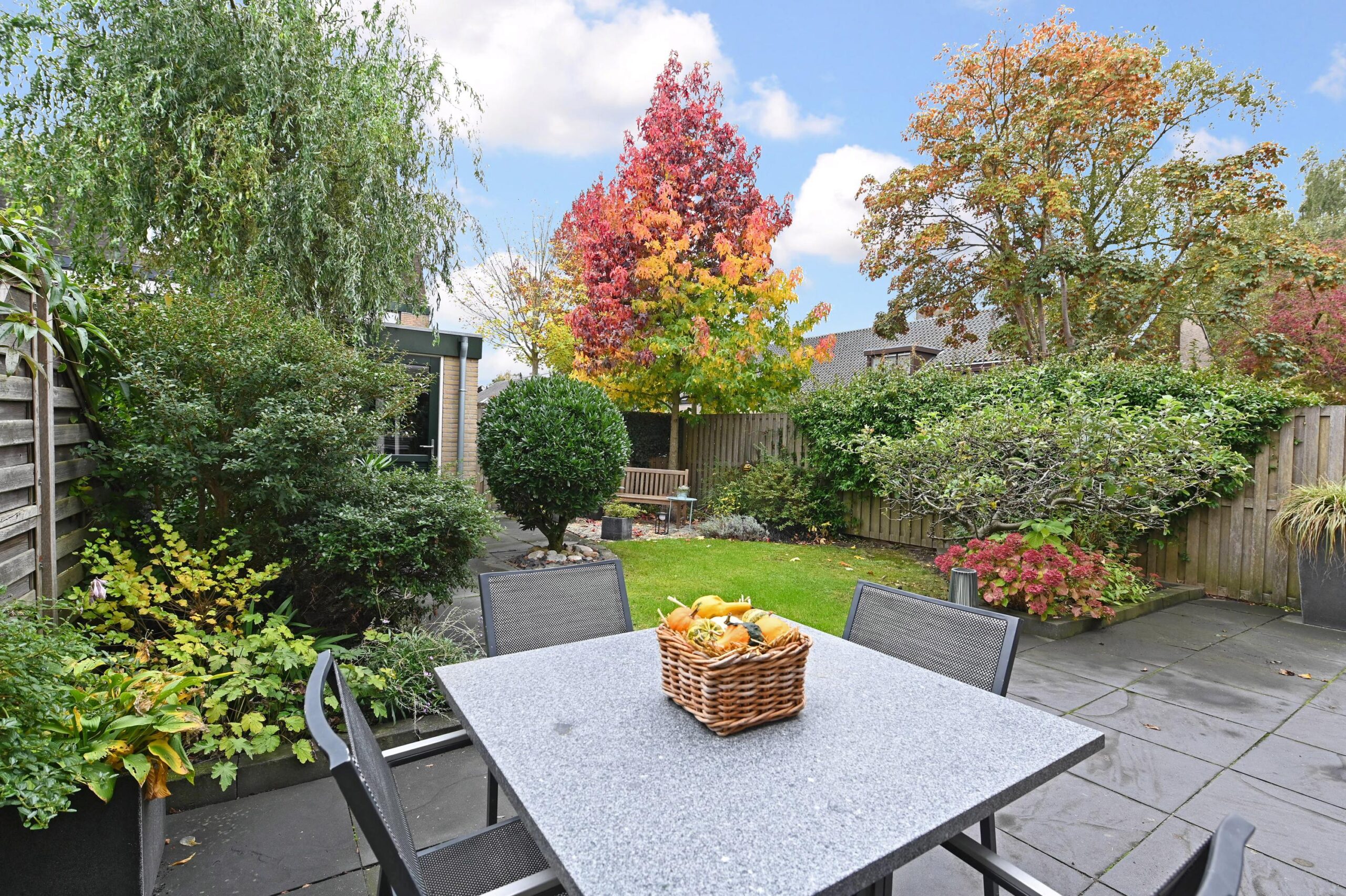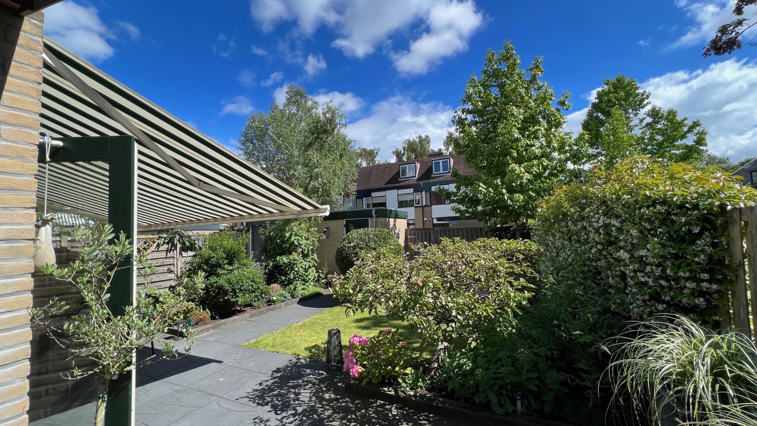 Fraai aangelegde, grote achtertuin op het Zuiden met overkapping aan de zijkant.