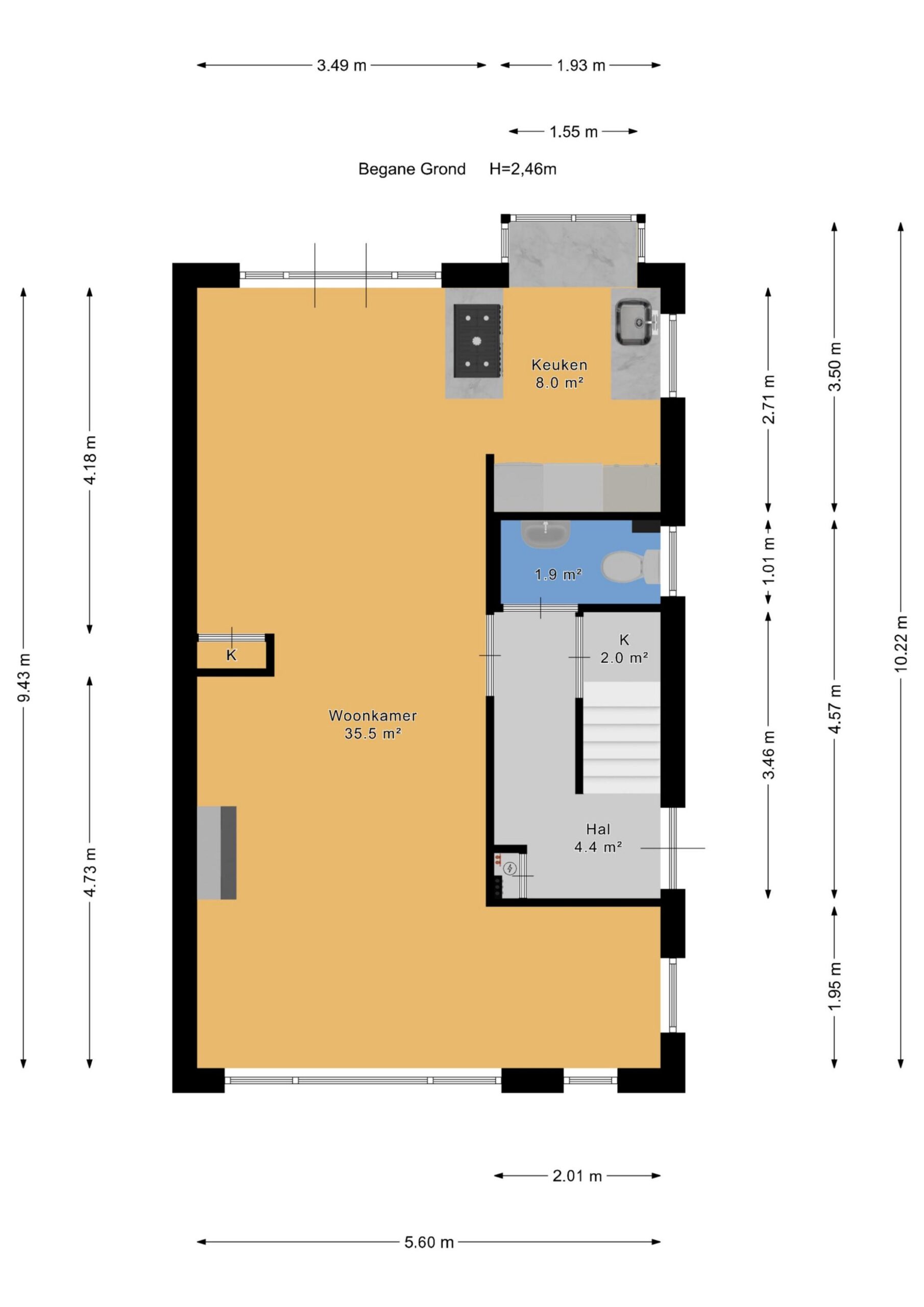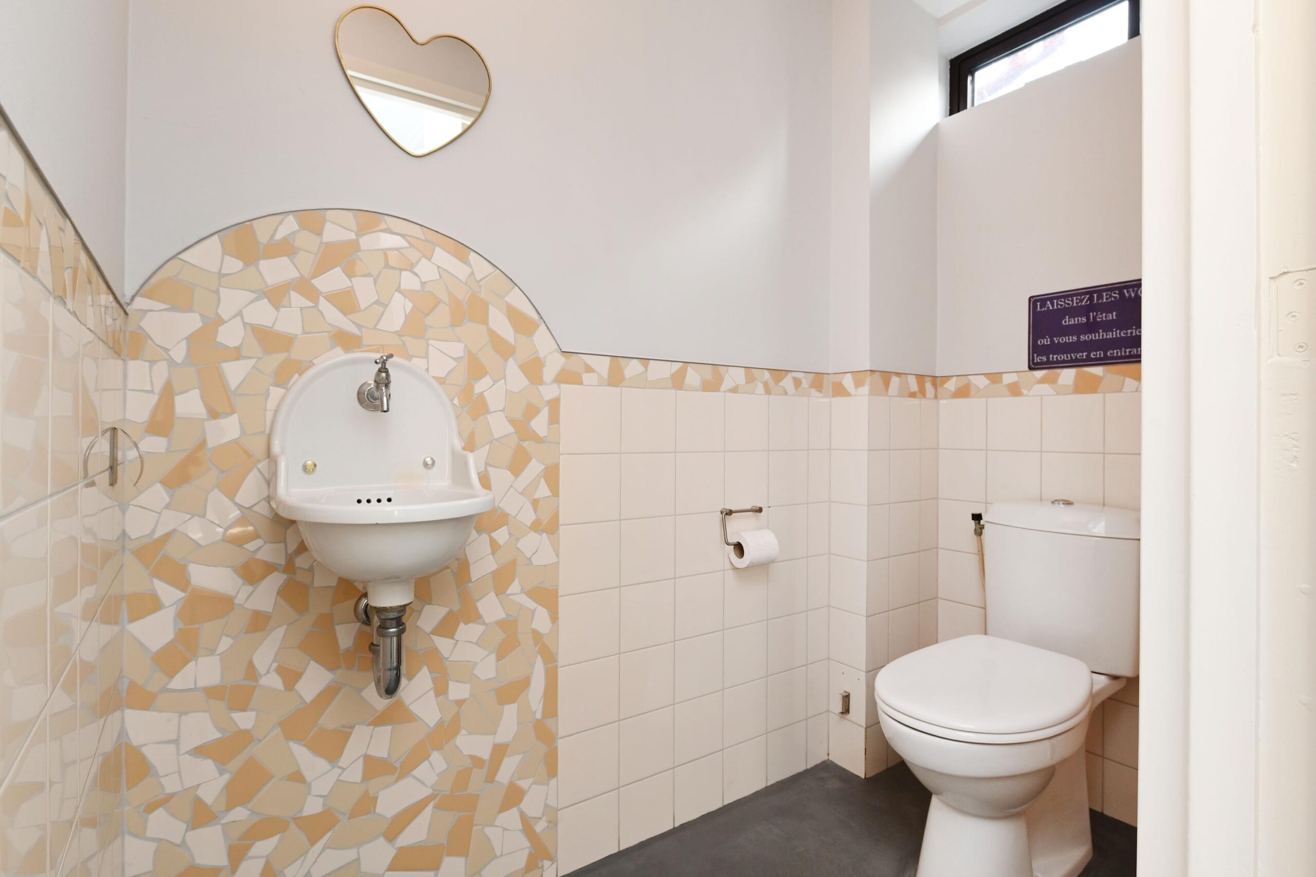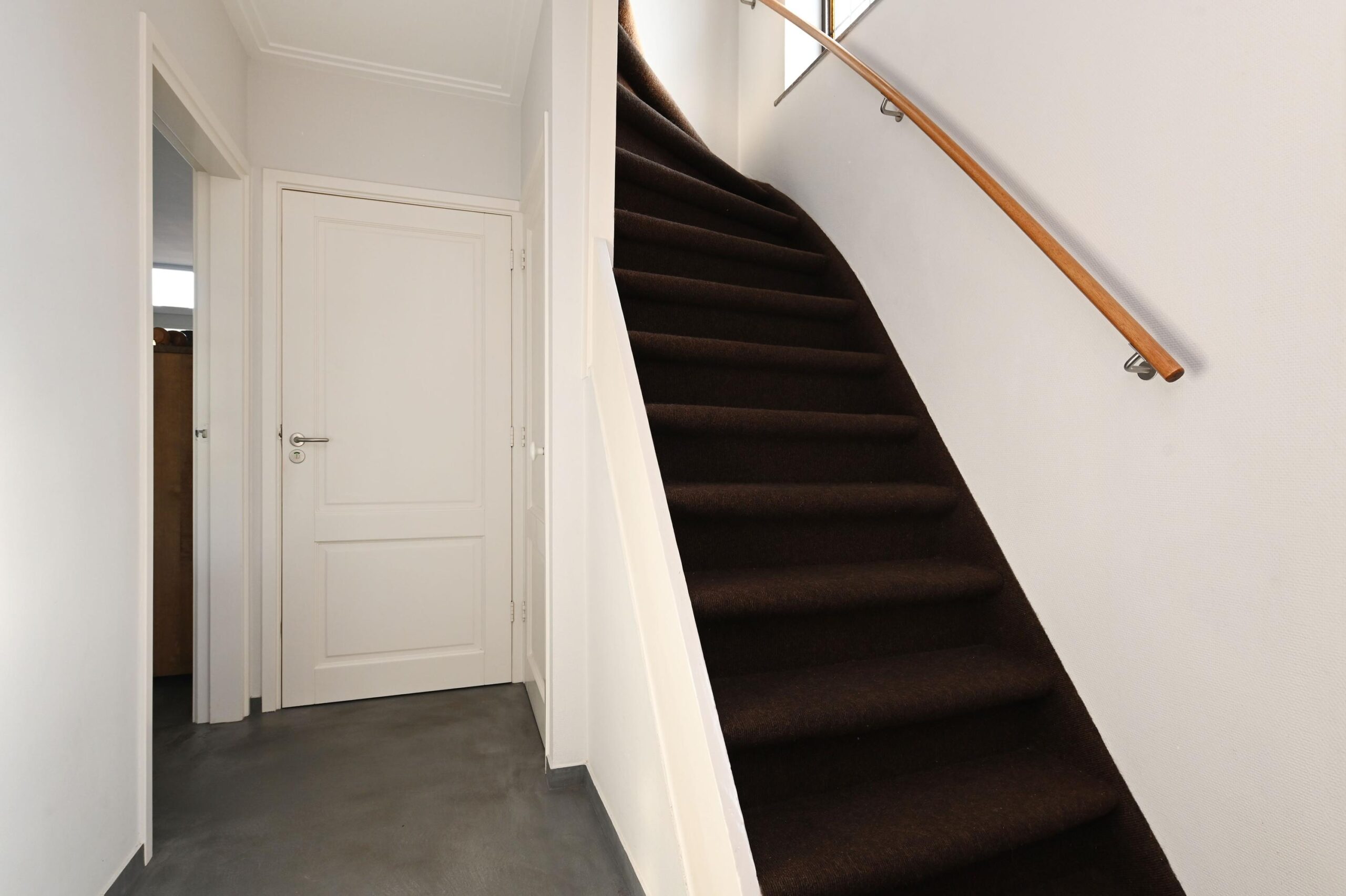 Hal: hal met originele voordeur. In de hal de vernieuwde meterkast, trapopgang naar slaapverdieping, kelderkast onder de trap en een ruim toilet met wasbakje.