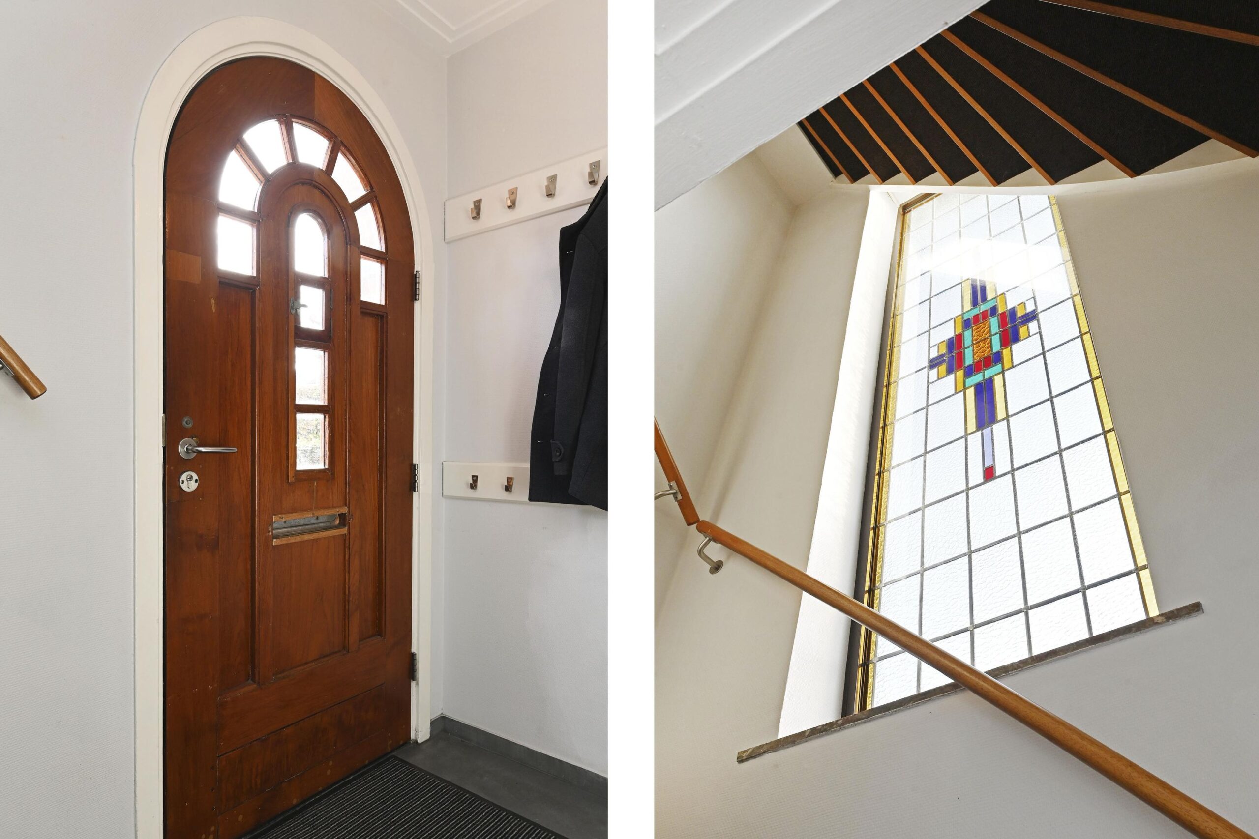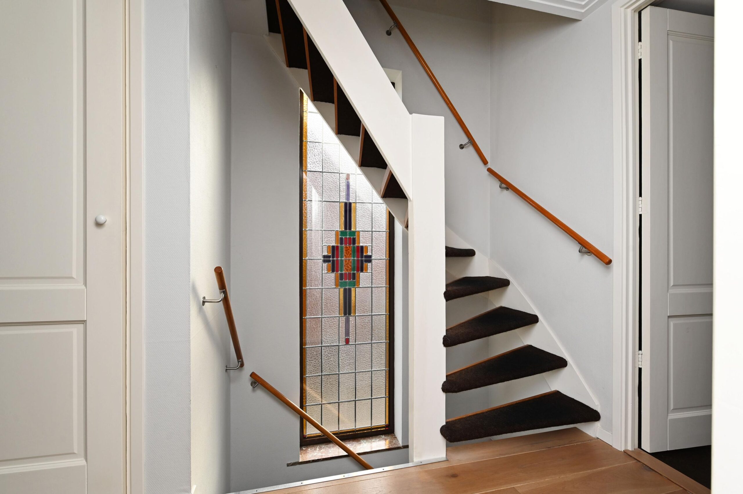 Overloop: de overloop wordt gesierd door het prachtige glas-in-lood raam in de zijgevel. Daarnaast is een aparte kast gemaakt waar nu de wasmachine en droger in staan.