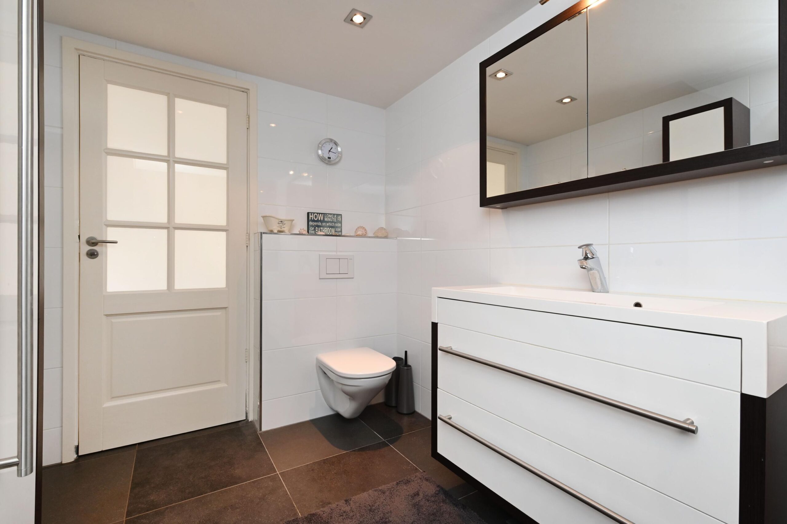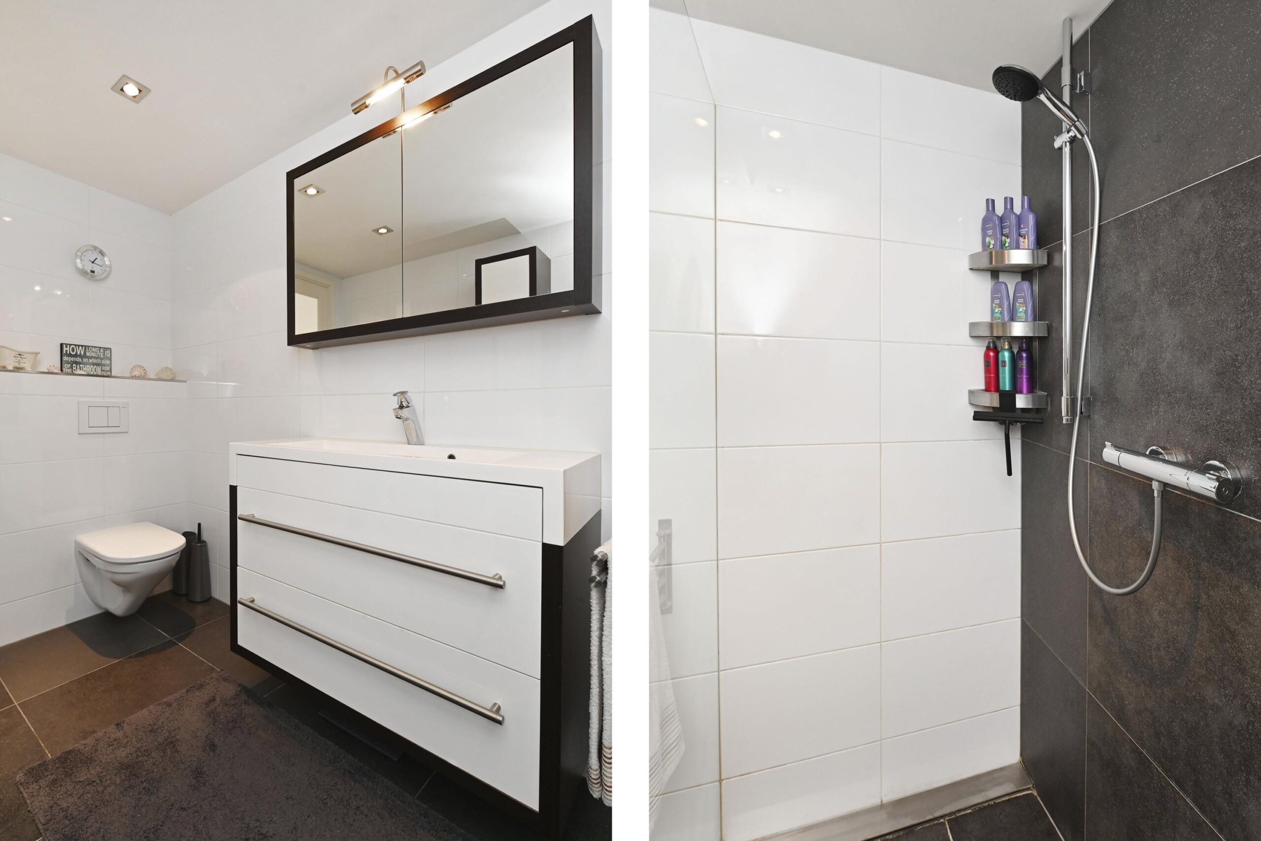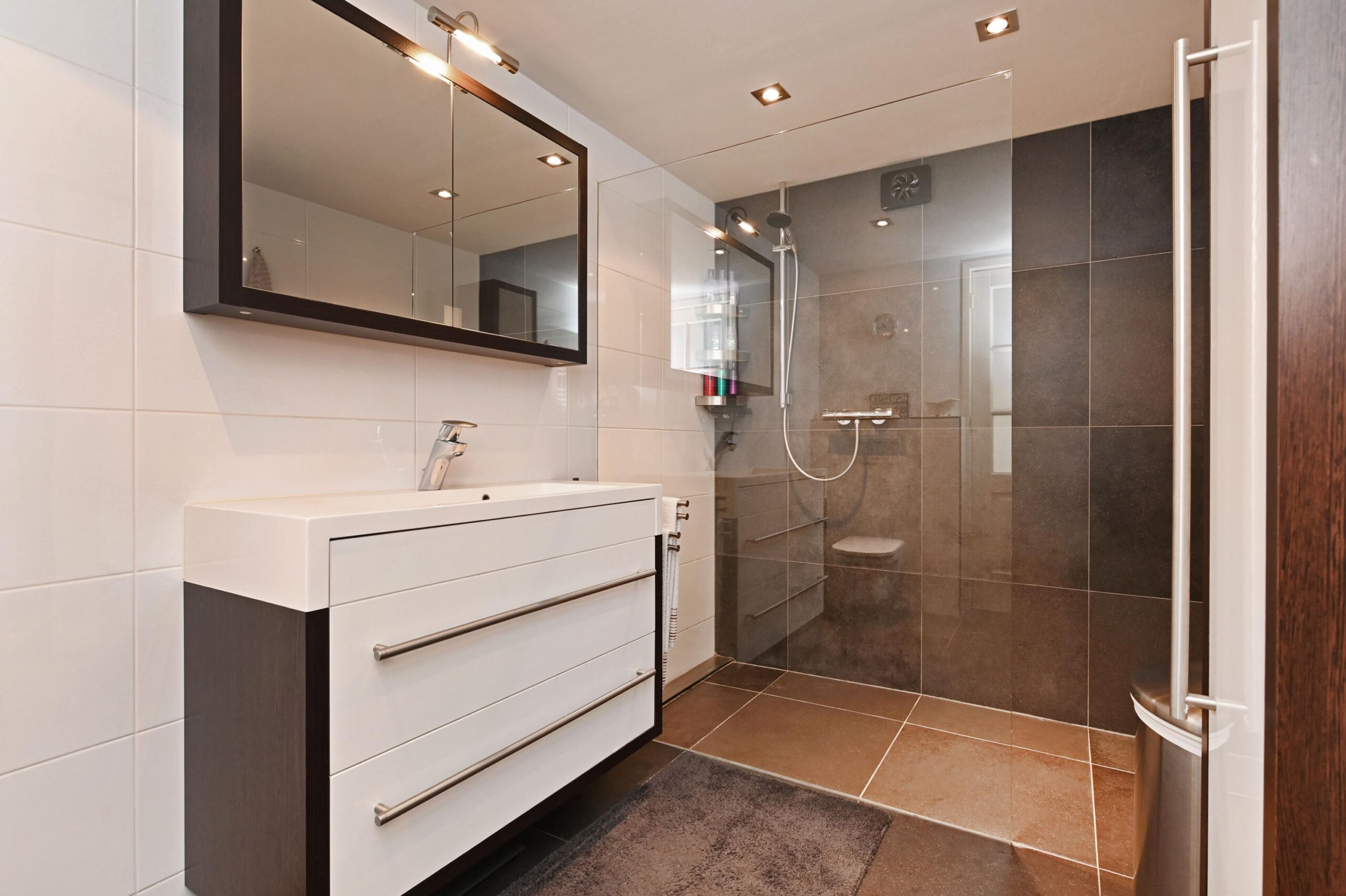 Badkamer: luxe badkamer met inloopdouche, wastafelmeubel, 2e toilet en handdoekenradiator.