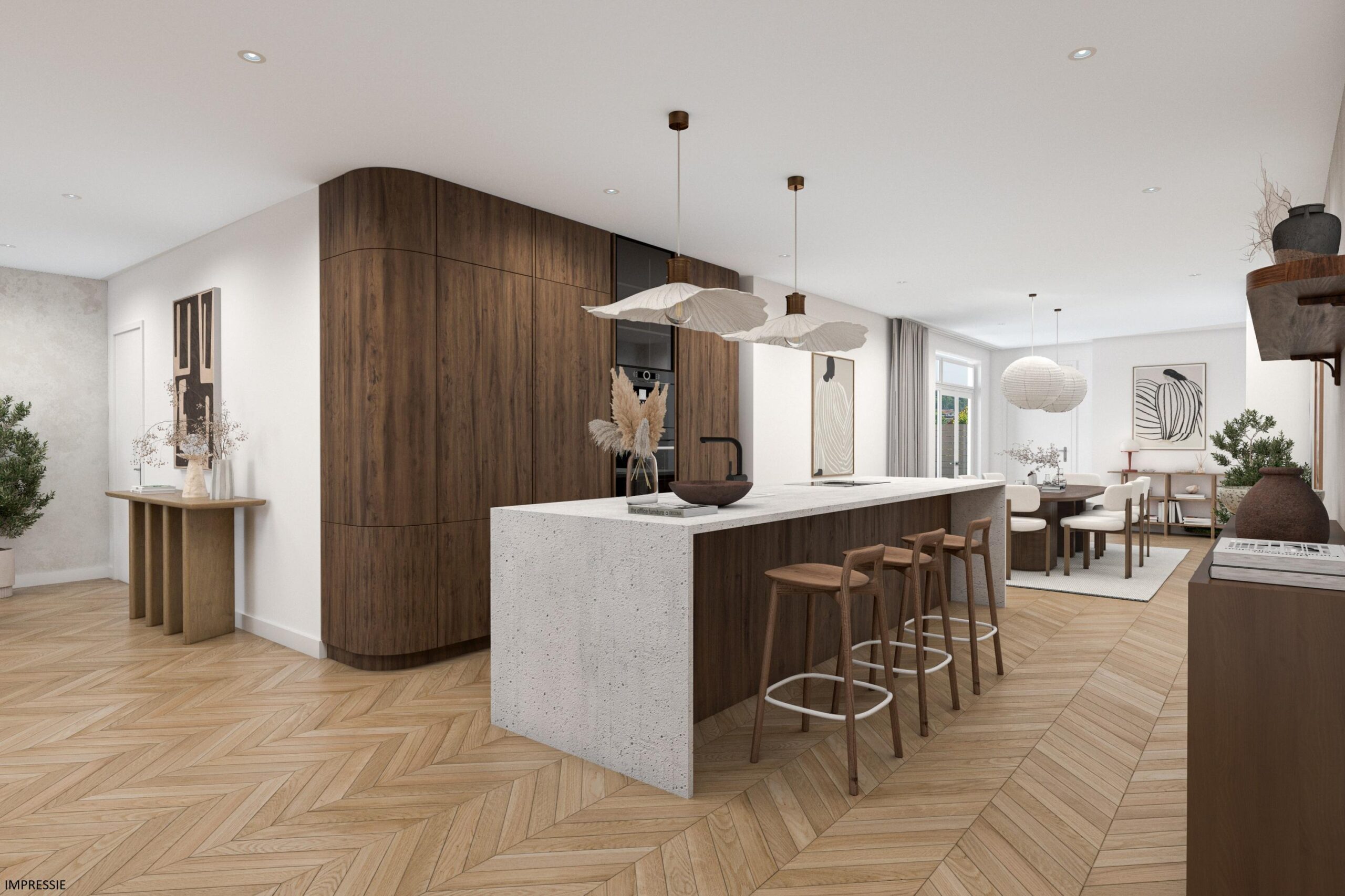 Binnenkomen doe je via de entree met voortuin. Wat direct opvalt: de ruimte. Een grote open indeling waar je echt alle kanten mee op kunt.