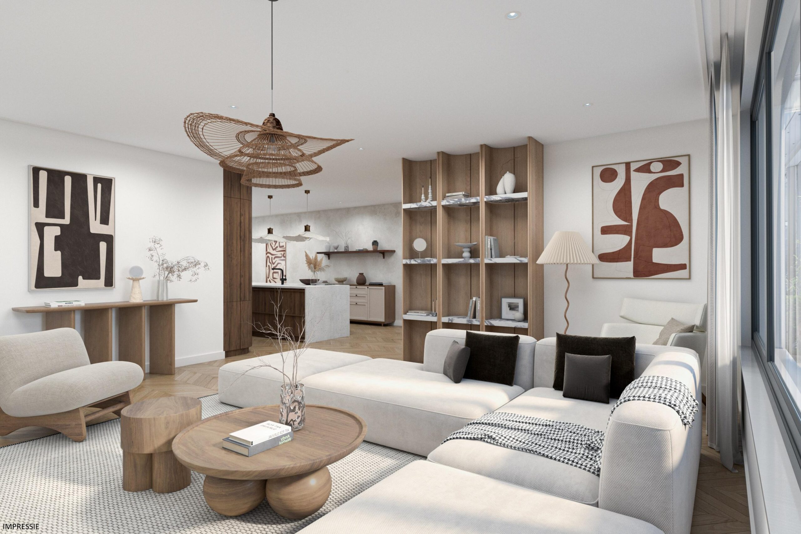 De woonkamer is heerlijk licht en heeft een charmante kamer-en-suite indeling.