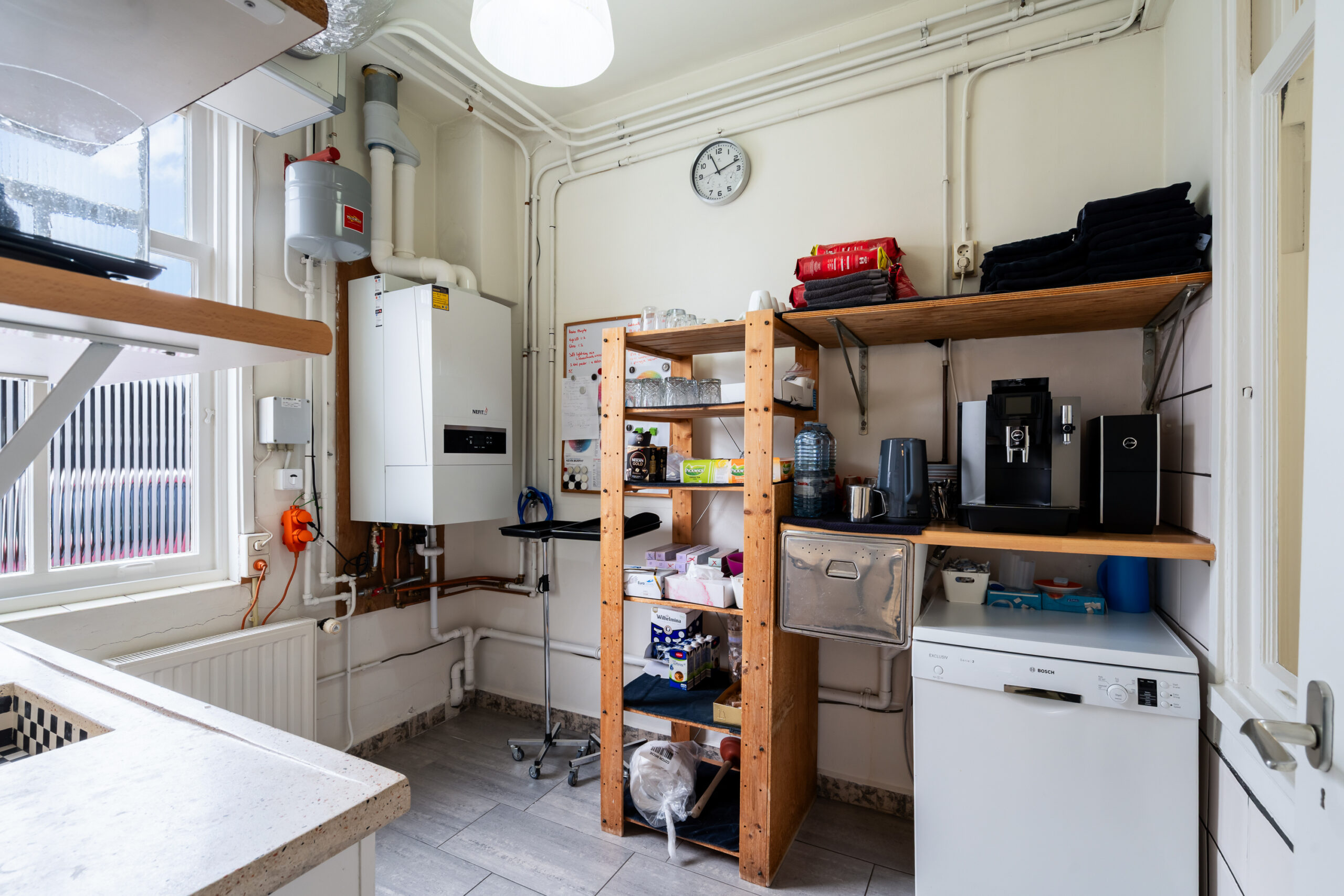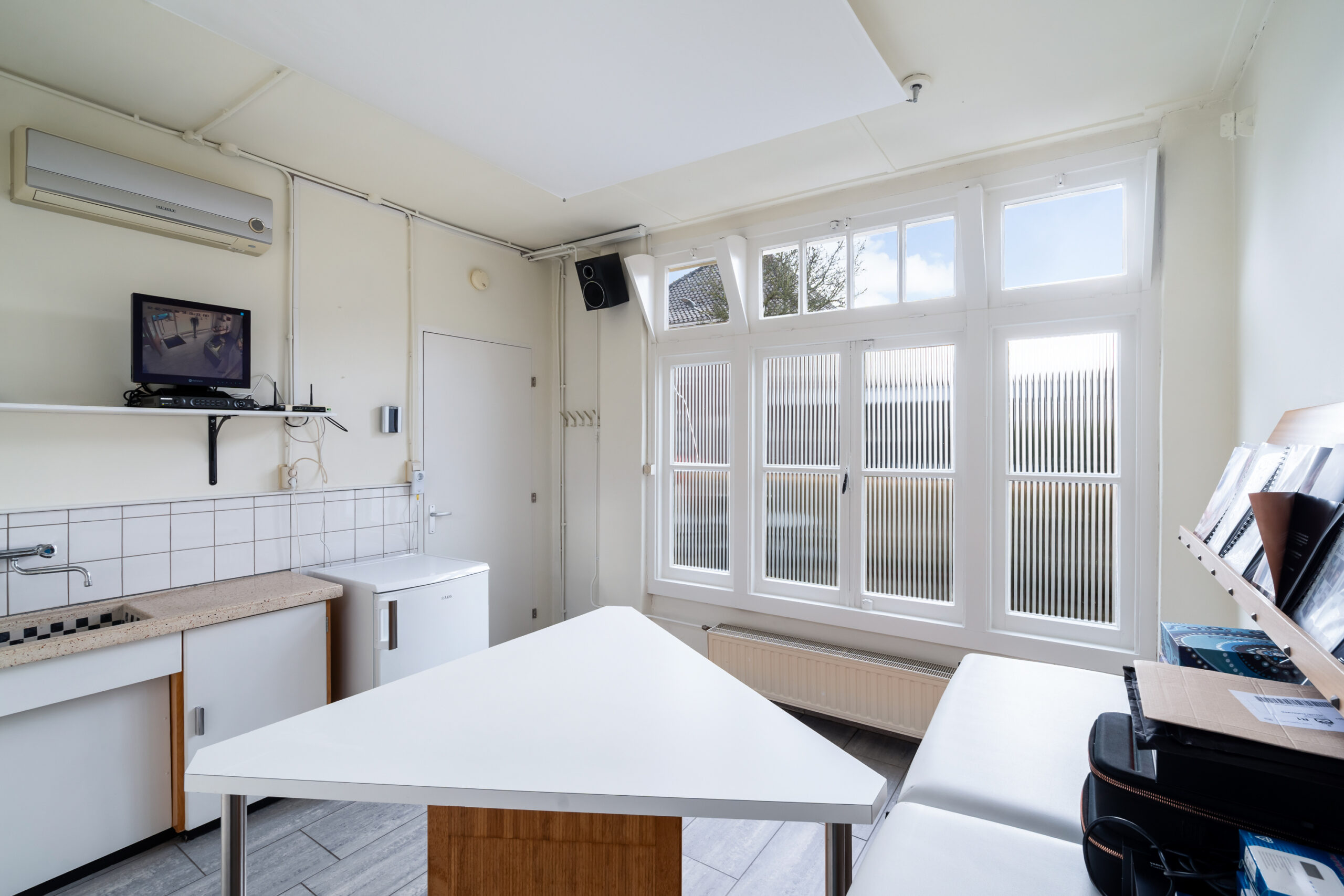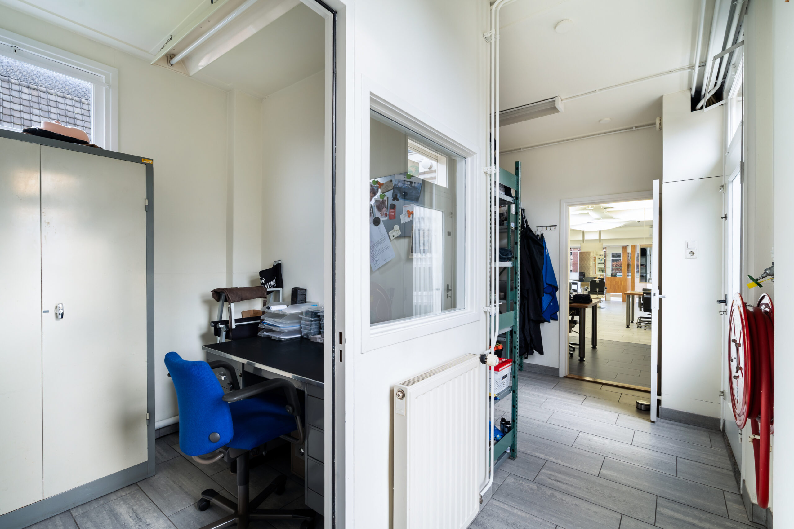 Verder vind je hier een gang, toilet met fonteintje, meterkast en trap naar boven. Aan de achterzijde een werkkamer met opstelplaats voor de cv-ketel en toegang tot de tuin. Daarnaast een kantoorruimte met eigen ingang – ideaal voor werken aan huis.