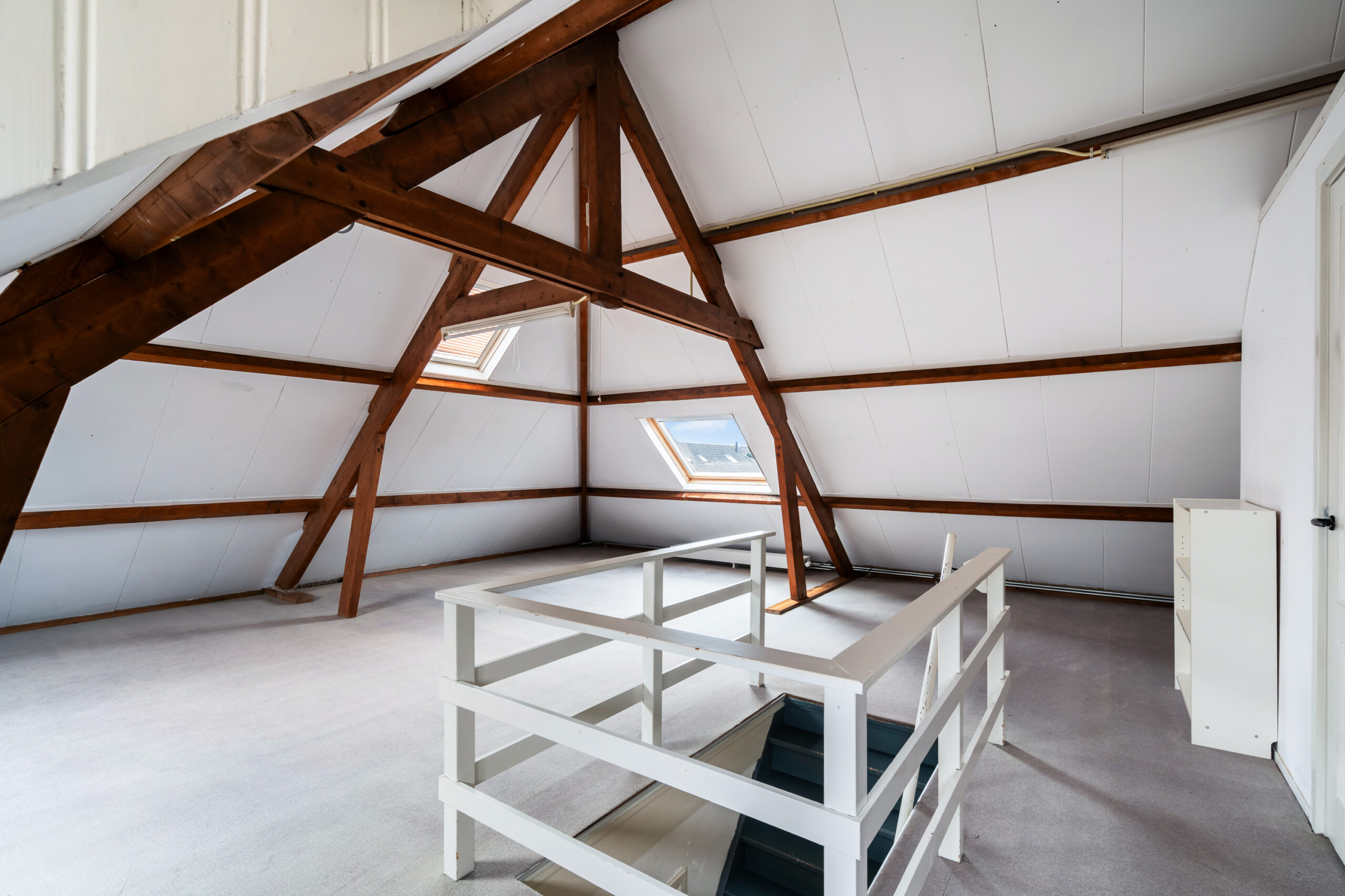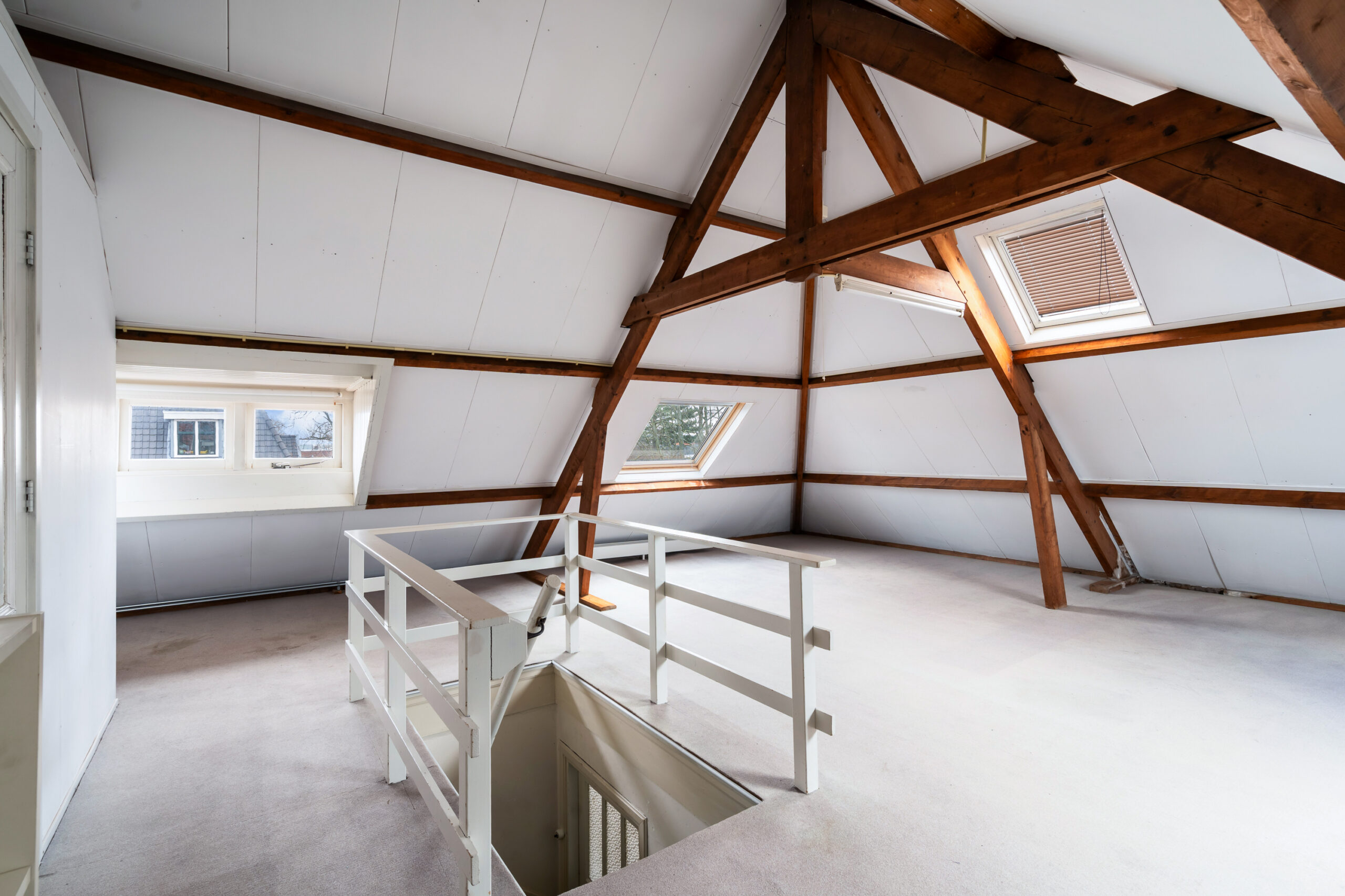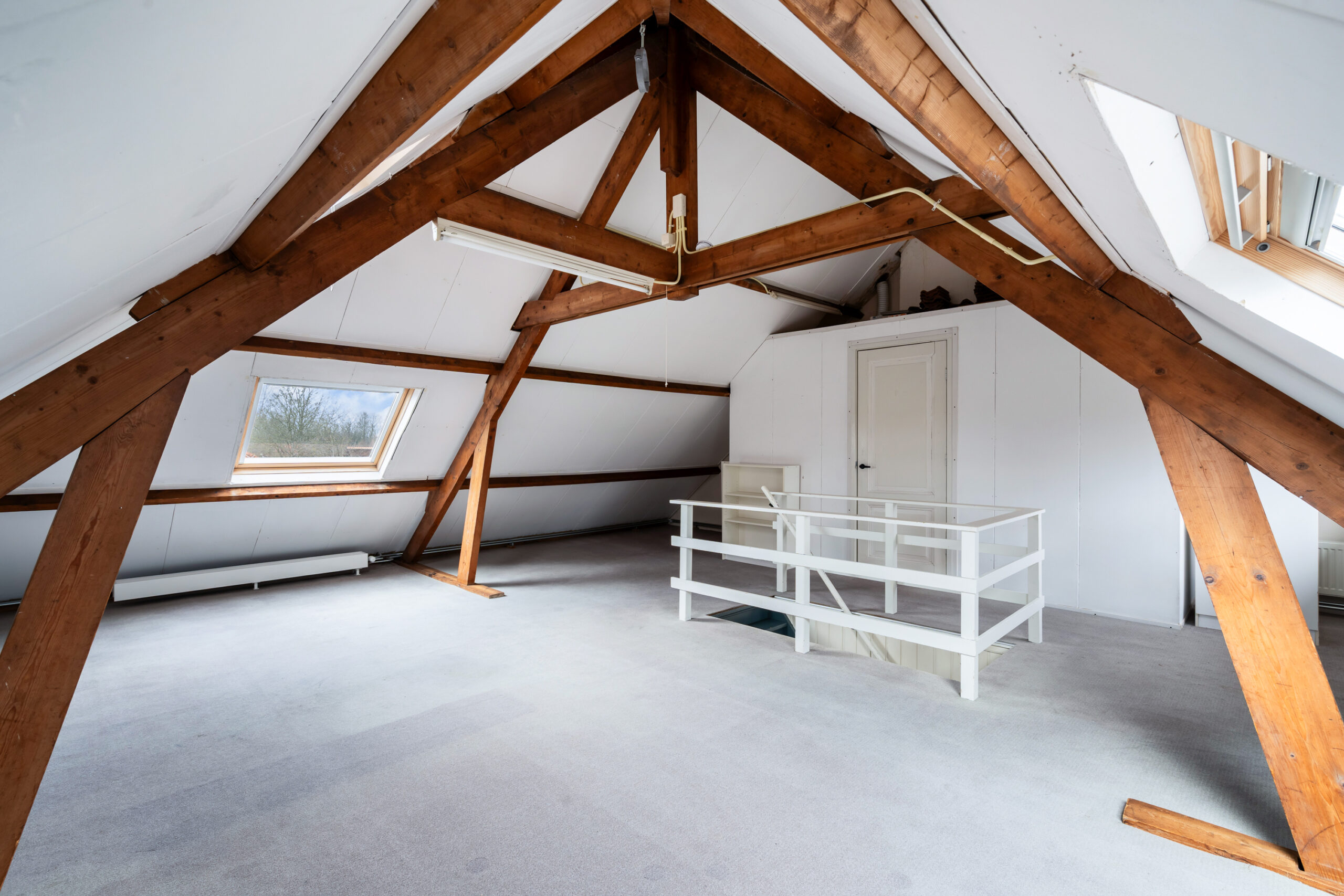 Een verrassend hoge zolder met karakter. Dit is zo’n ruimte waar je meteen ideeën bij krijgt: extra slaapkamer, studio, werkplek of misschien wel die langgekoesterde man-cave.