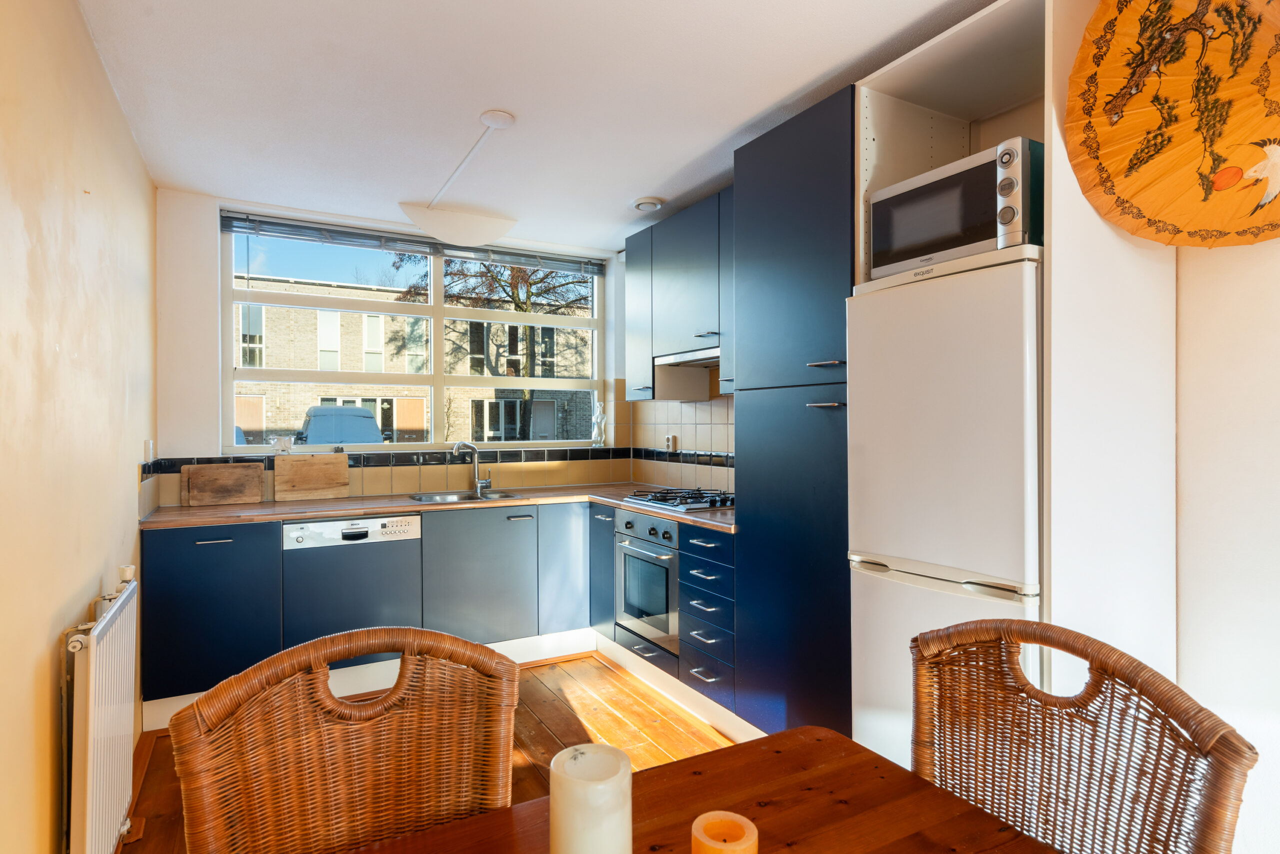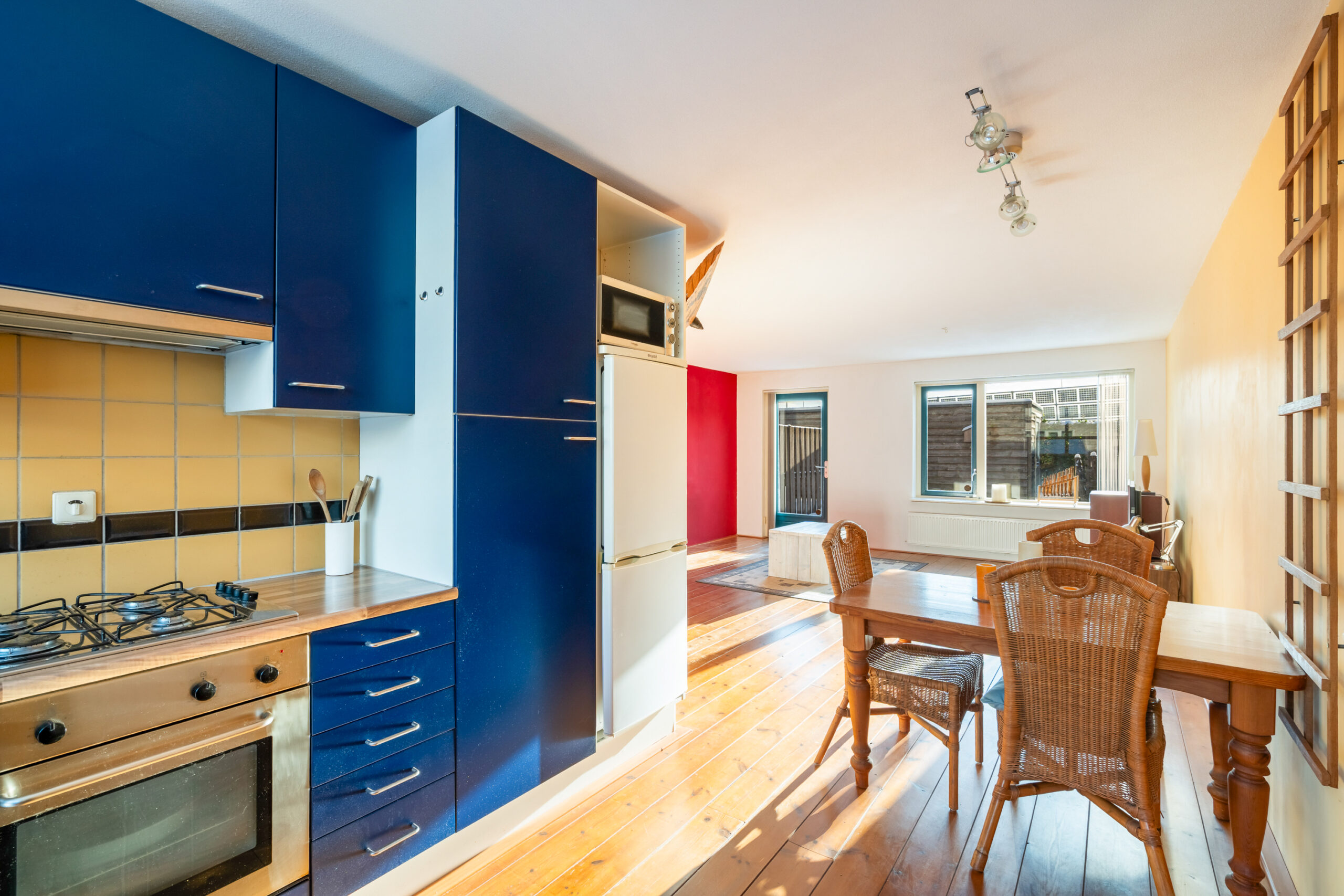 Aan de voorzijde is de open keuken, praktisch ingedeeld en uitgerust met diverse inbouwapparatuur.