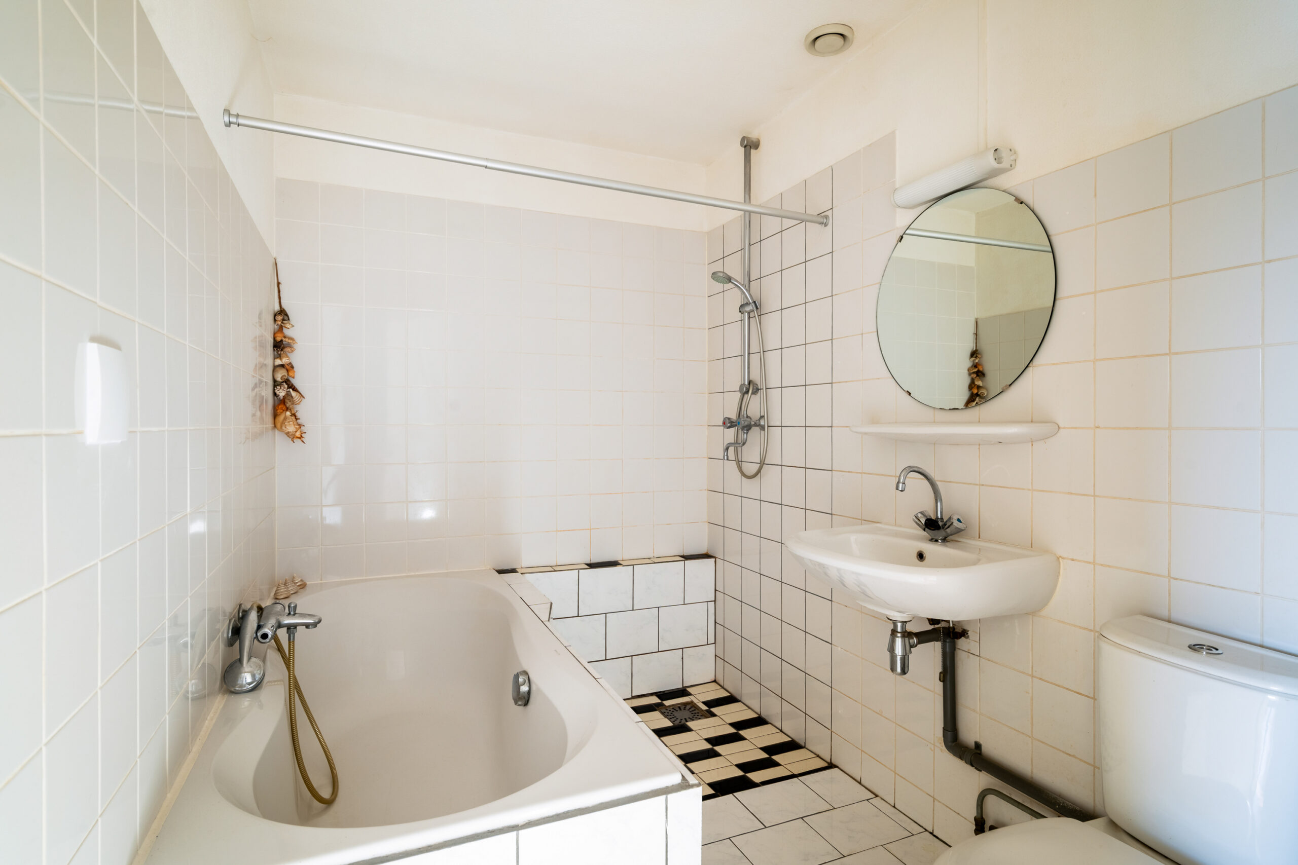 De badkamer is compleet ingericht met ligbad, douche en wastafel.