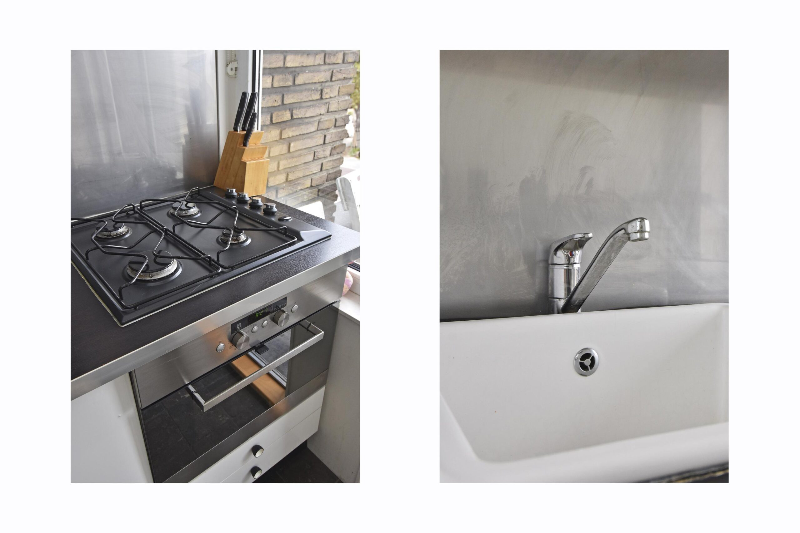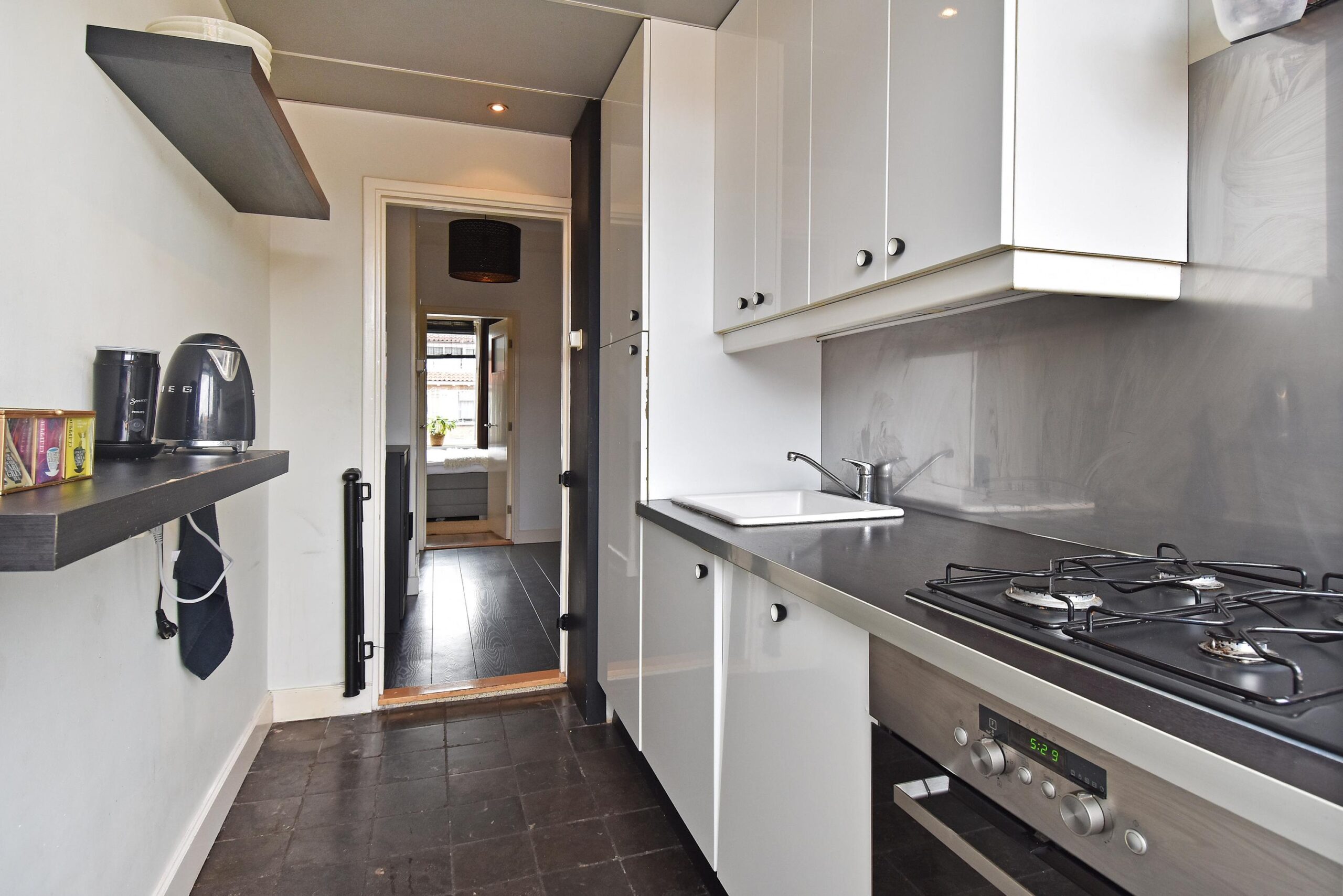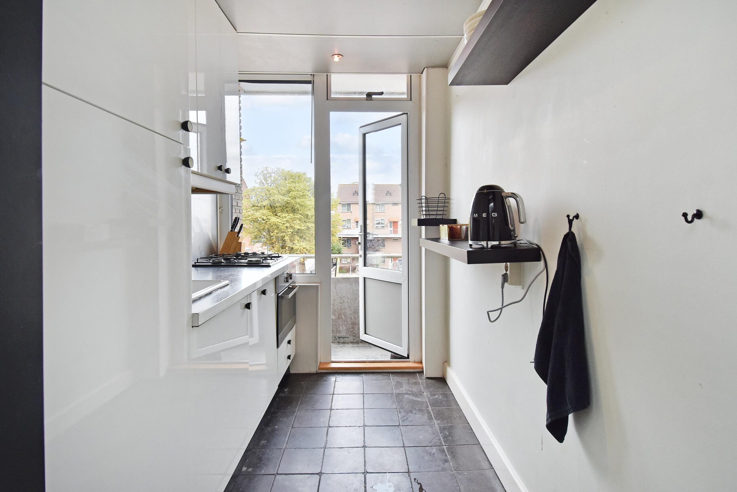 – dichte keuken met apparatuur en balkon