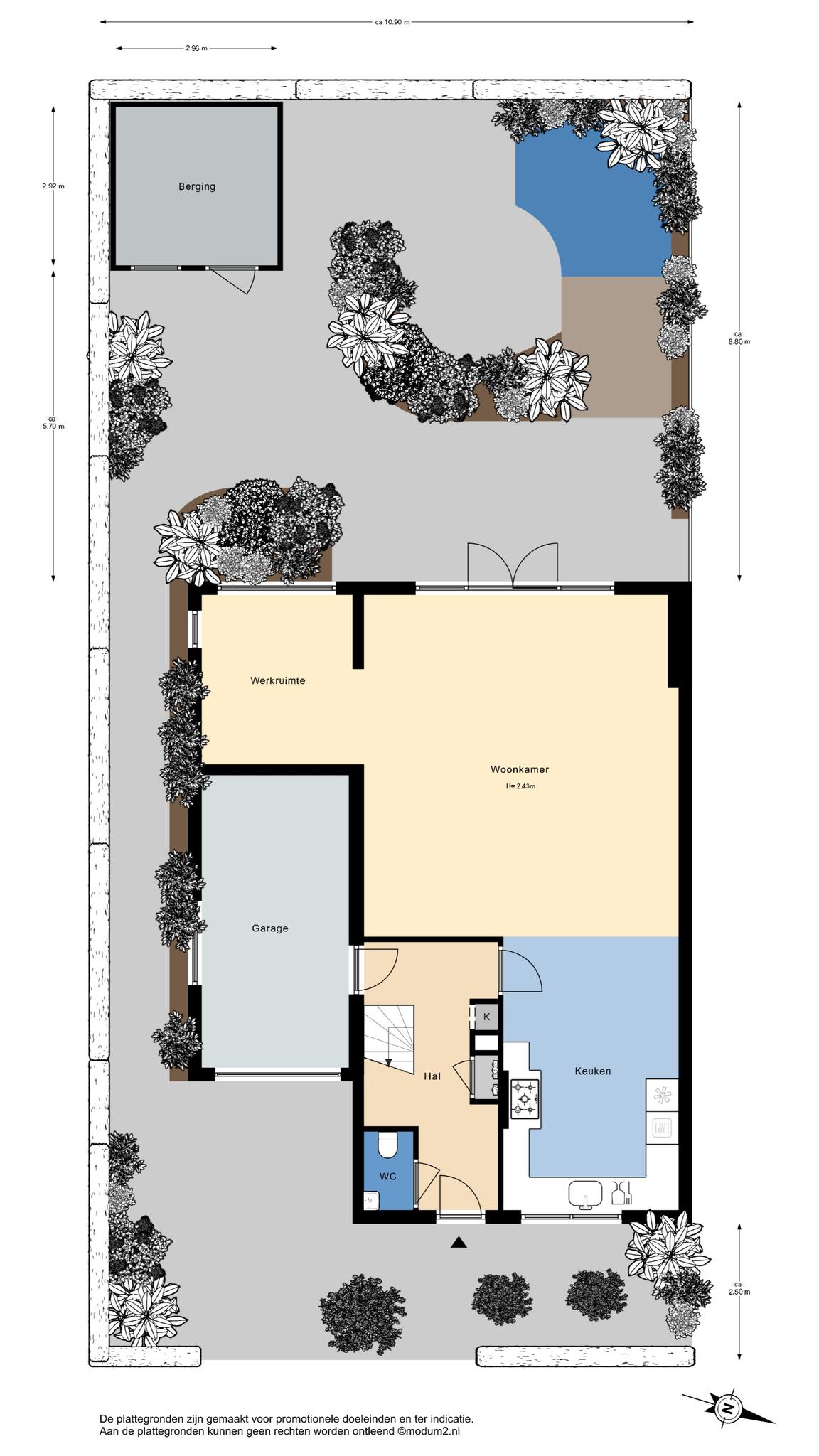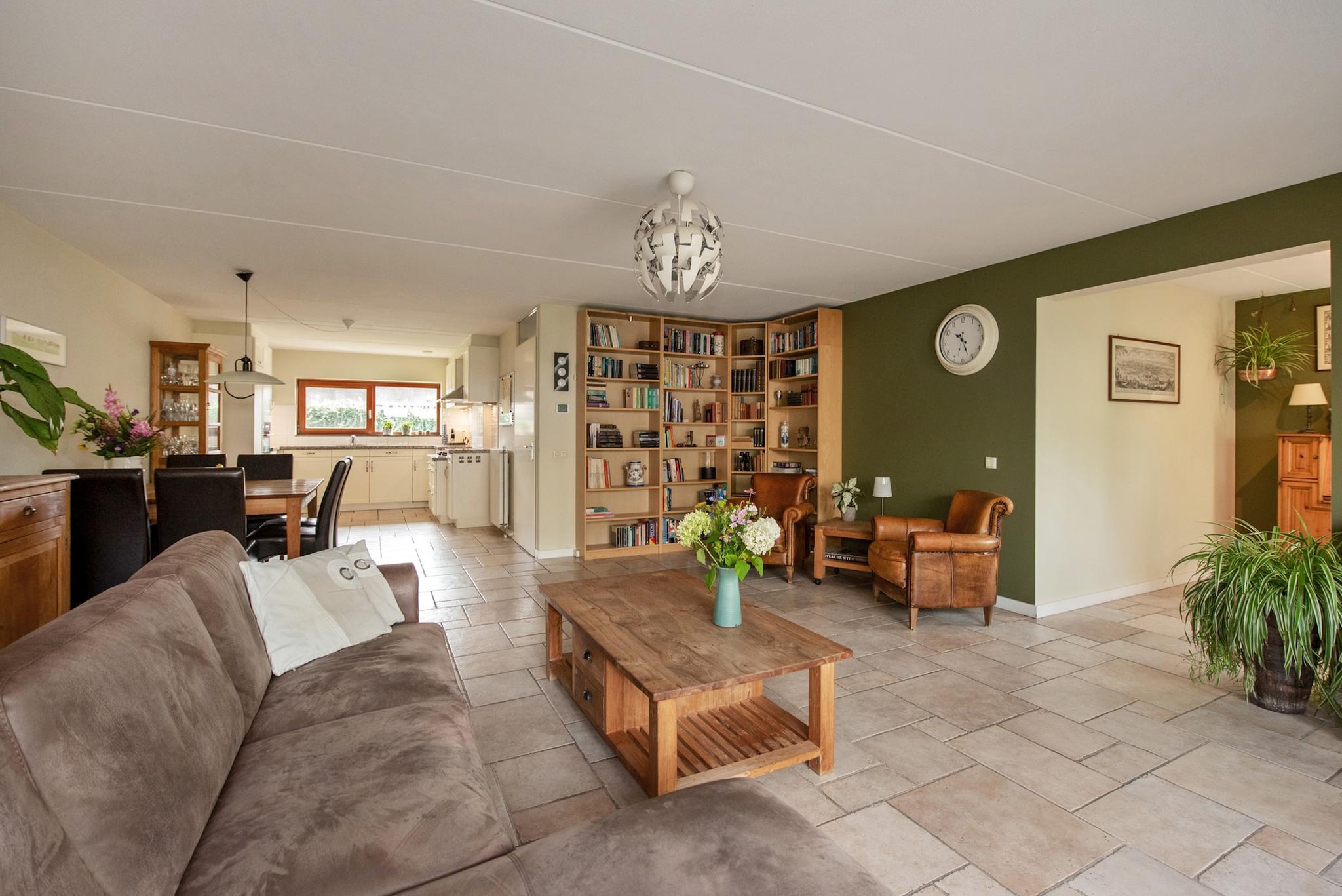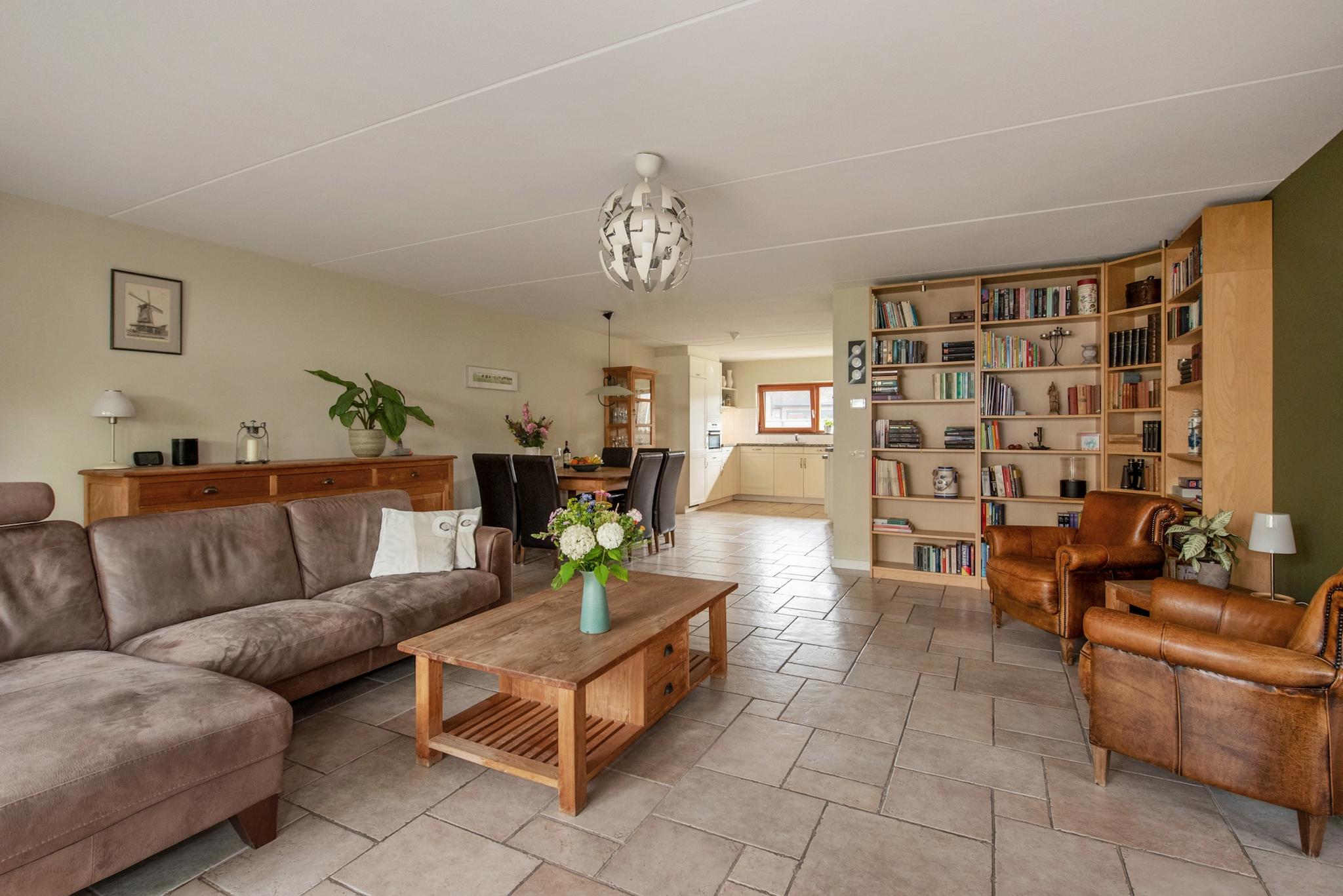 Indeling: Ruime hal/entree, garderobe, meterkast, modern toilet met fontein. Aan voorzijde is de moderne keuken geplaatst in een grote U-vorm met granieten aanrechtblad en diverse inbouwapparatuur. Een living van nagenoeg 70m2 voorzien van een prachtige tegelvloer in landelijke stijl in Romeins verband gelegd, het zitgedeelte bevindt zich aan de tuinzijde met openslaande deuren naar de tuin. Naast het zitgedeelte ligt de werkkamer. Via dubbele openslaande deuren toegang naar de zonnige op het westen gesitueerde achtertuin. De onderhoudsvriendelijke tuin is v.v. borders, een kleine waterpartij en meerdere terrassen en heeft daarnaast nog een grote houten berging. Aan de zijkant van de woning is een aangebouwde stenen garage toegankelijk, naast de garage/ woning loopt een pad op eigengrond die direct toegang biedt naar de achtertuin. Parkeren kan ook op eigen terrein.
