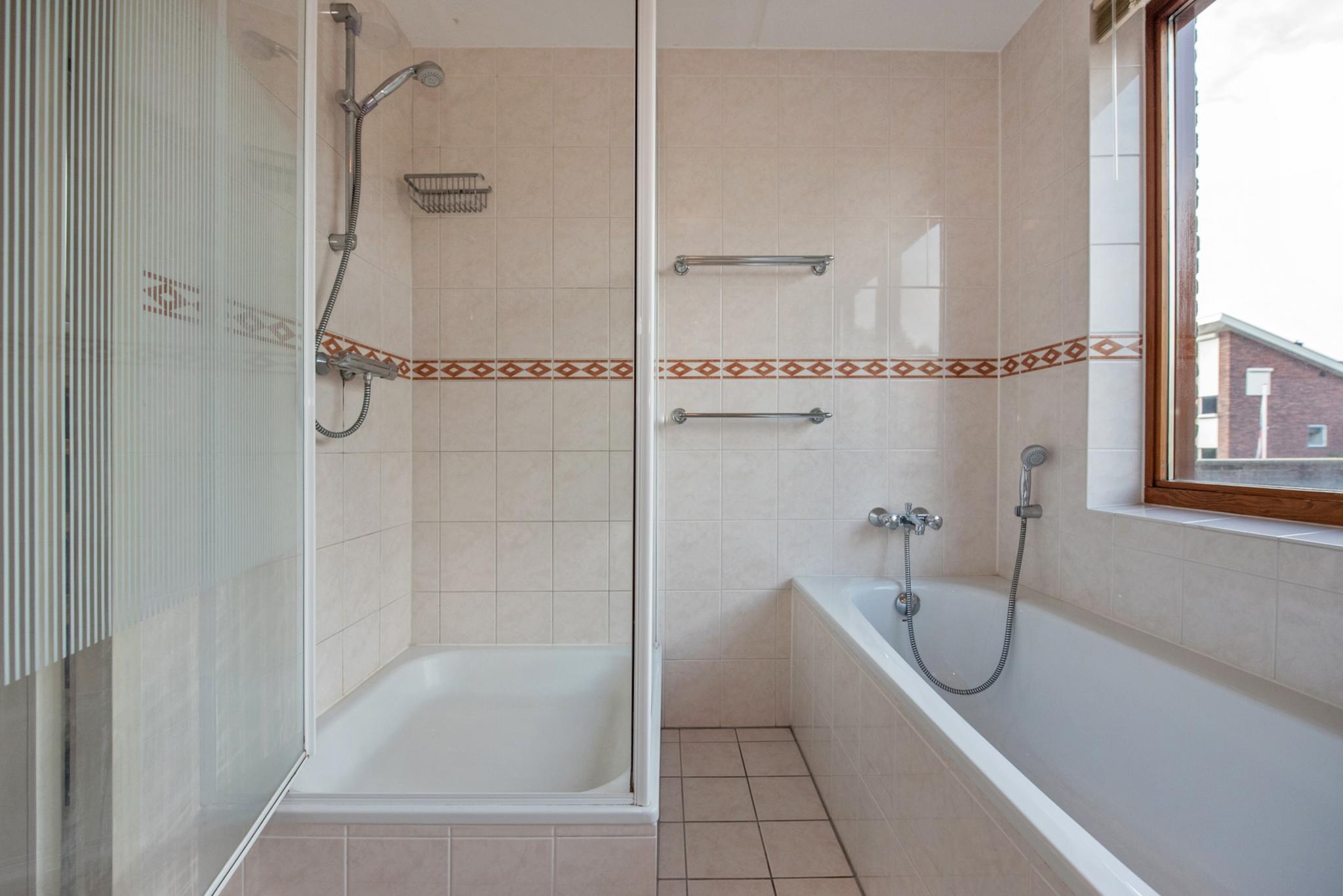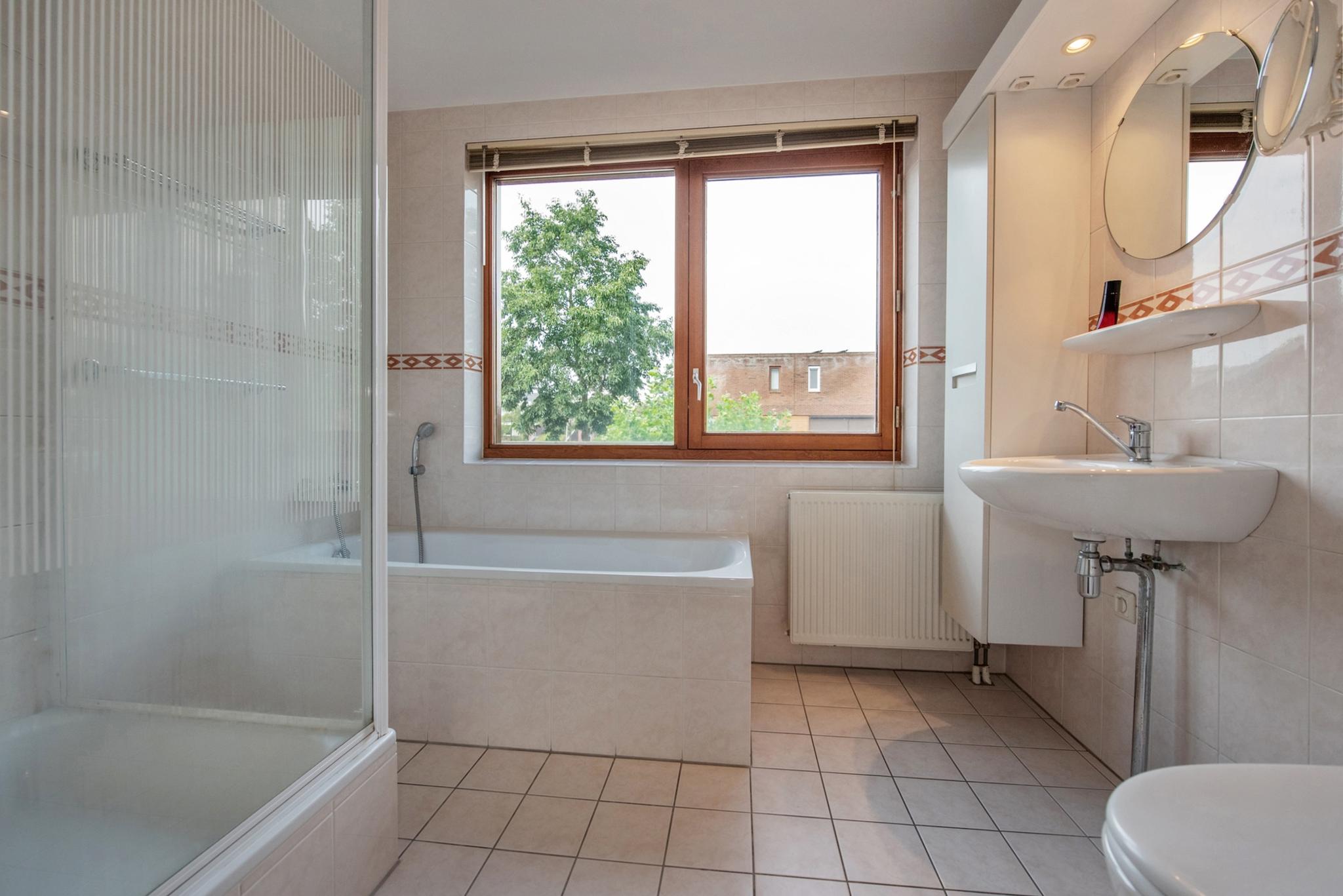Eerste verdieping: Vanuit de overloop zijn er twee grote slaapkamers toegankelijk en een badkamer, deze beschikt over een ligbad, separate douche, wastafelcombinatie en een tweede toilet.