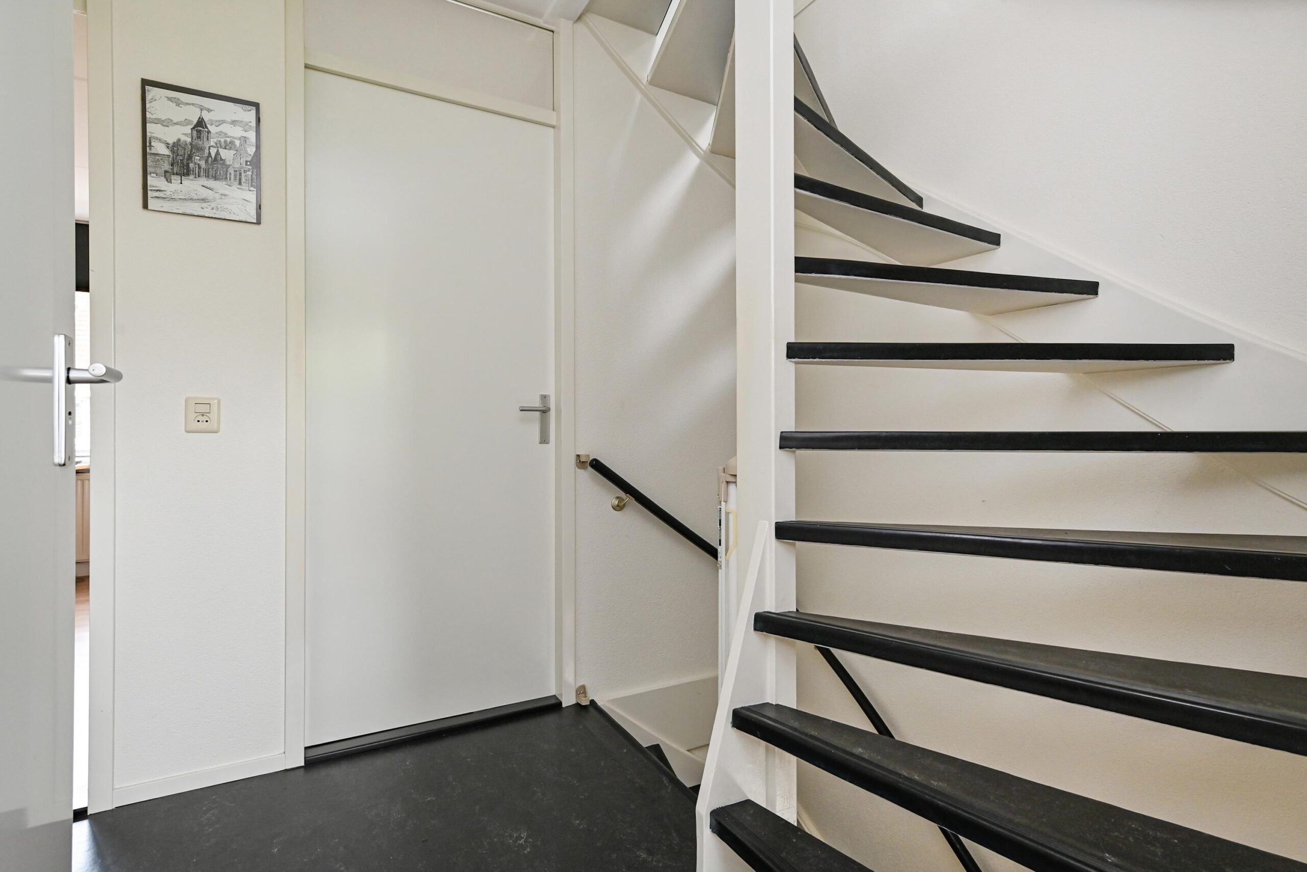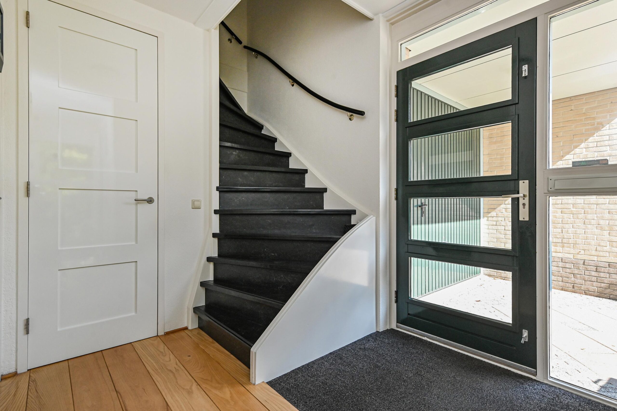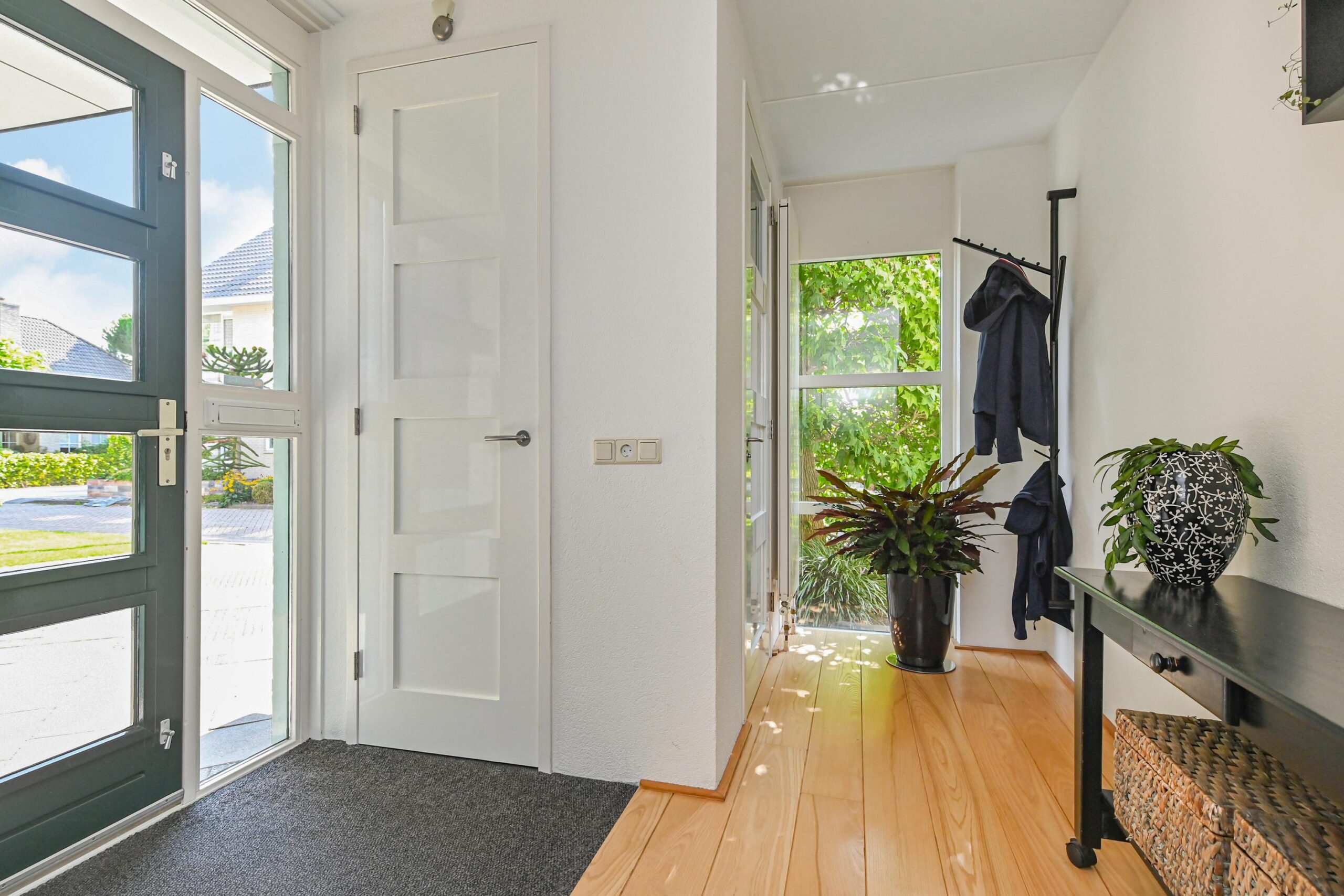 Via de voortuin met oprit kom je bij de zij-entree van de woning. Entree/hal met meterkast en modern toilet.