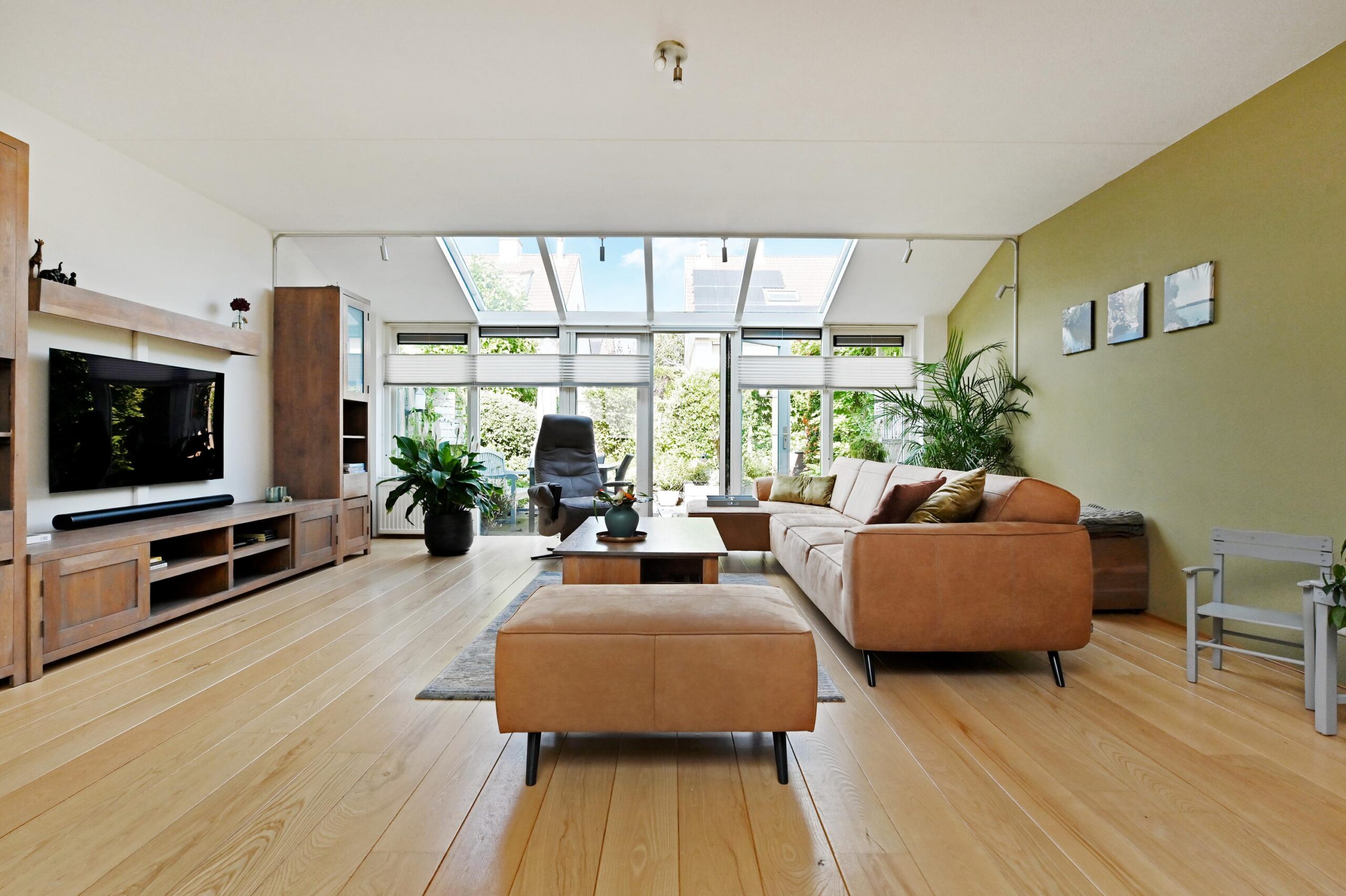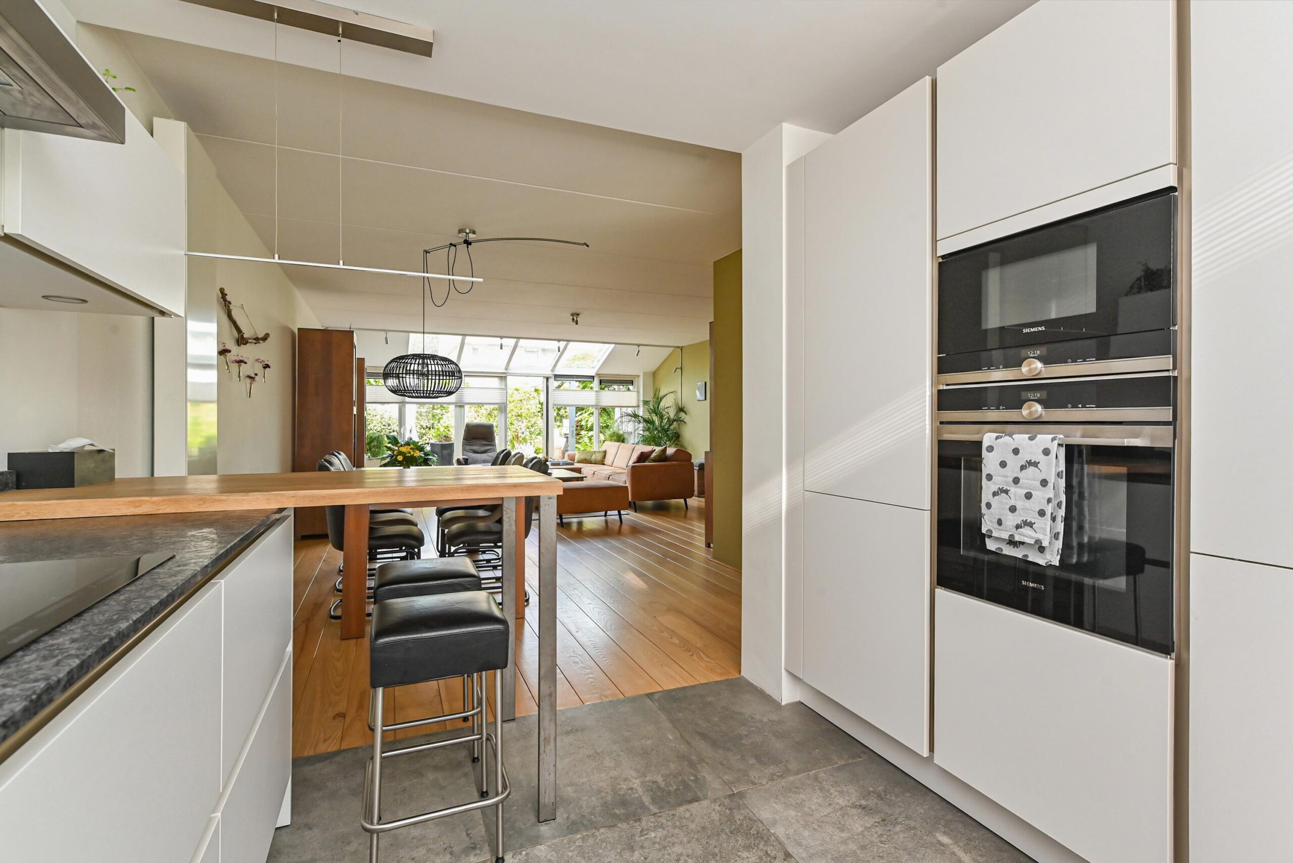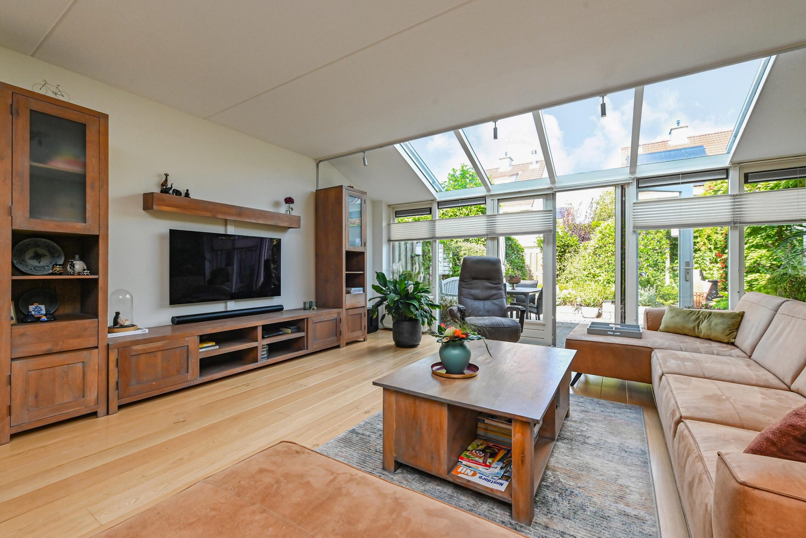 Ruime en lichte woonkamer, direct vanuit de nieuwbouw is in een serre-uitbouw voorzien, wat fijn ruimte geeft in de woning en prachtig lichtinval. Dubbele openslaande deuren naar de zonnige, fraai aangelegde achtertuin. In de tuin kan je heerlijk zitten, tuinieren, spelletjes spelen onder een schaduwrijk plekje. Aan de voorzijde is de moderne luxe uitgevoerde open keuken. Die is voorzien van alle inbouwapparatuur en heeft een prachtig werkblad.