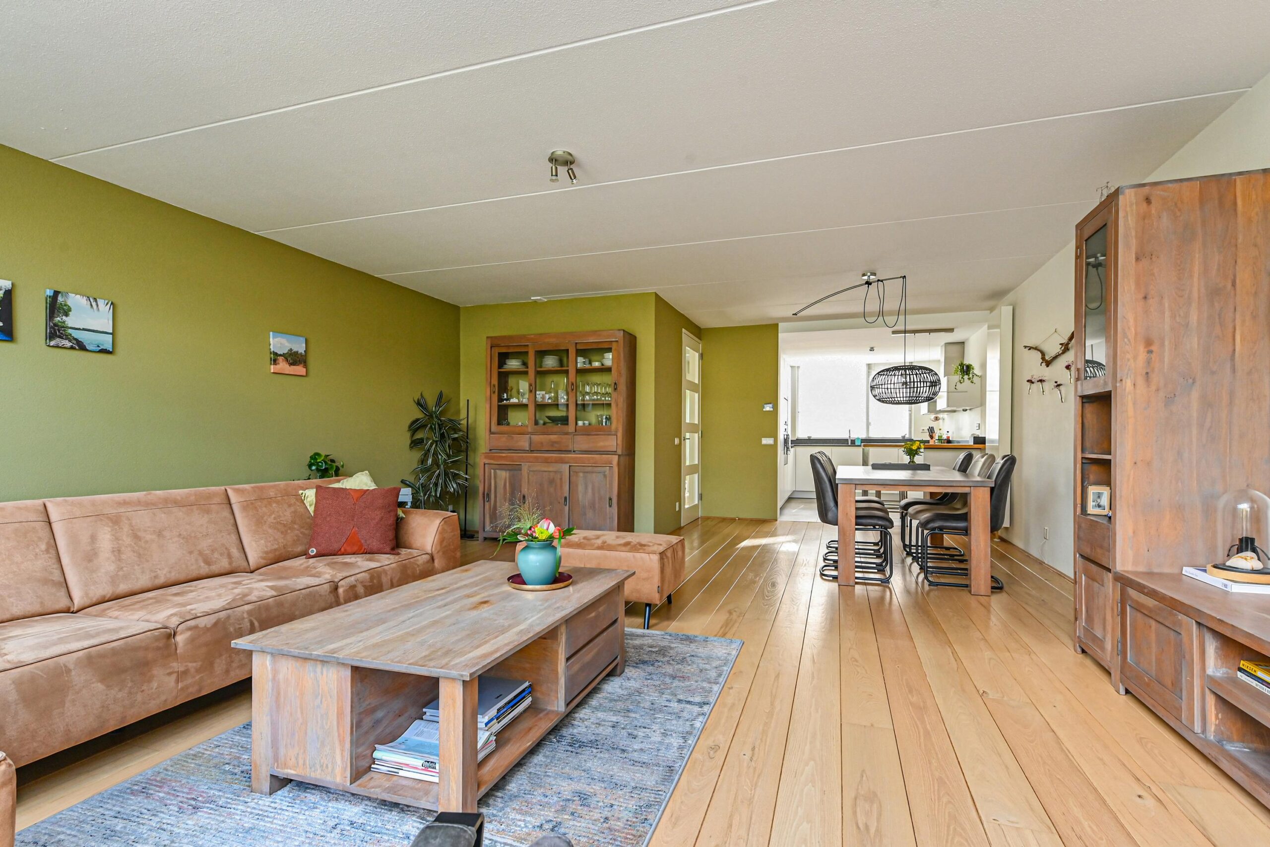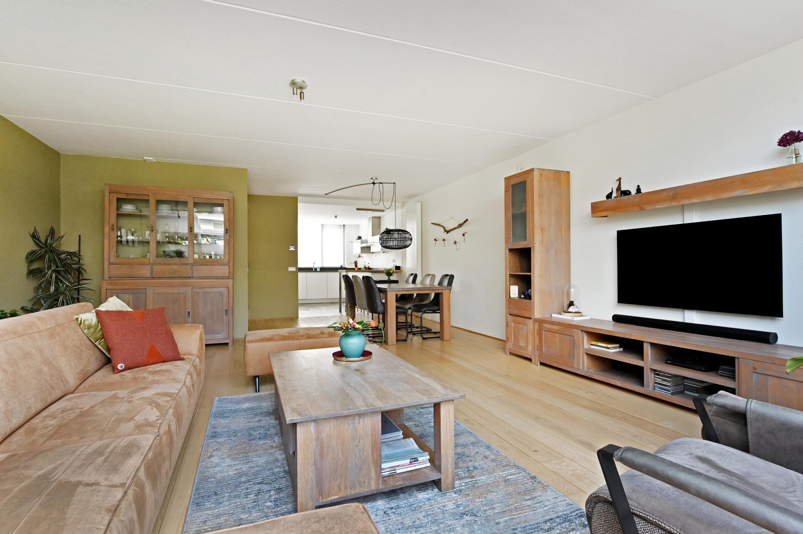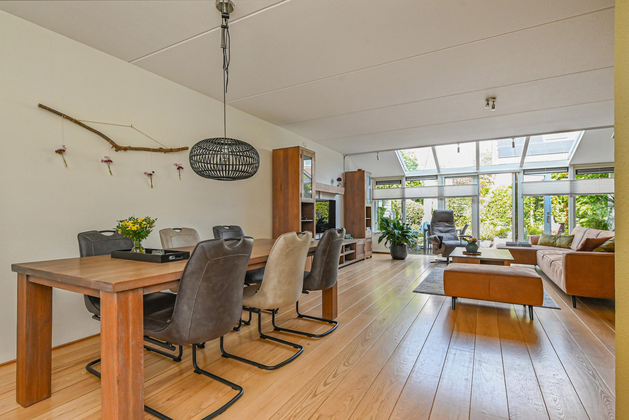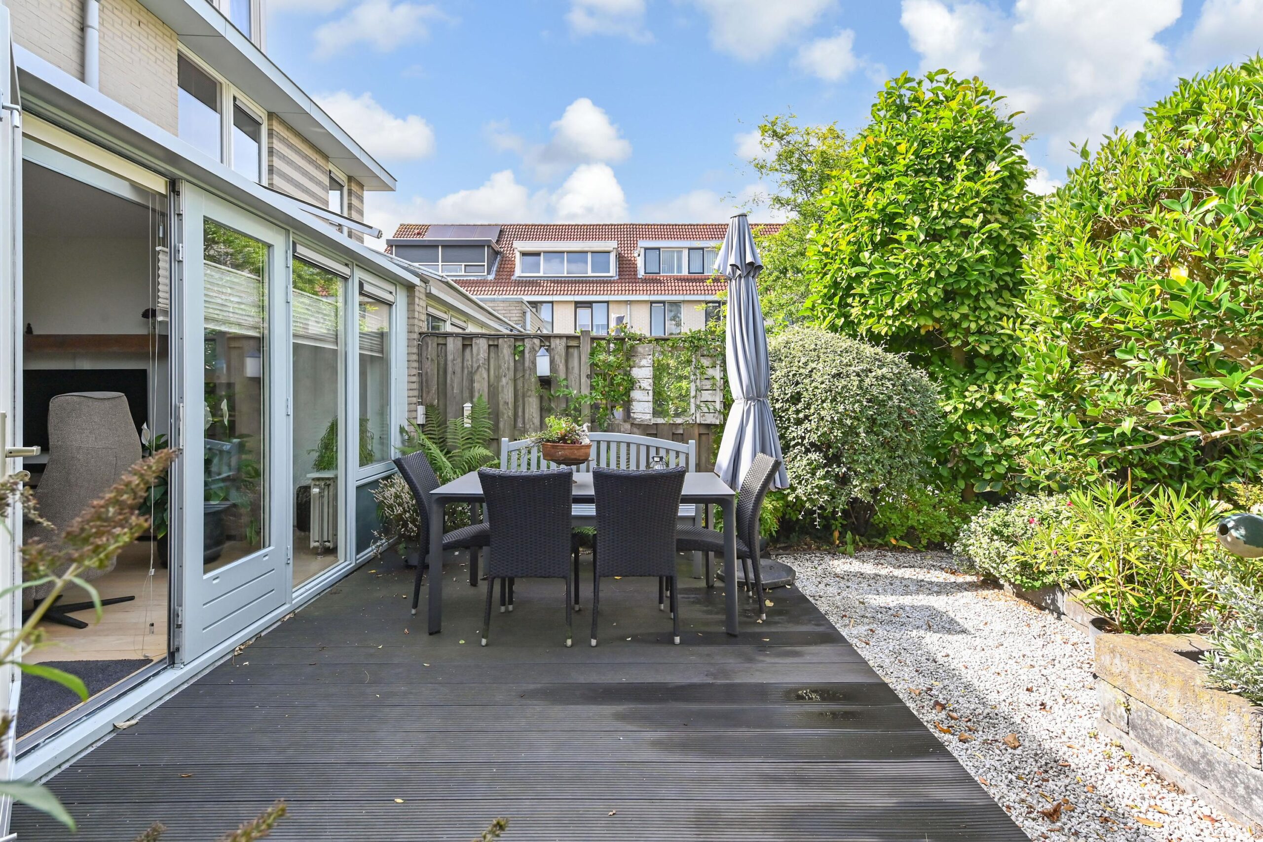 Ruime en lichte woonkamer, direct vanuit de nieuwbouw is in een serre-uitbouw voorzien, wat fijn ruimte geeft in de woning en prachtig lichtinval. Dubbele openslaande deuren naar de zonnige, fraai aangelegde achtertuin. In de tuin kan je heerlijk zitten, tuinieren, spelletjes spelen onder een schaduwrijk plekje. Aan de voorzijde is de moderne luxe uitgevoerde open keuken. Die is voorzien van alle inbouwapparatuur en heeft een prachtig werkblad.