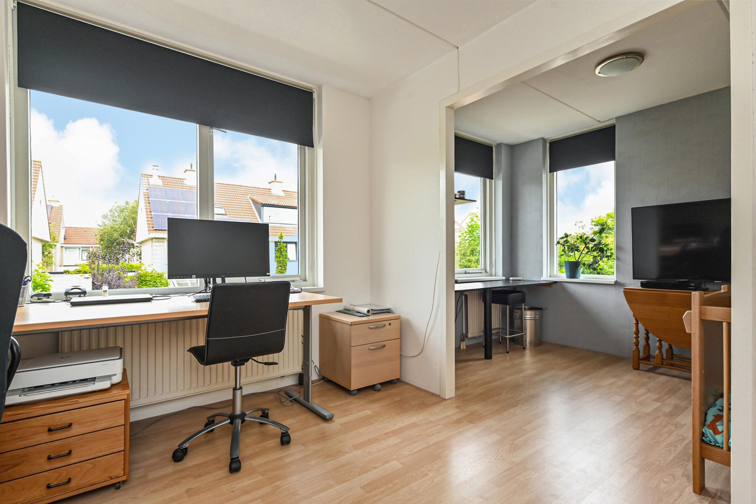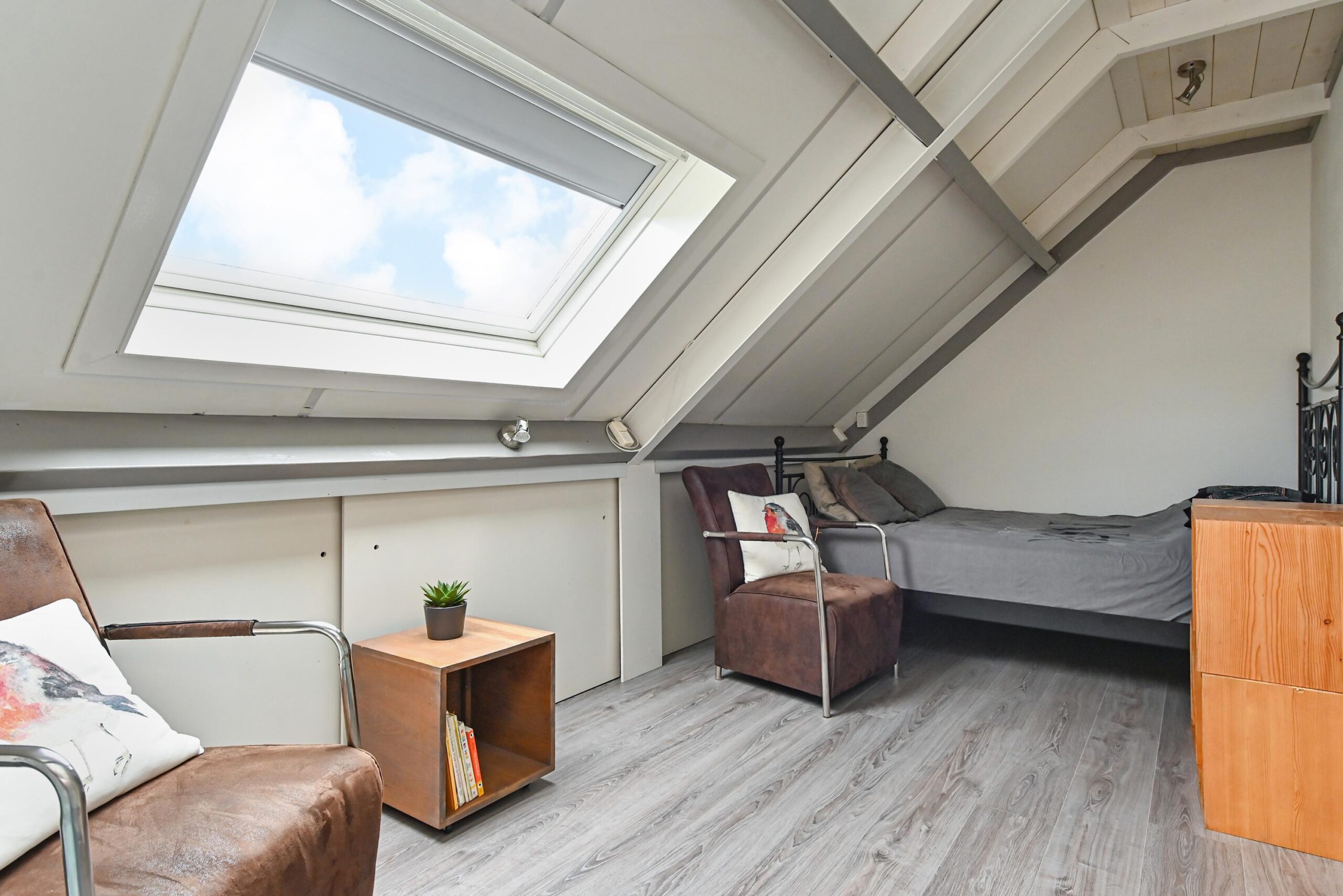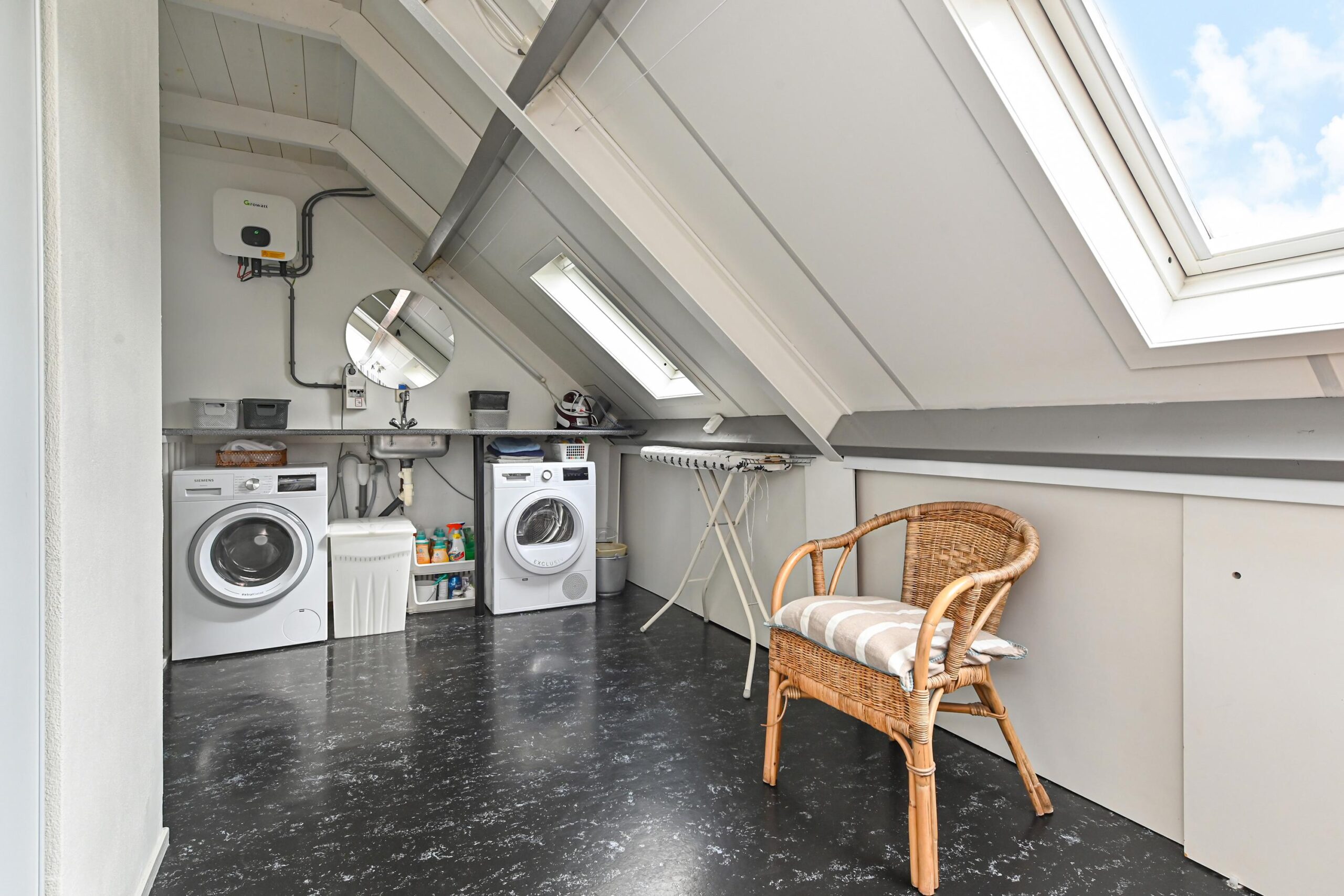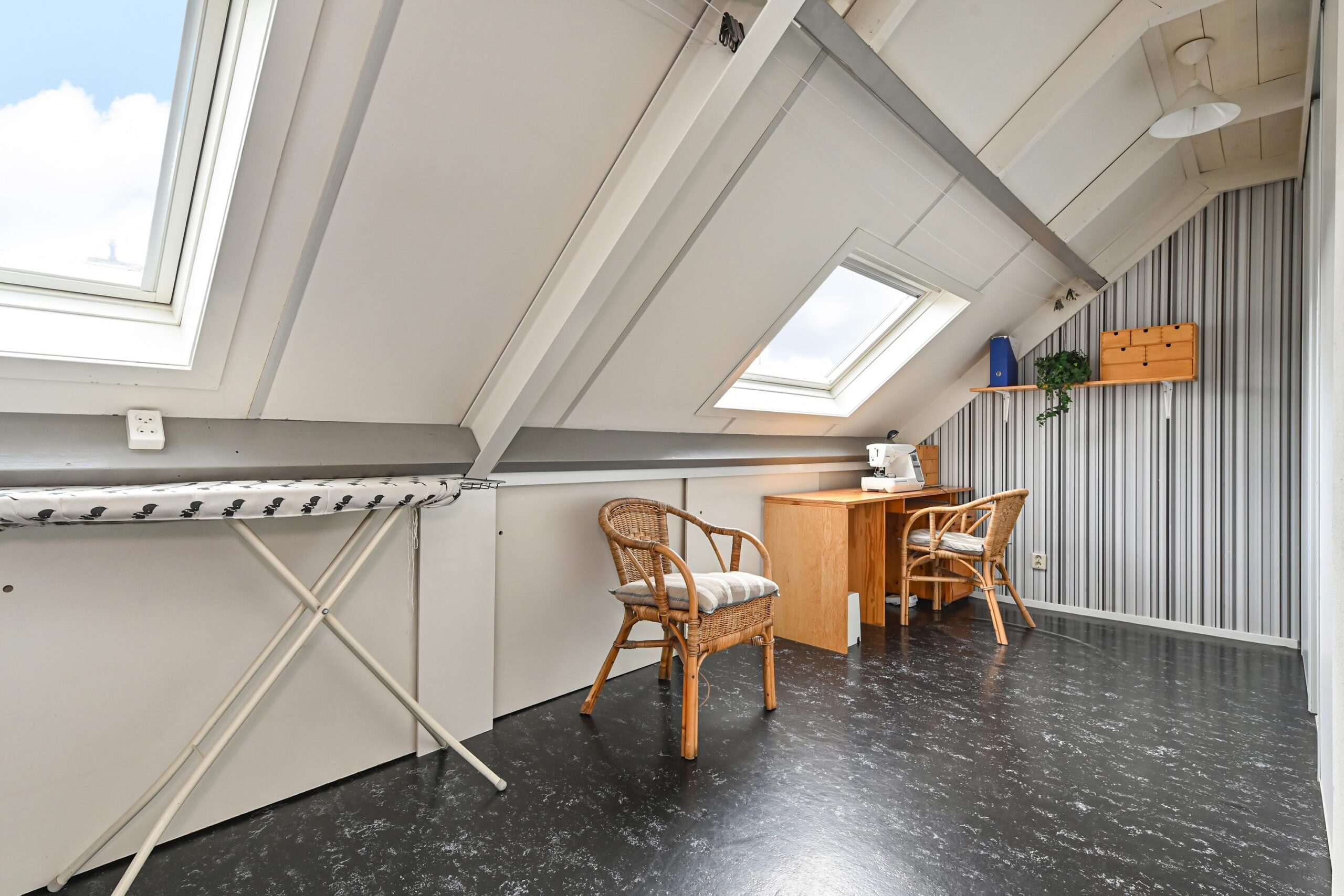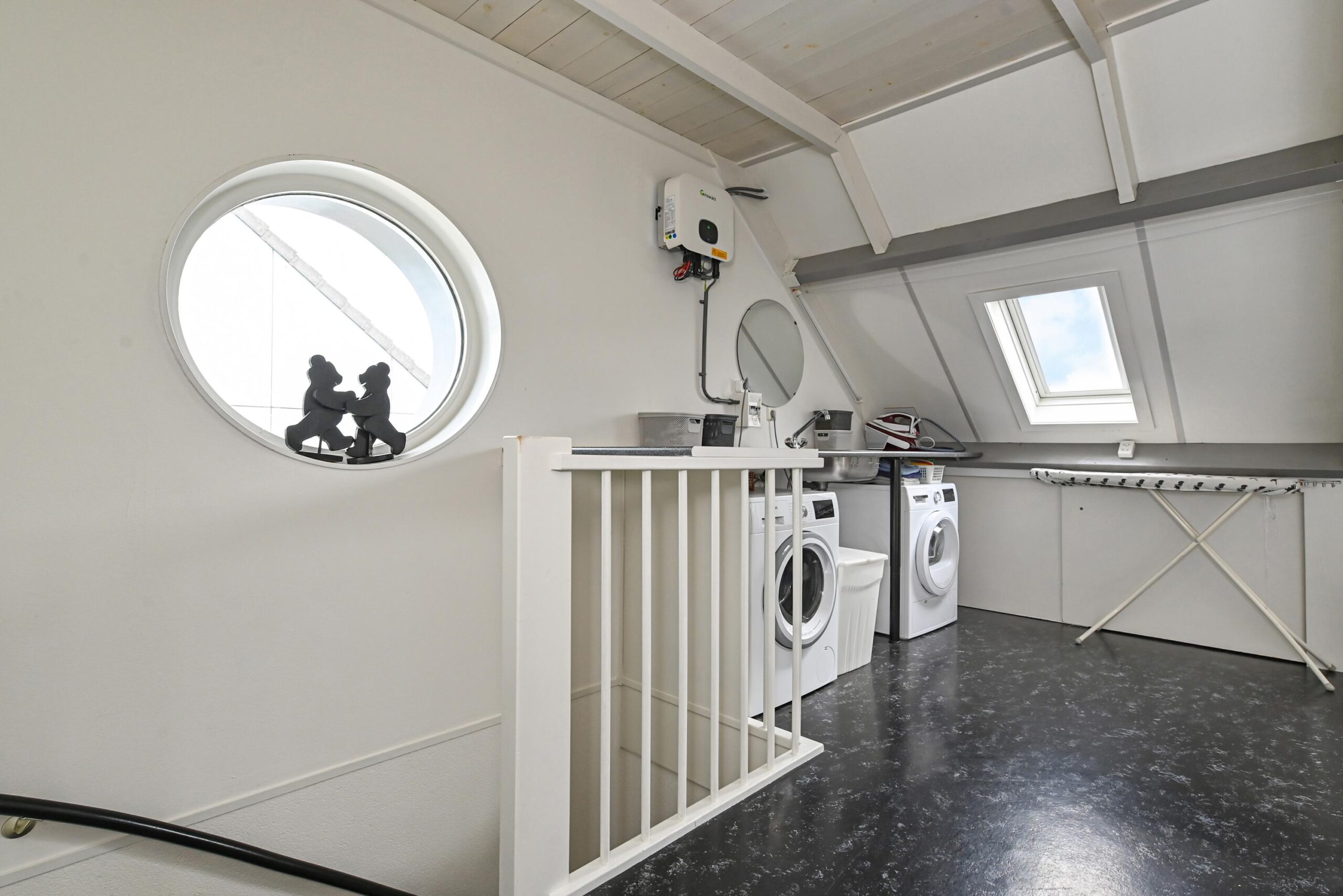 2e verdieping: Royale open ruimte annex voorzolder met hobbyruimte, gescheiden door een kastenwand. Luik met vlizotrap naar de bergvliering. Aansluiting wasmachine en droger en opstelling CV HR ketel met elektrische boiler. 4e grote kamer aan de achterzijde met een groot dakraam.