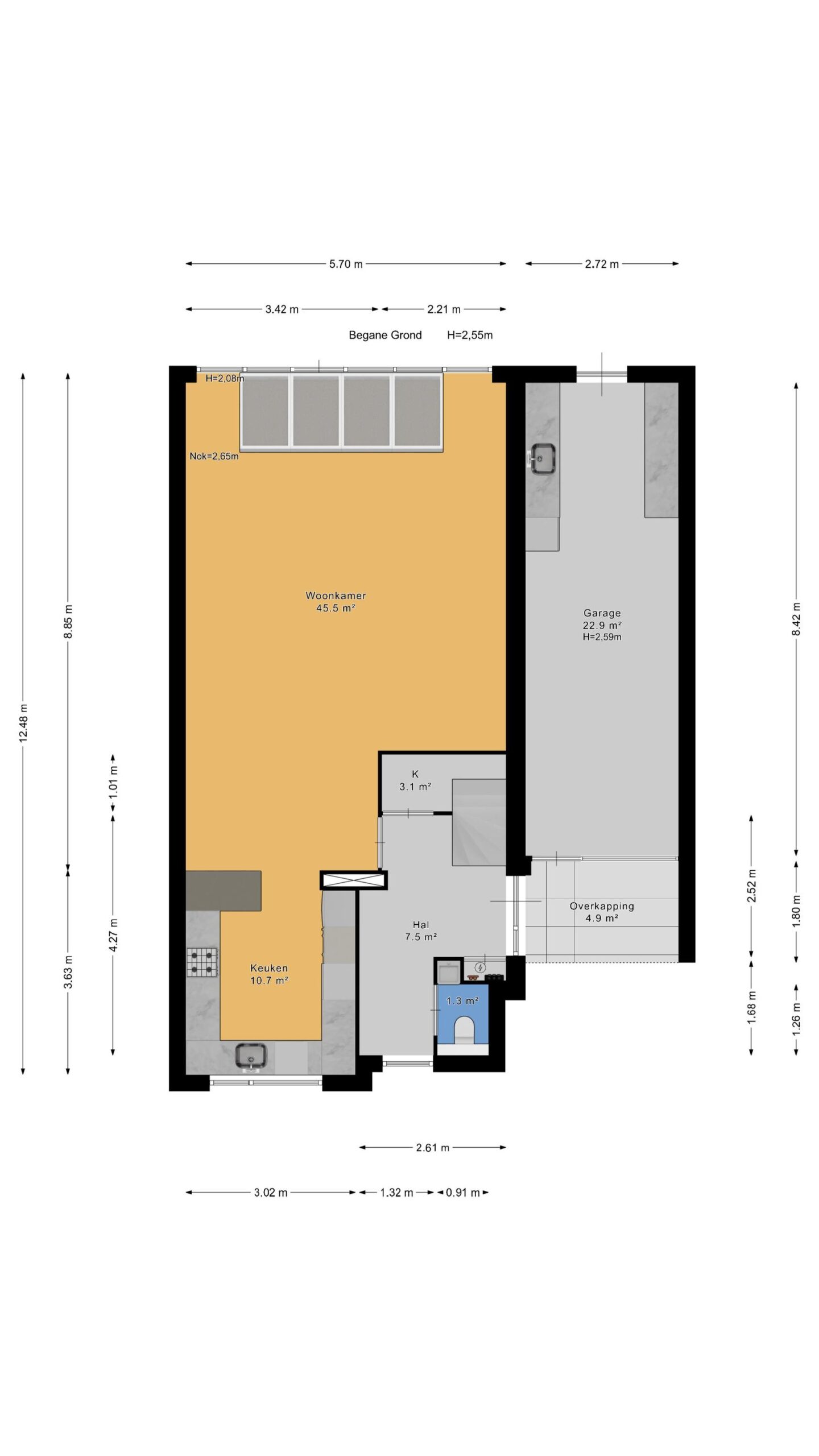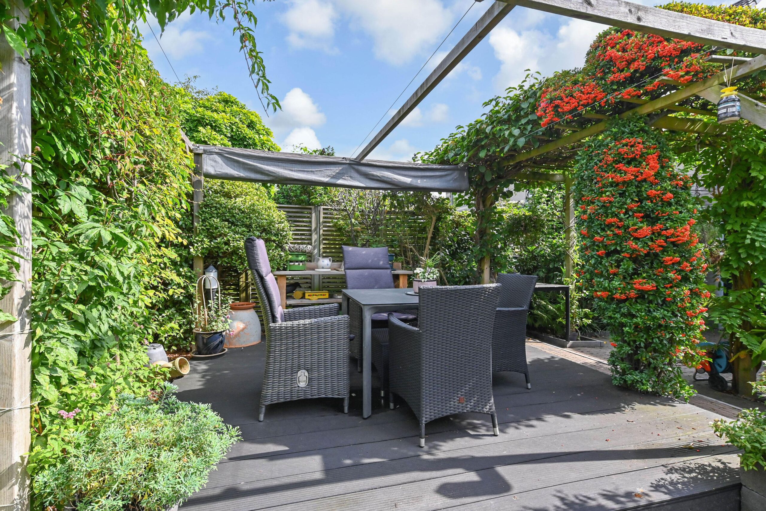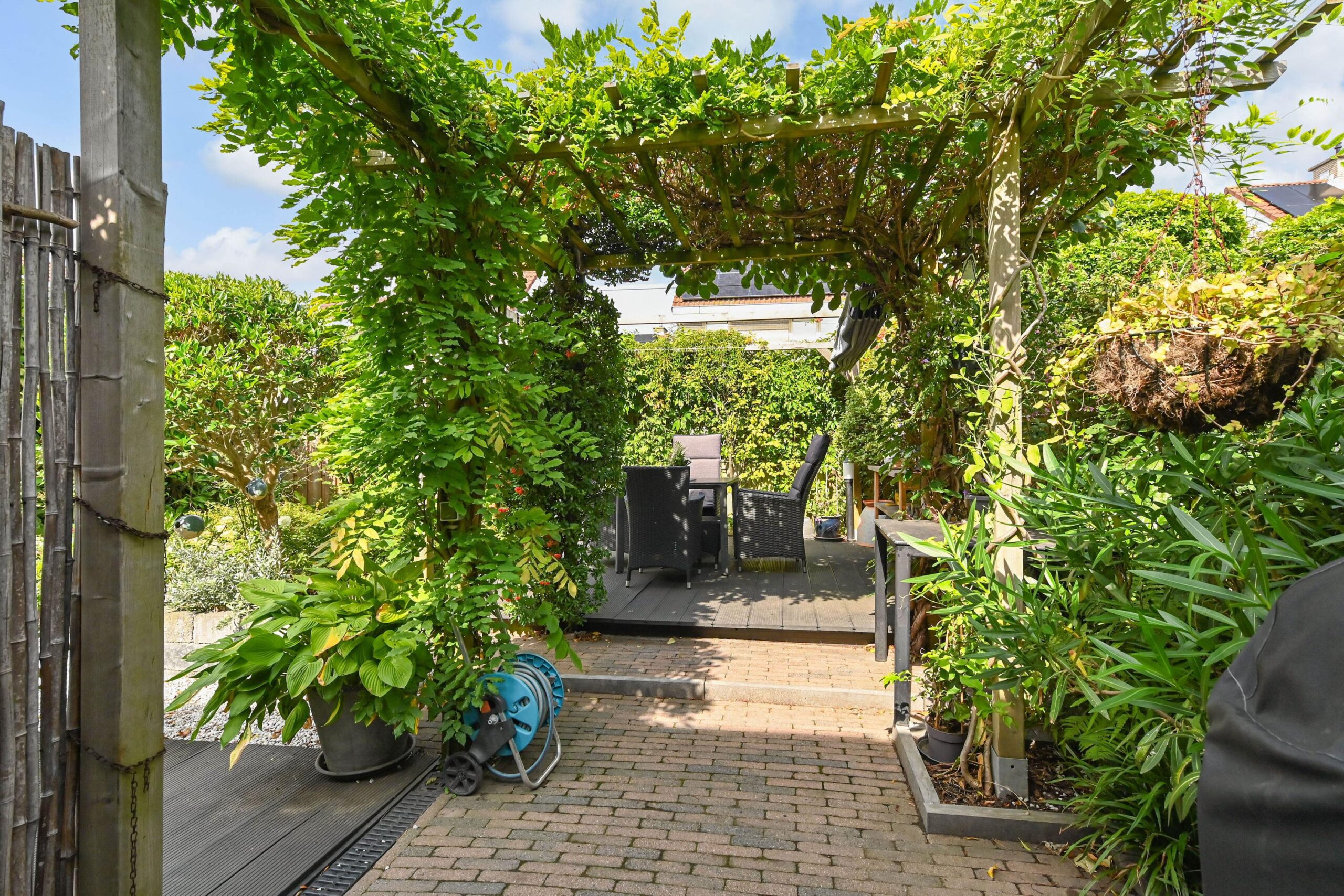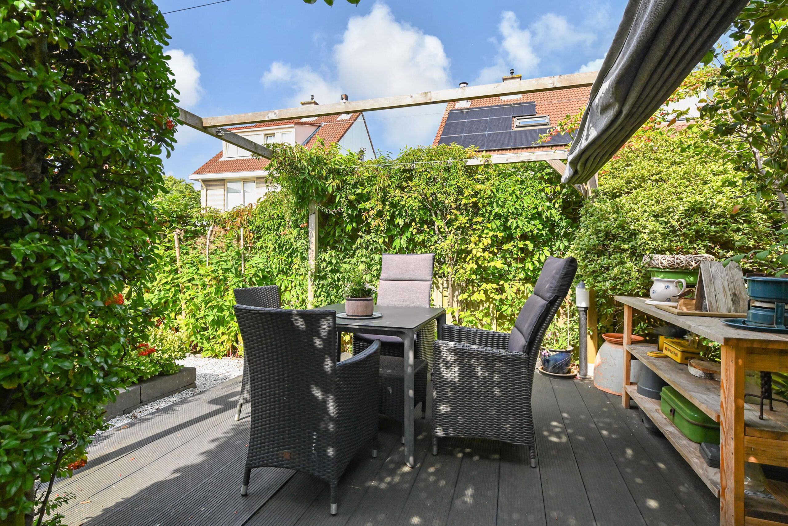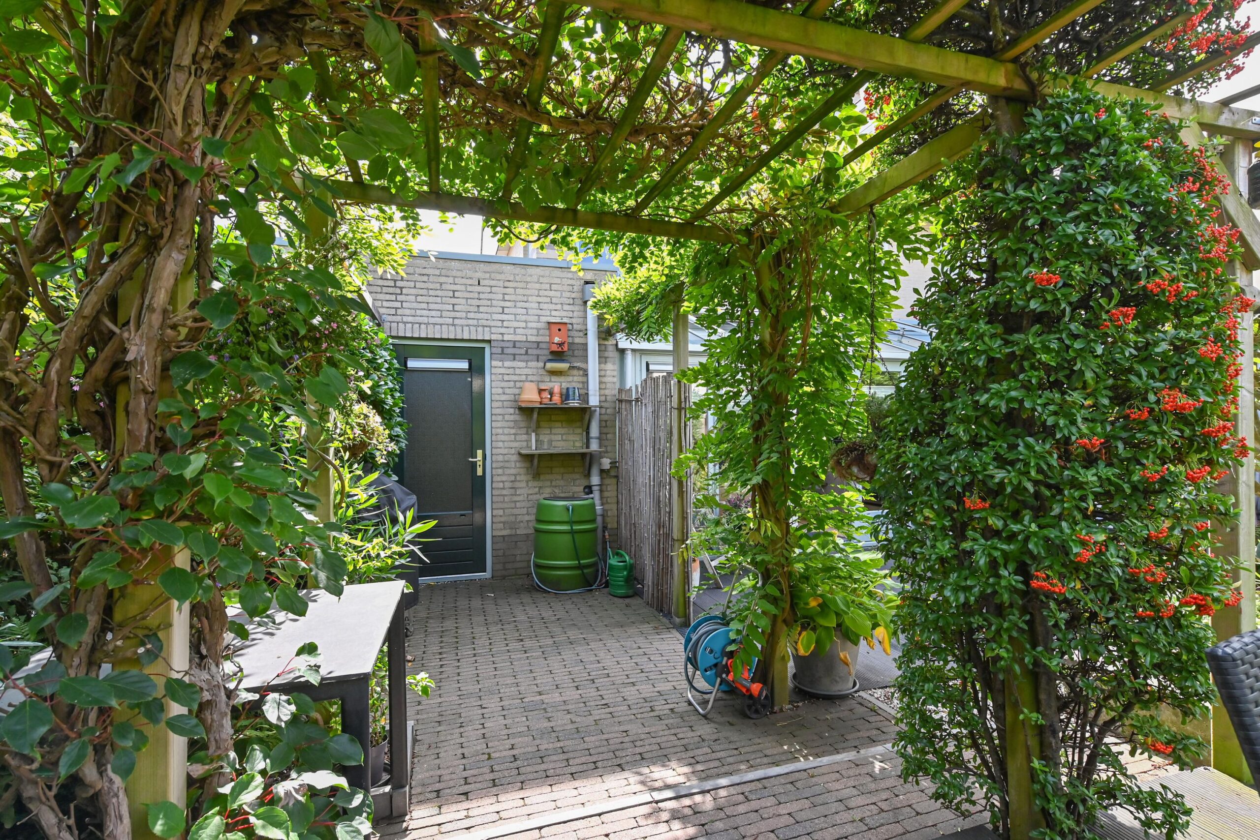 Vanuit de achtertuin is garage/berging ook toegankelijk. Garage is groter dan gebruikelijk en heeft naast mogelijkheid stallen auto of motor en fietsen nog voldoende ruimte voor berging en werkblad voor hobby/bijkeuken functie.