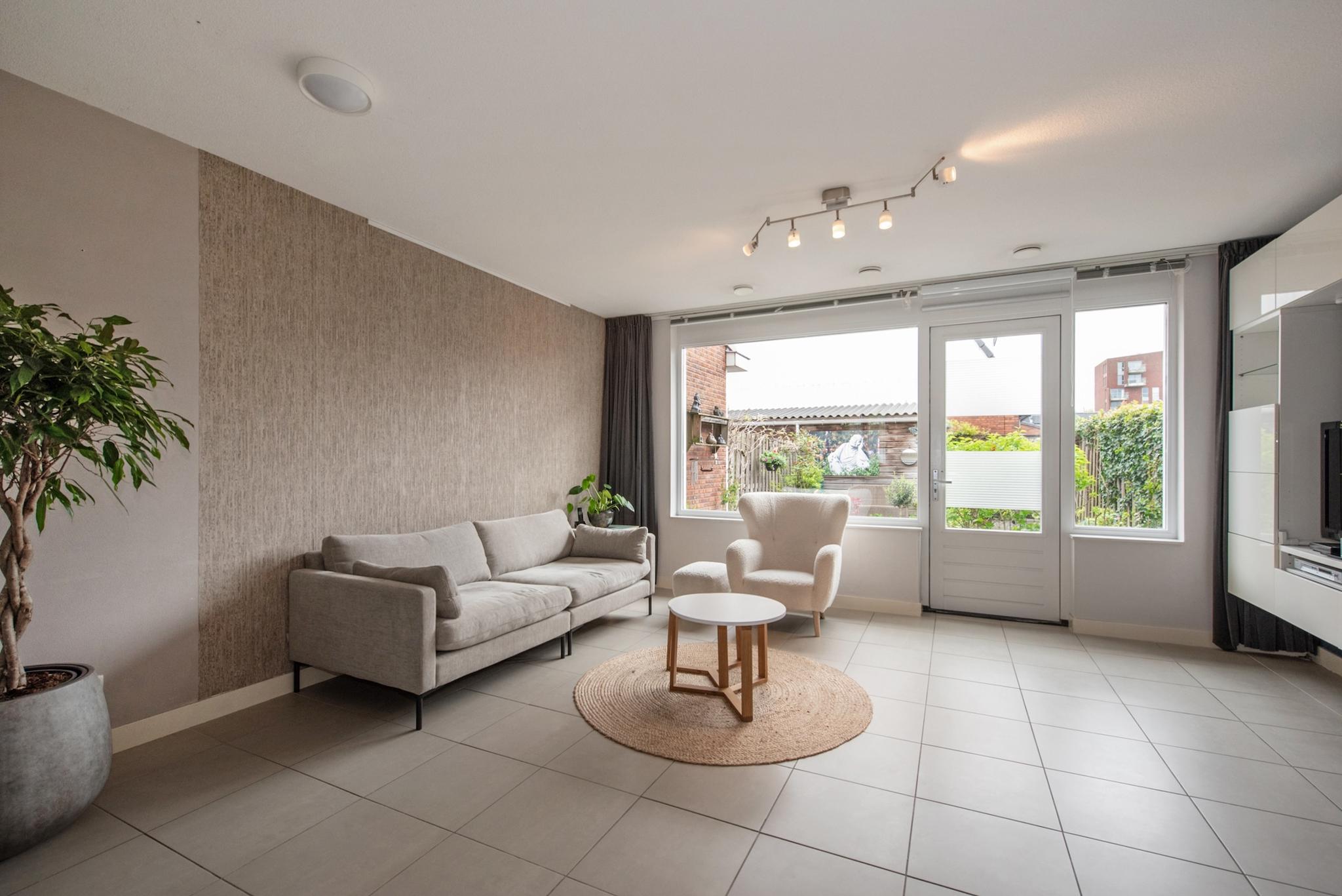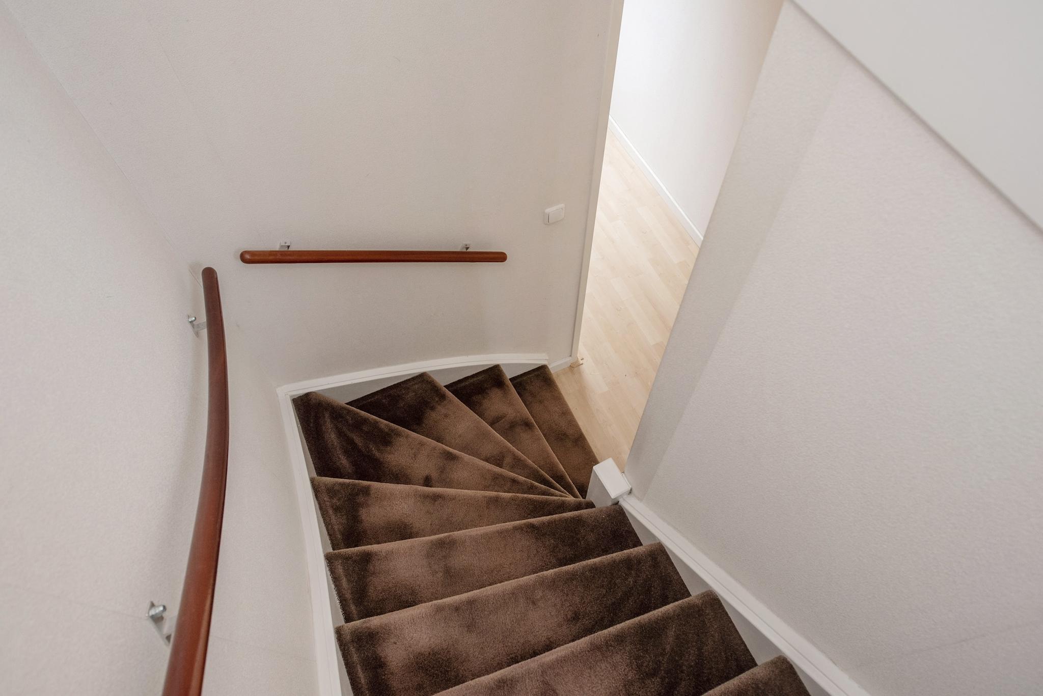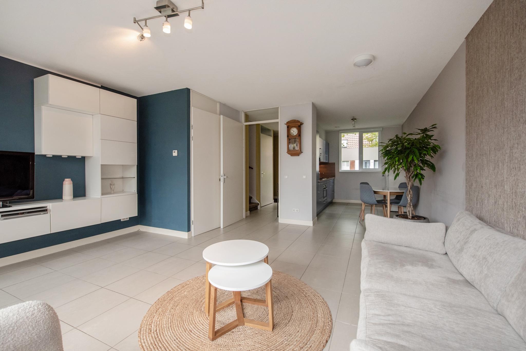 De moderne woonkamer straalt een gevoel van luxe en comfort uit, met een handige trapkast inclusief inzetkast voor extra opbergruimte.