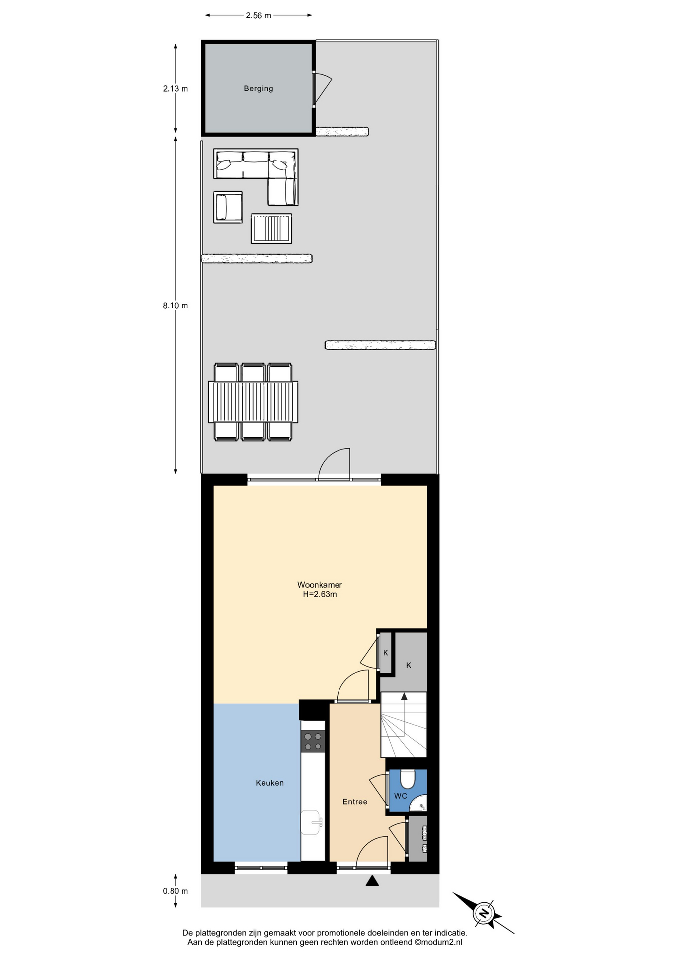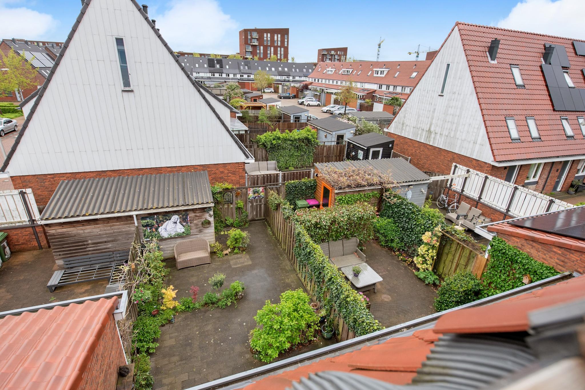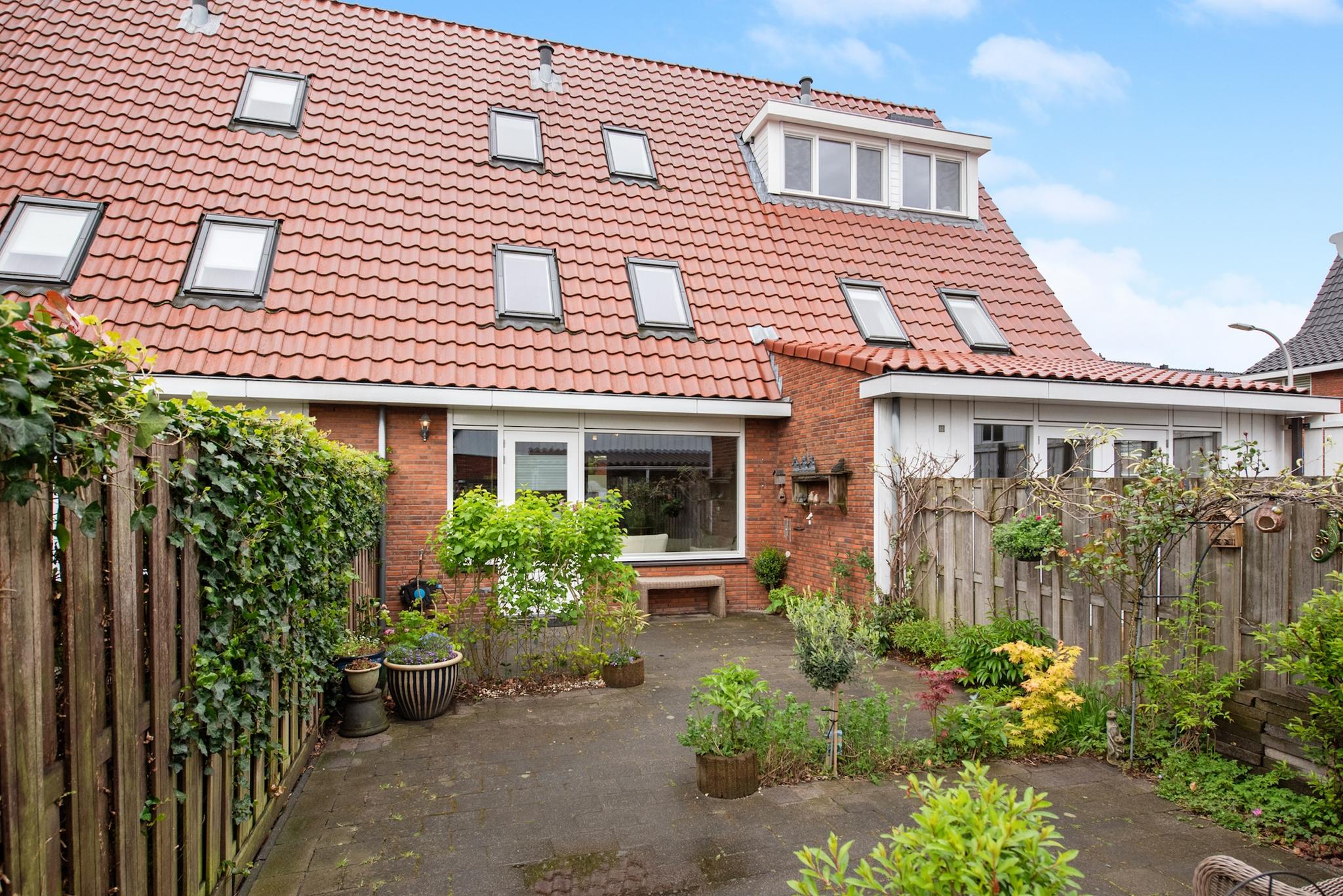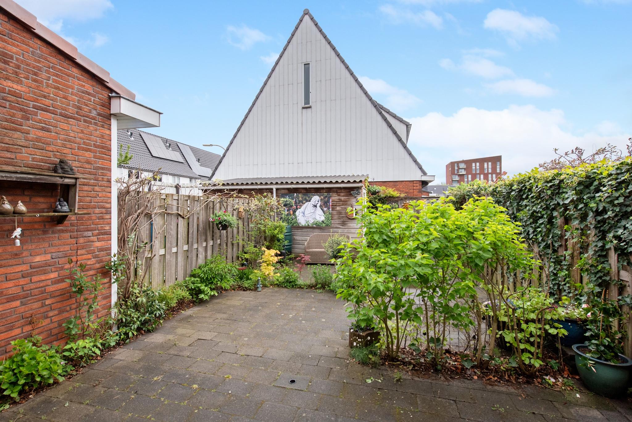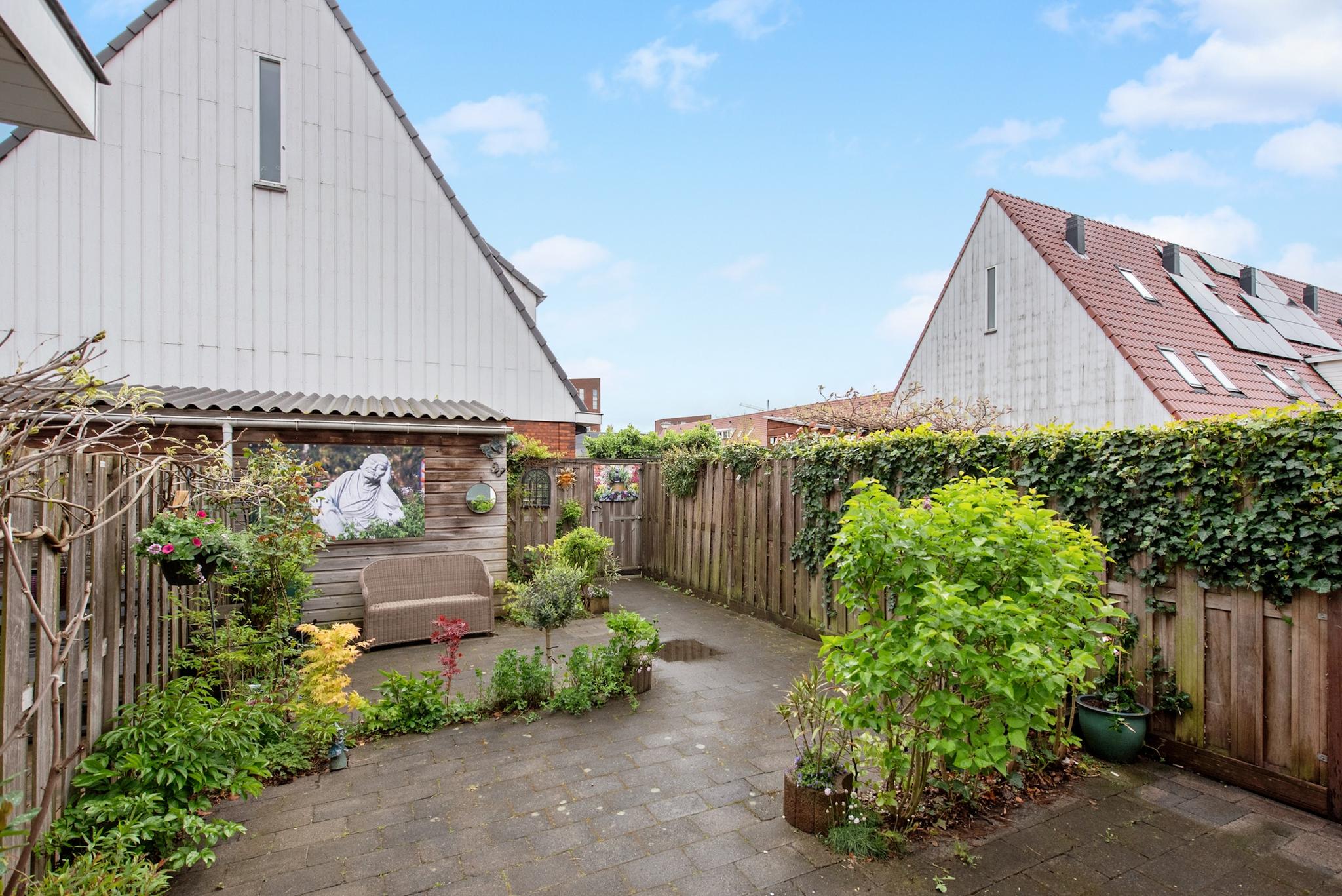De gezellige achtertuin is prachtig aangelegd met sierbestrating en beplanting. Een houten vrijstaande berging met elektra biedt extra opslagruimte, terwijl een achterom je snel toegang geeft tot je eigen parkeerplaats.