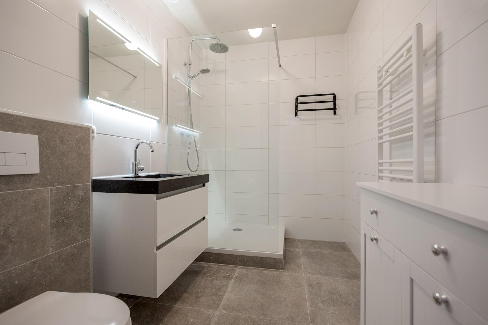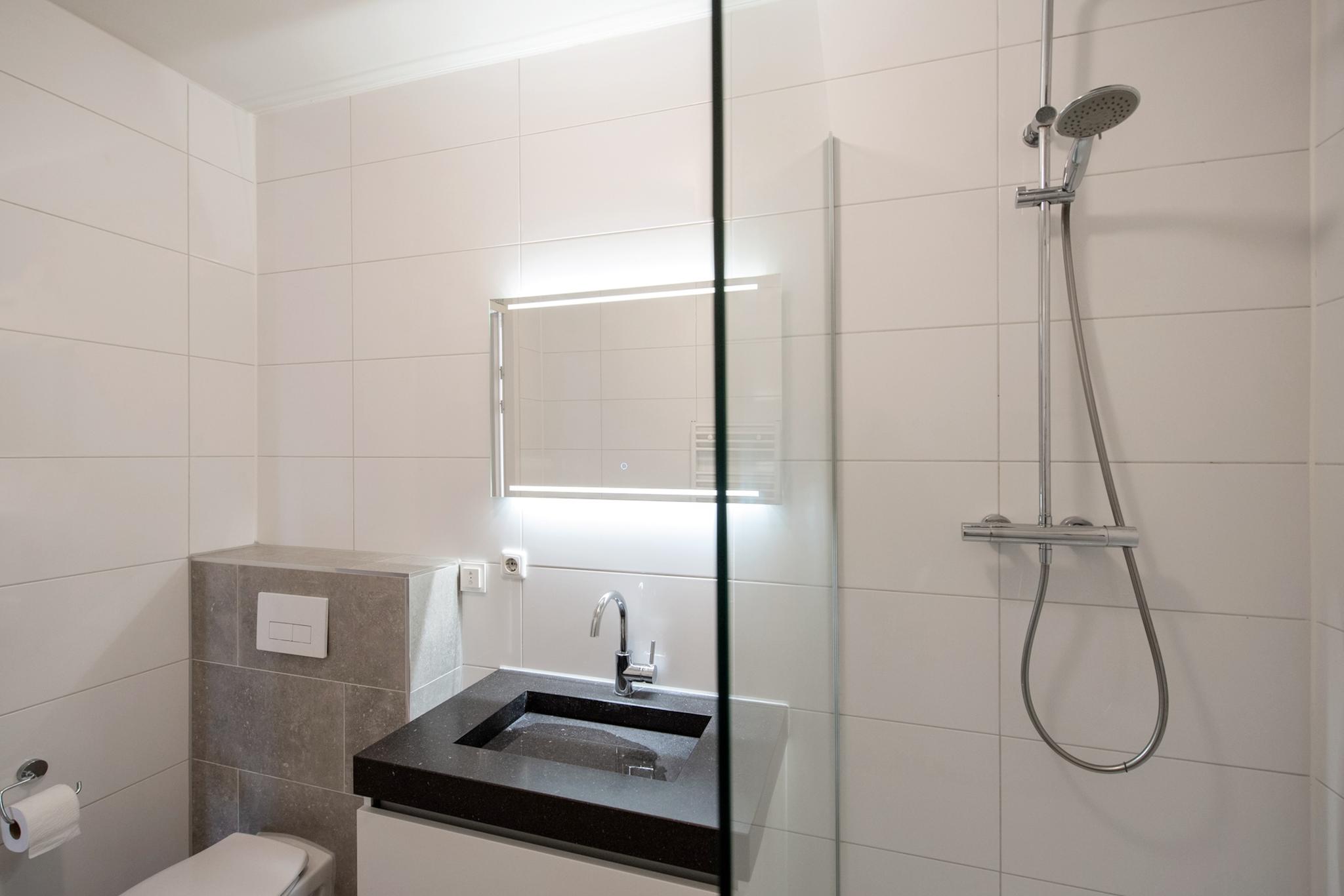 De moderne badkamer is geplaatst in 2022 en voorzien van een ruime inloopdouche, toilet, wastafel en een spiegel met verlichting.