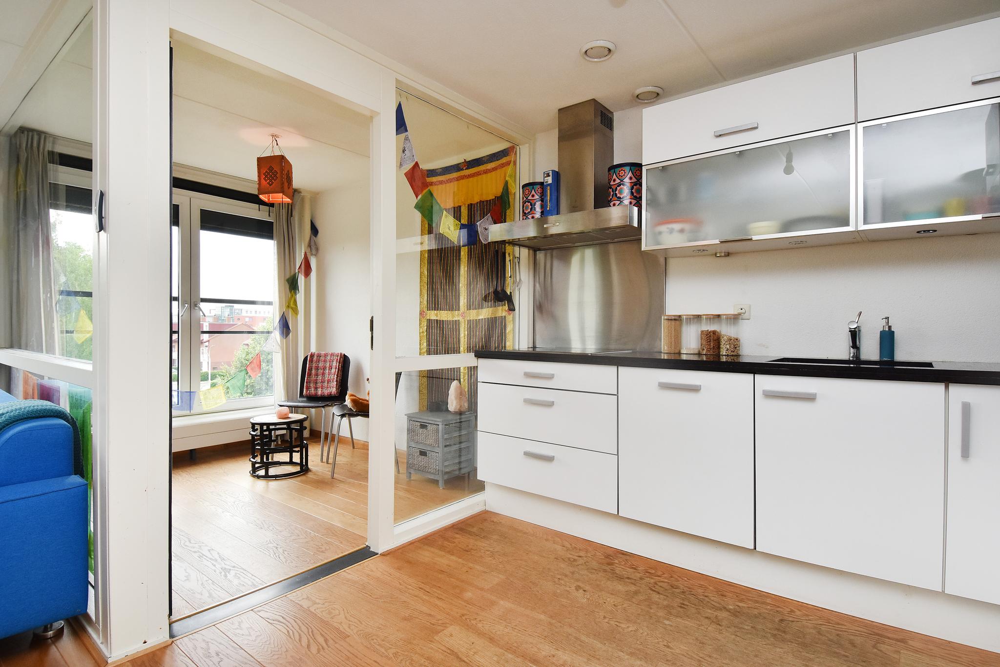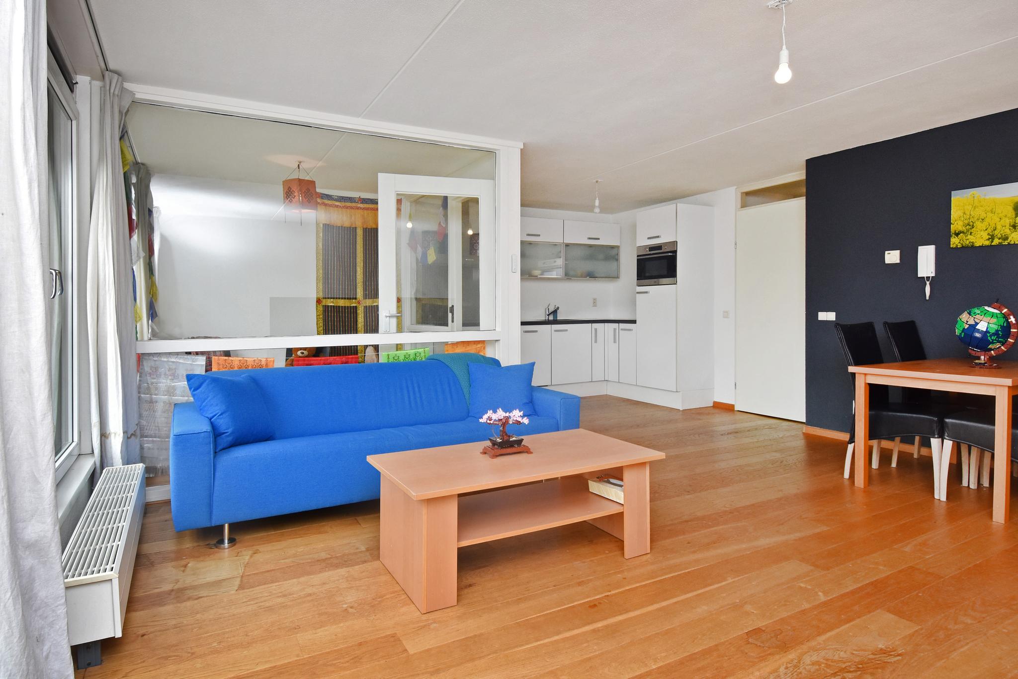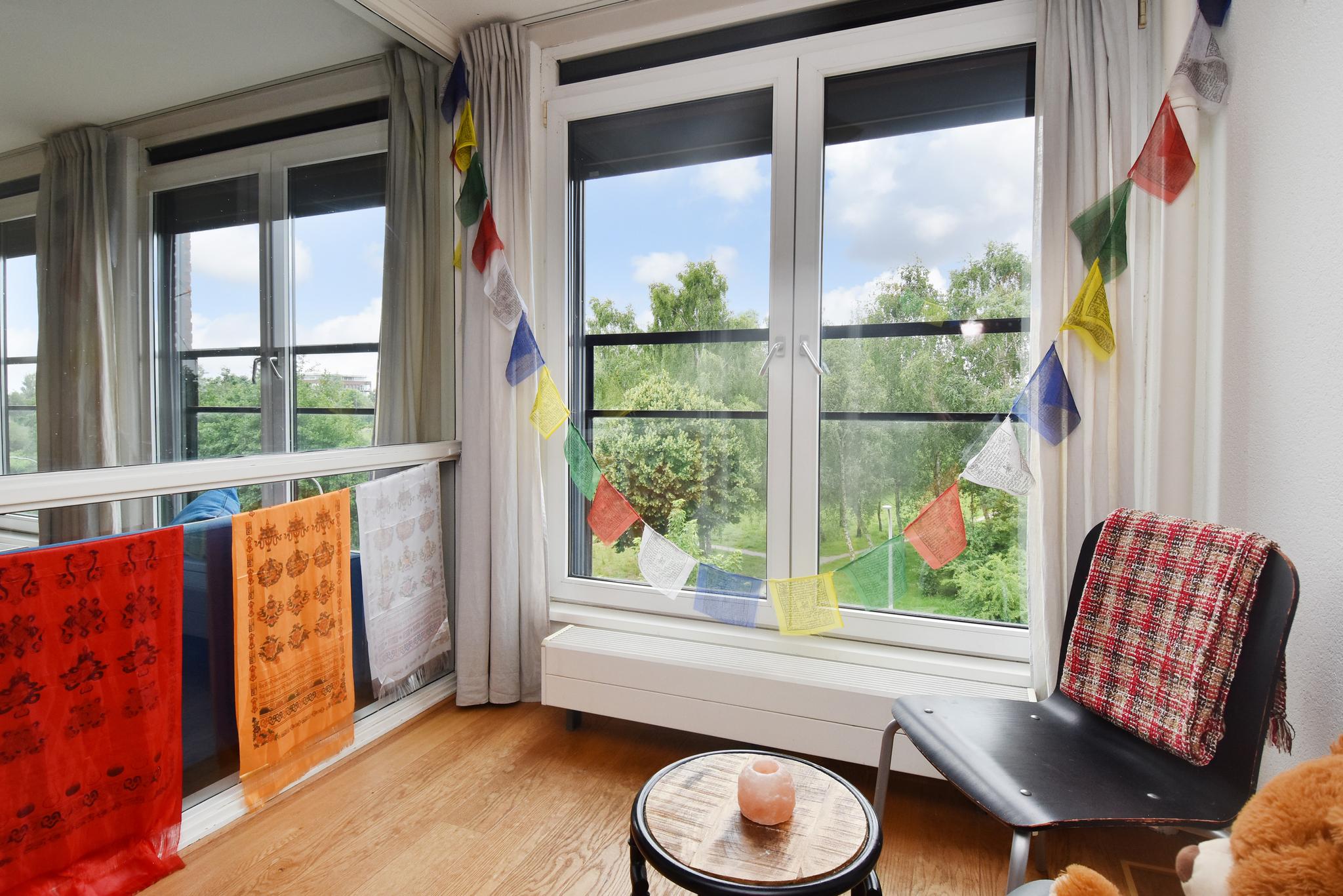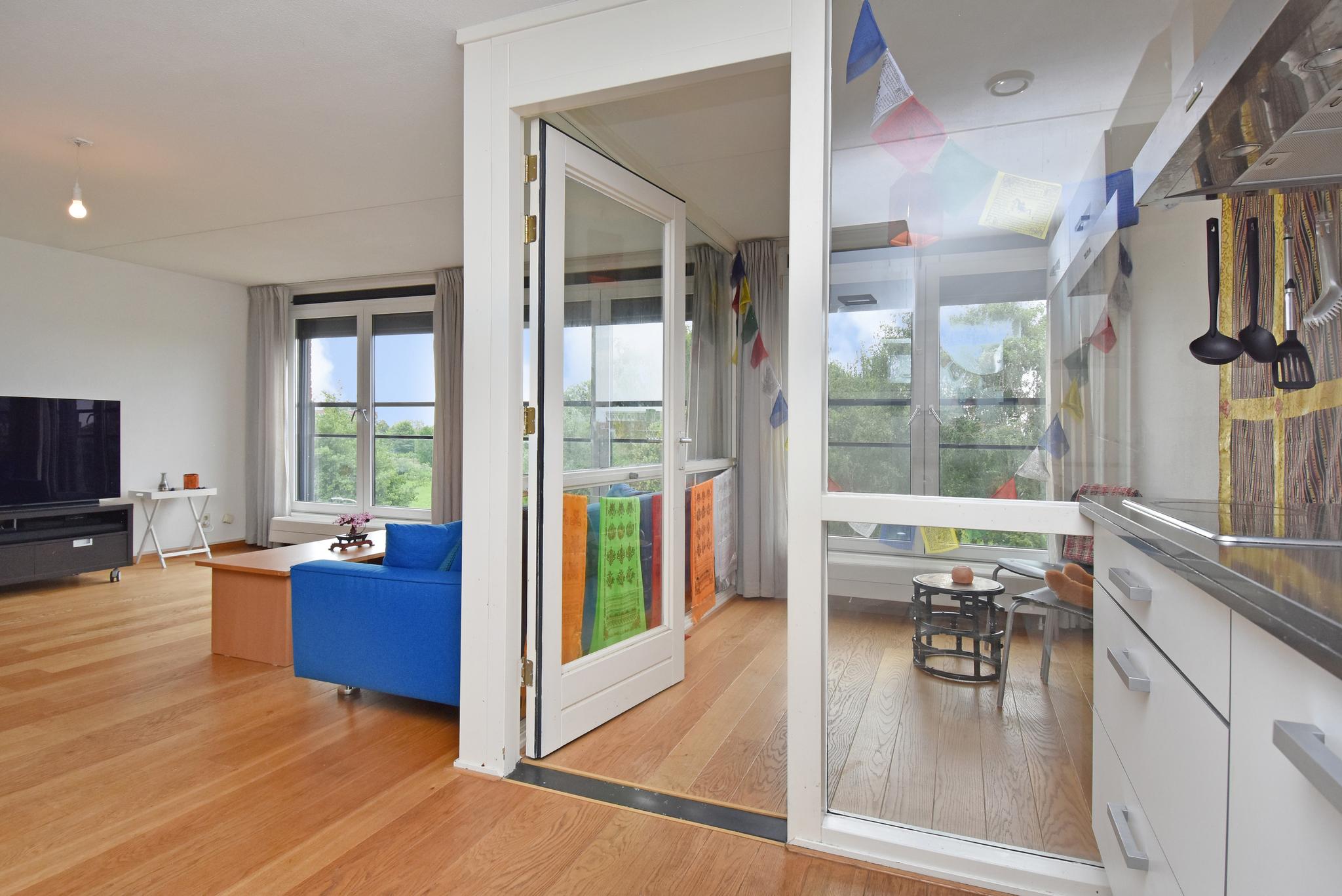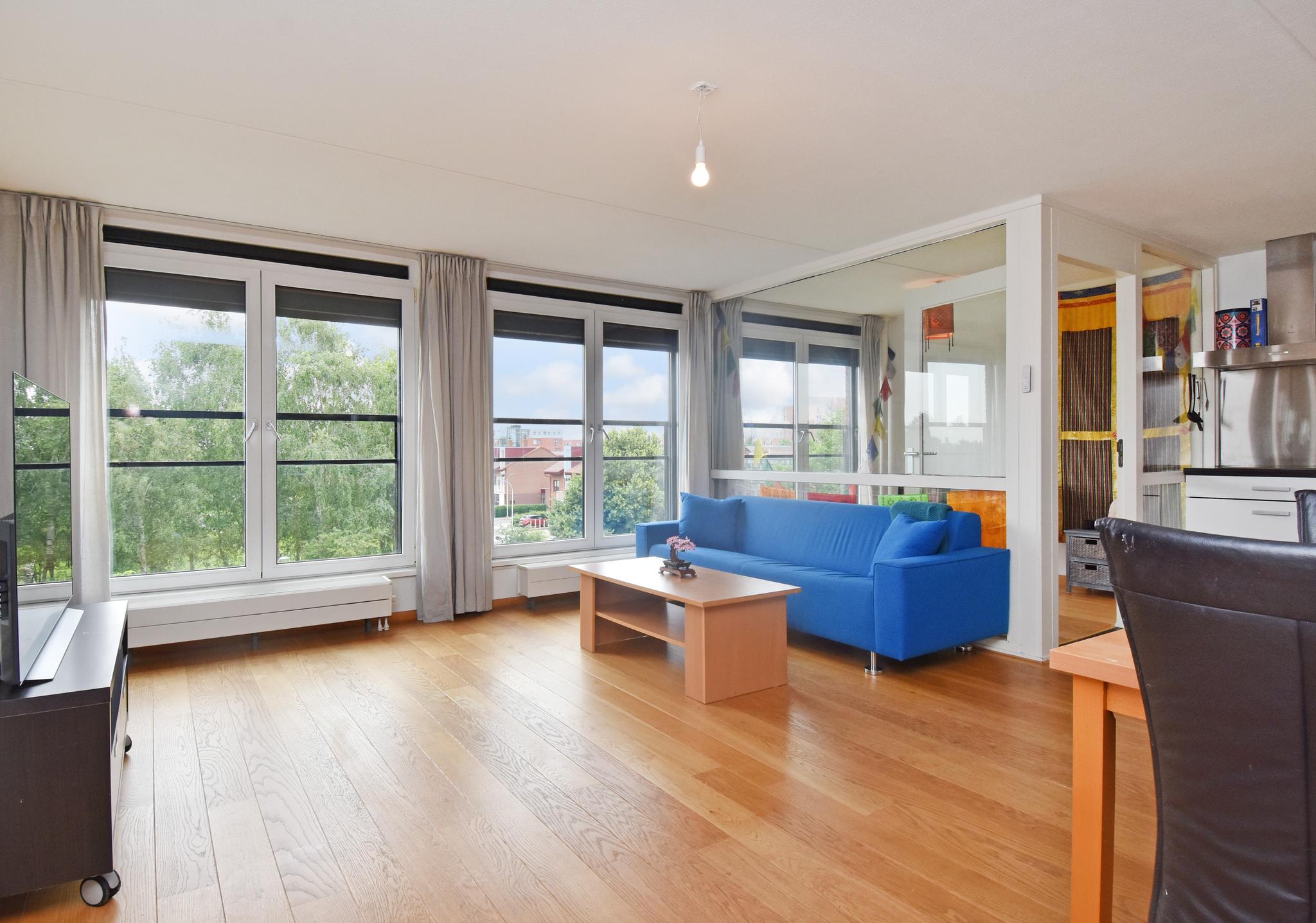 Wat een heerlijke ruimte! Een lichte woonkamer met grote ramen en een open keuken met uitzicht op het park.