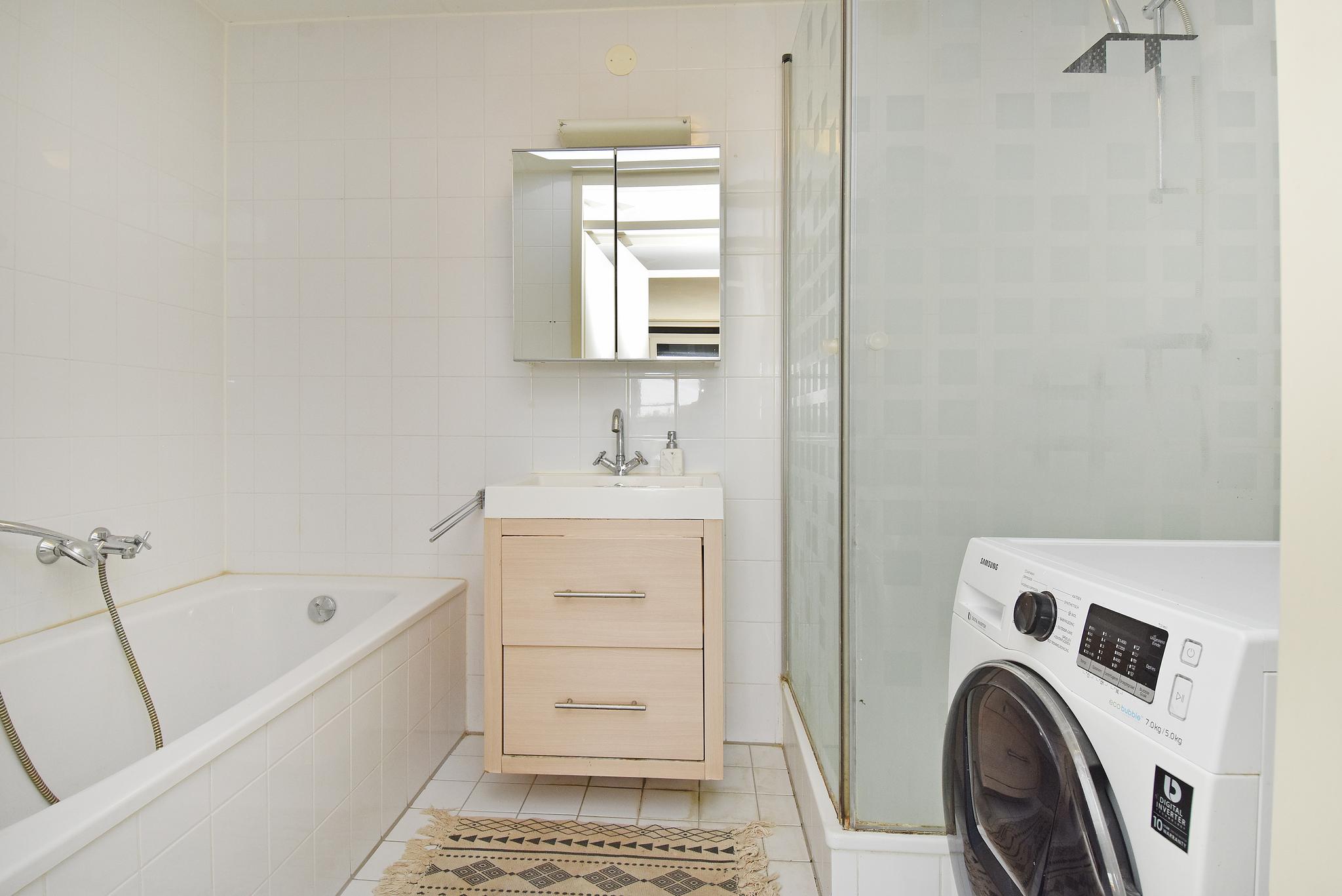 De badkamer is voorzien van een ligbad, douche, wastafel en wasmachineaansluiting.