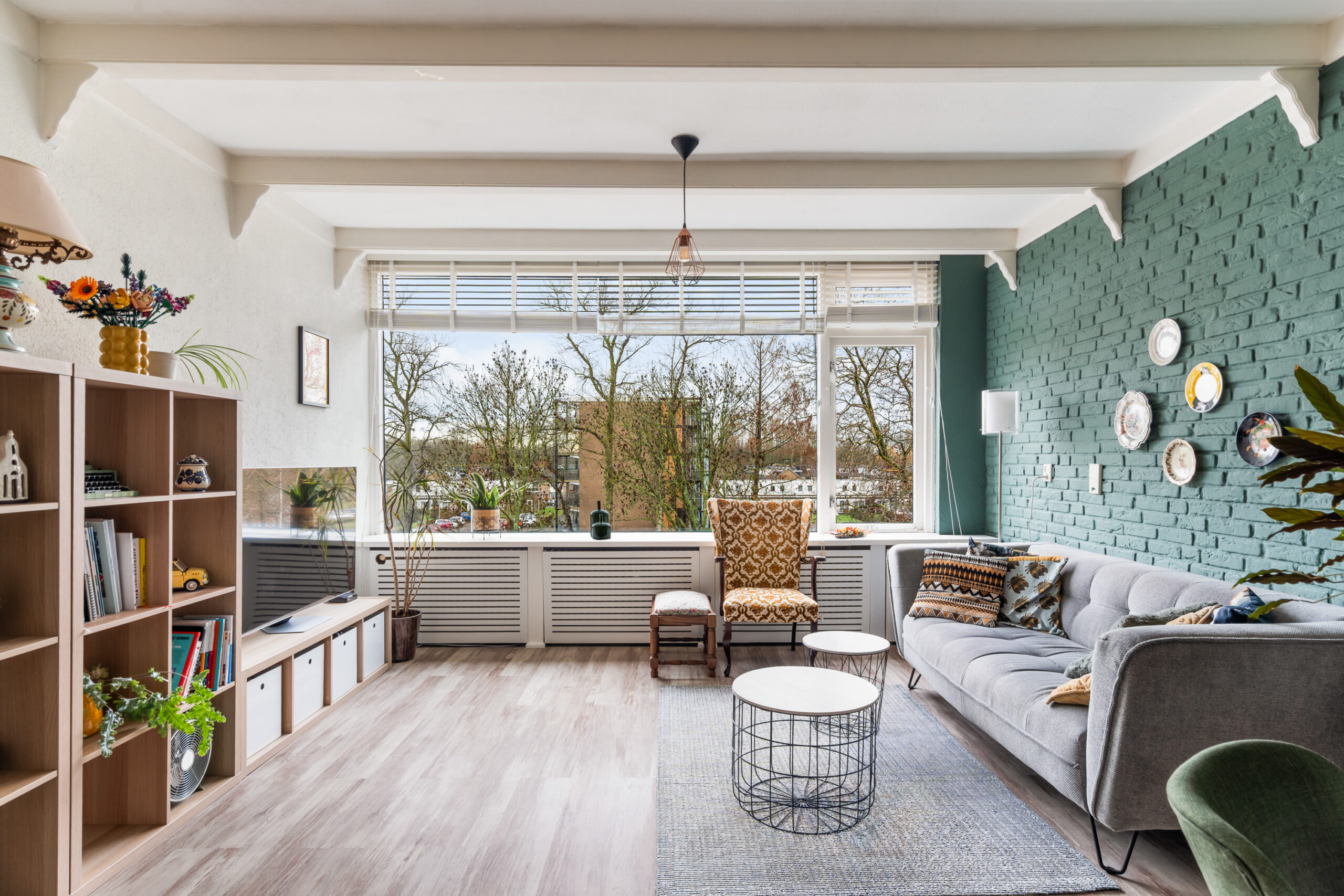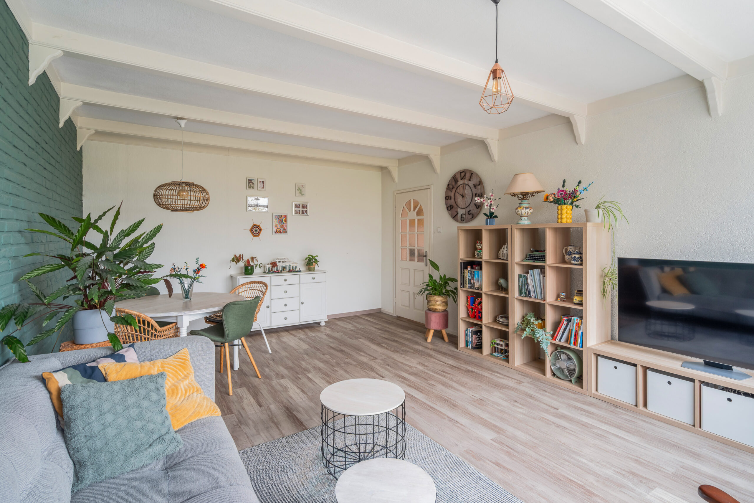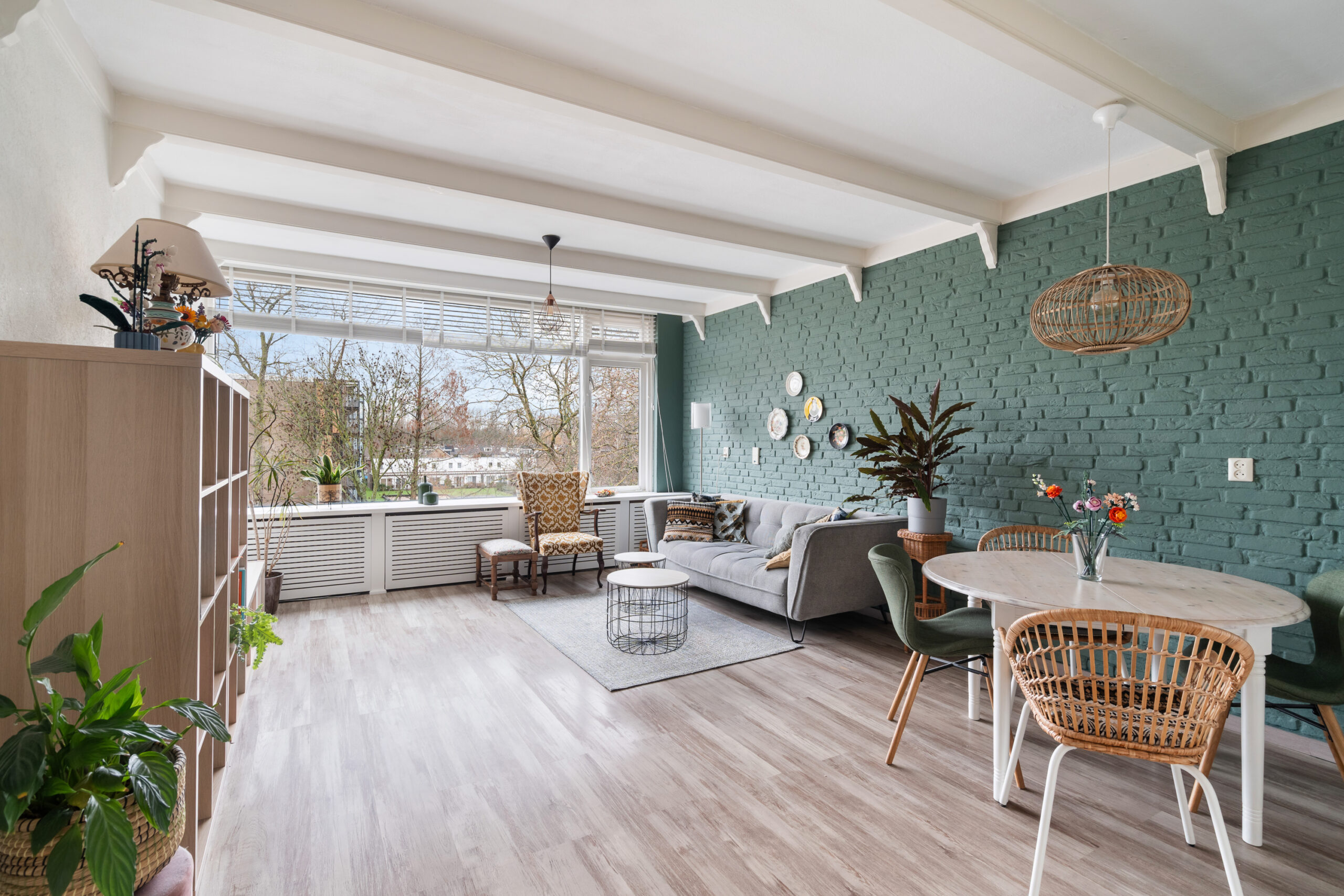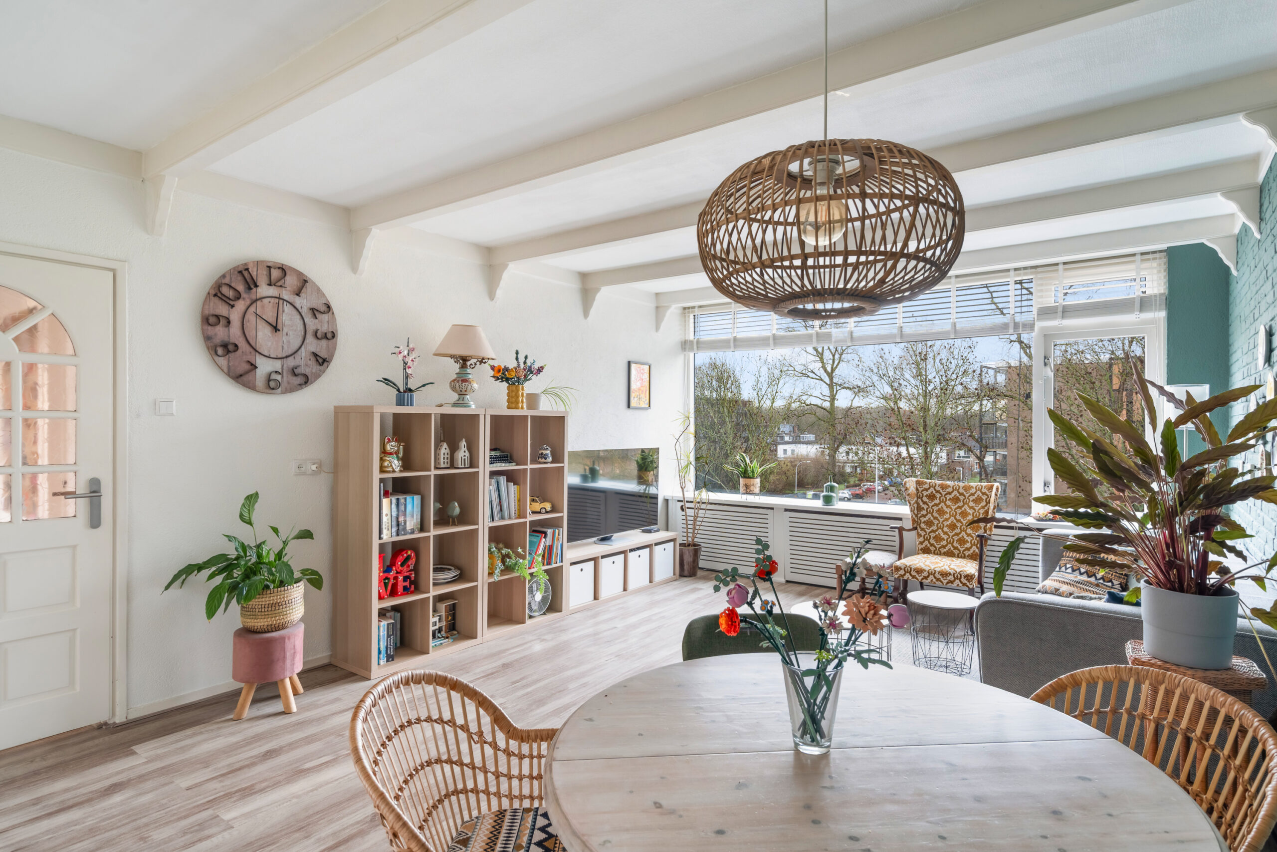 De woonkamer is licht en ruim dankzij de grote raampartijen en biedt een prettige leefruimte.