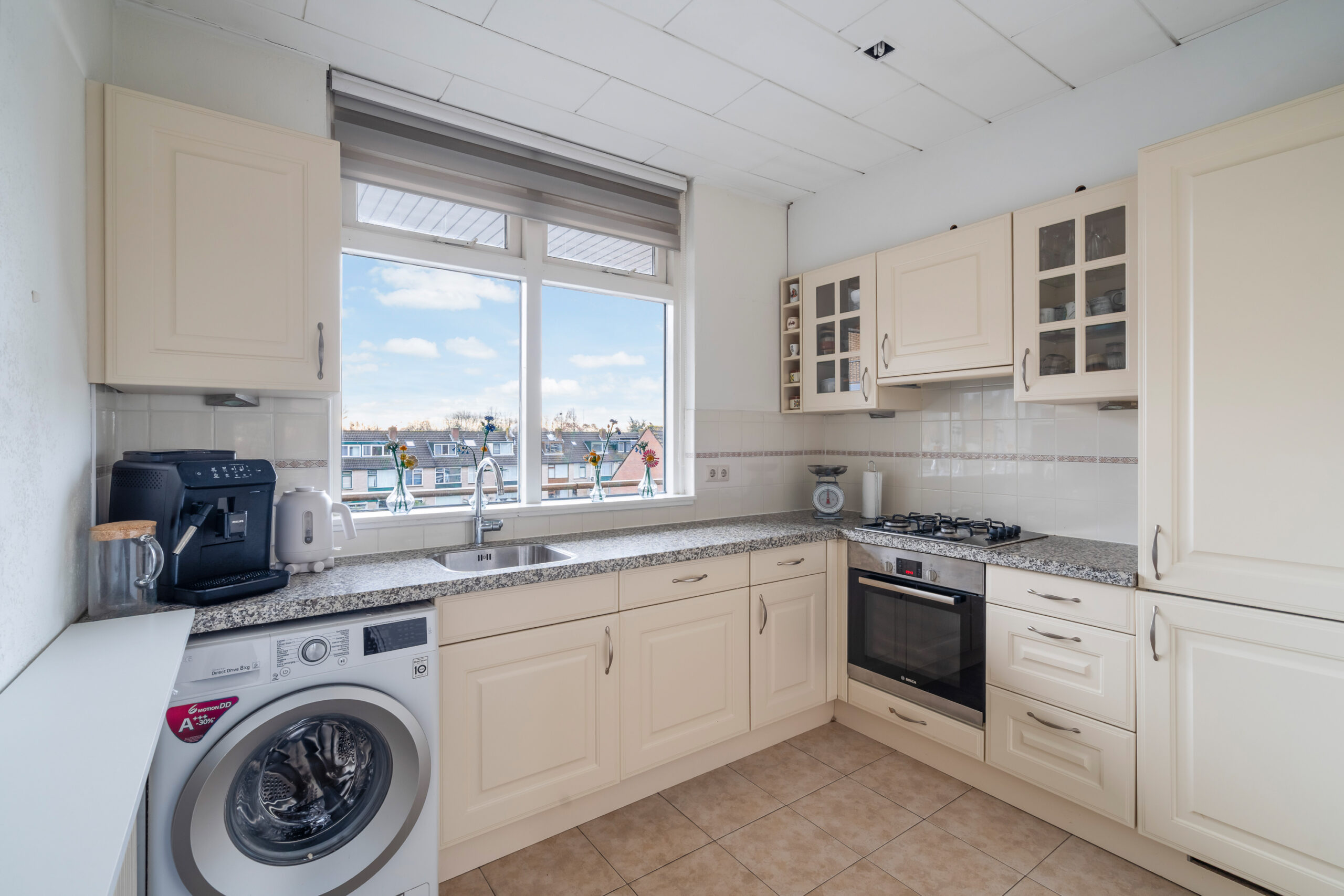 De keuken is aan de voorzijde gelegen en voorzien van diverse inbouwapparatuur en een wasmachineaansluiting.