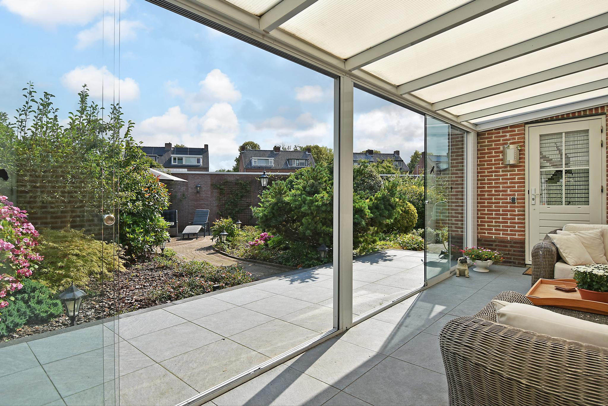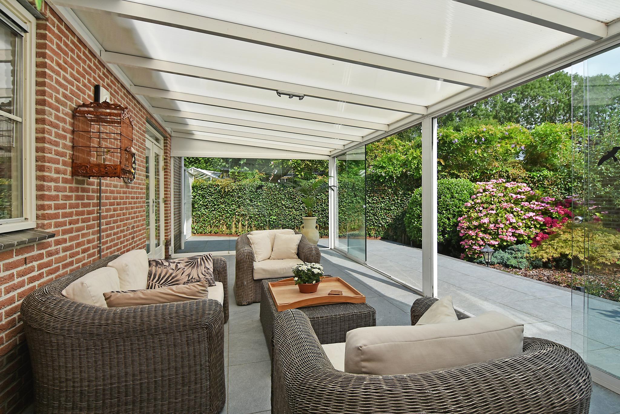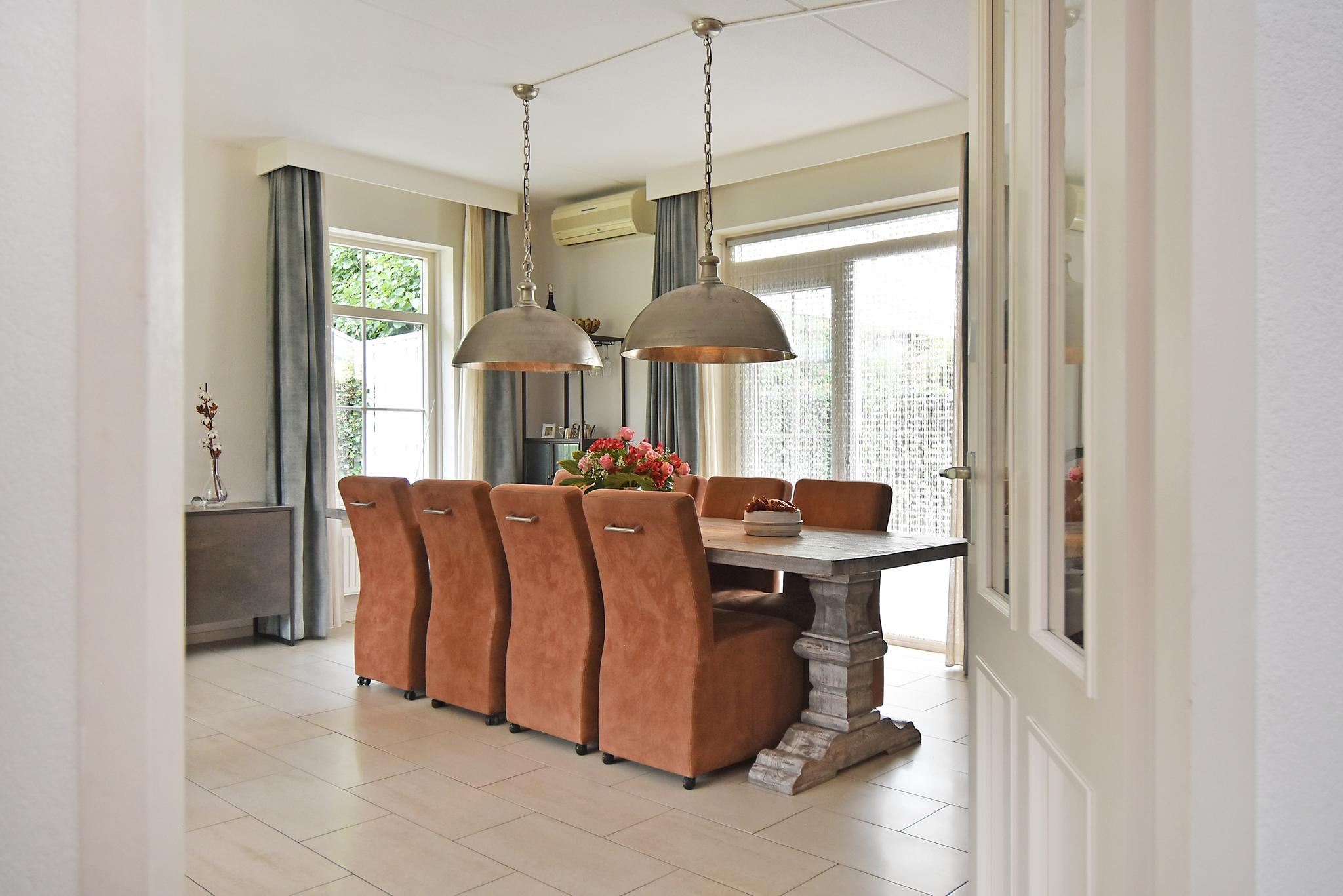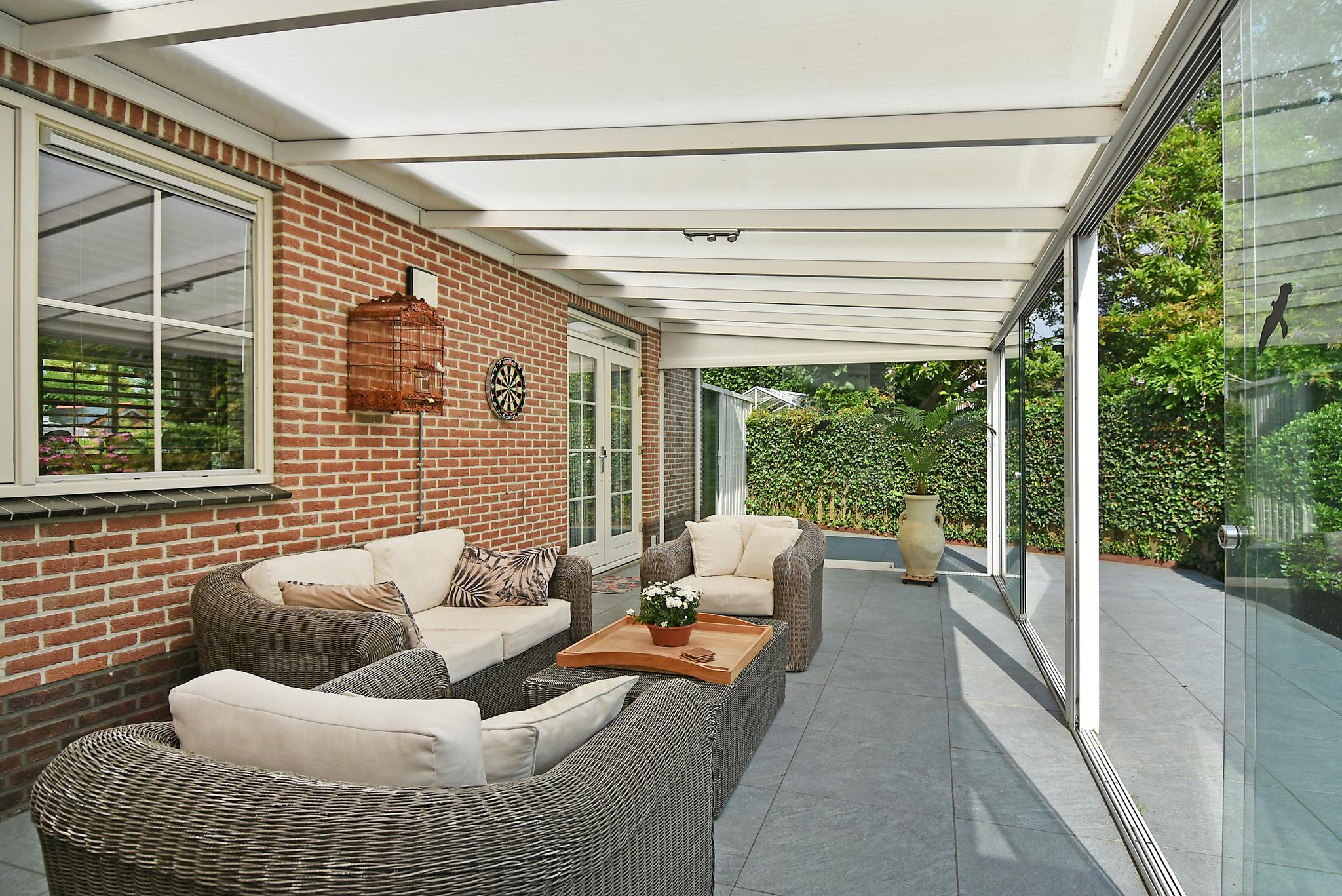 Ruime L-vormige woonkamer tevens voorzien van airco met veel lichtinval en openslaande deuren naar veranda. De veranda kan ook volledig afgesloten worden, hierdoor is het optimaal genieten van de achtertuin zonder afhankelijkheid van weersomstandigheden.