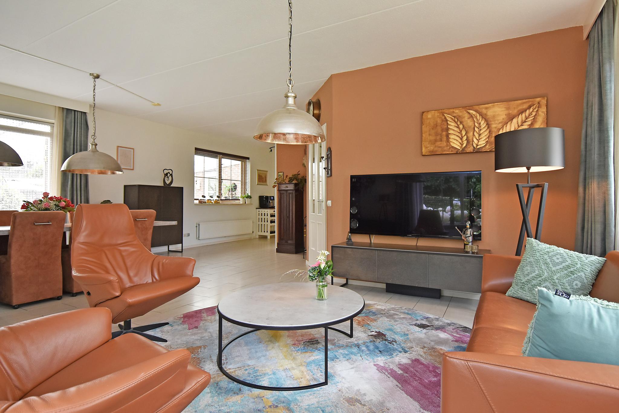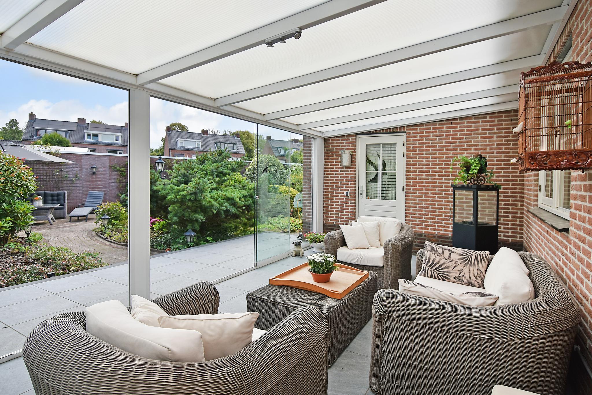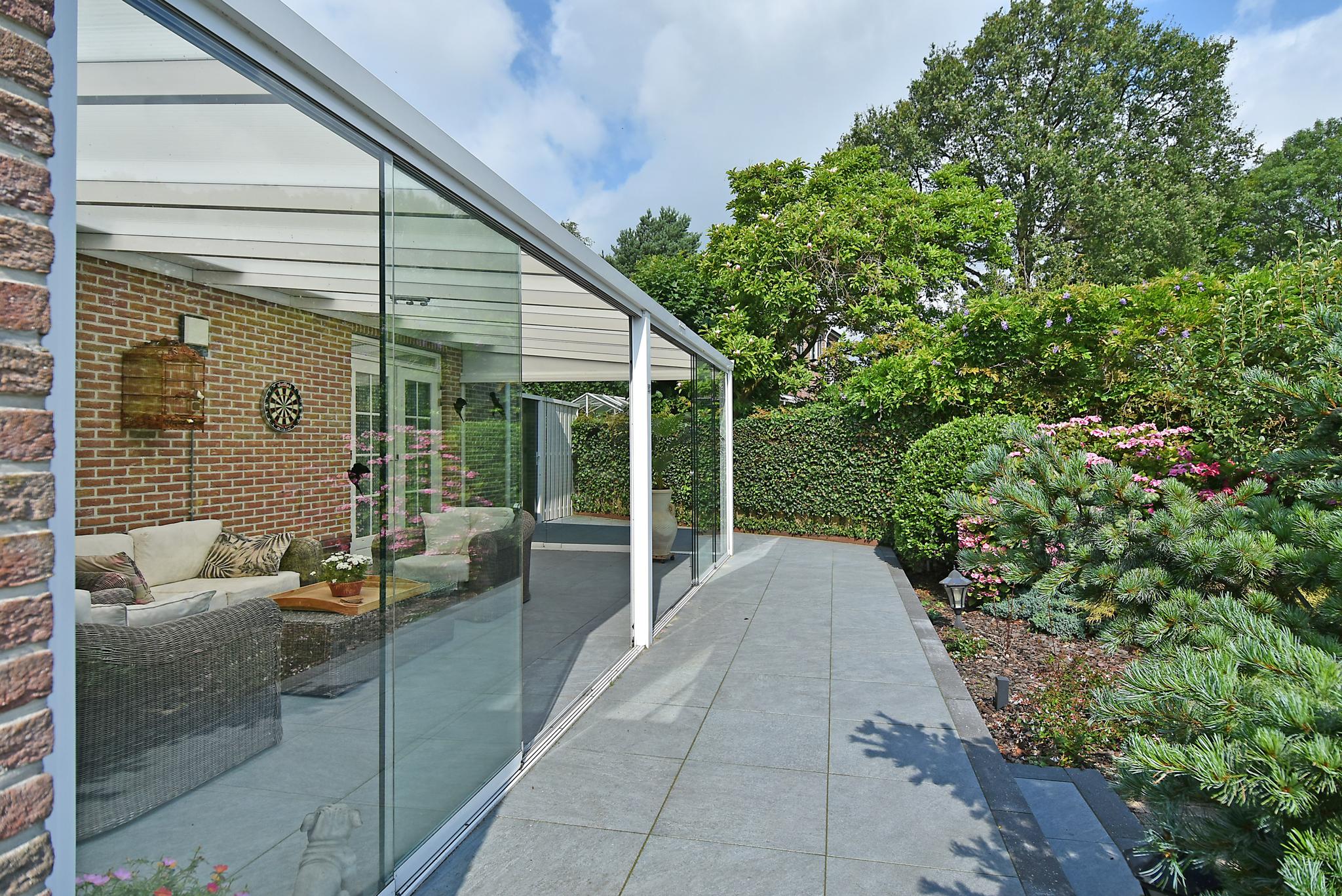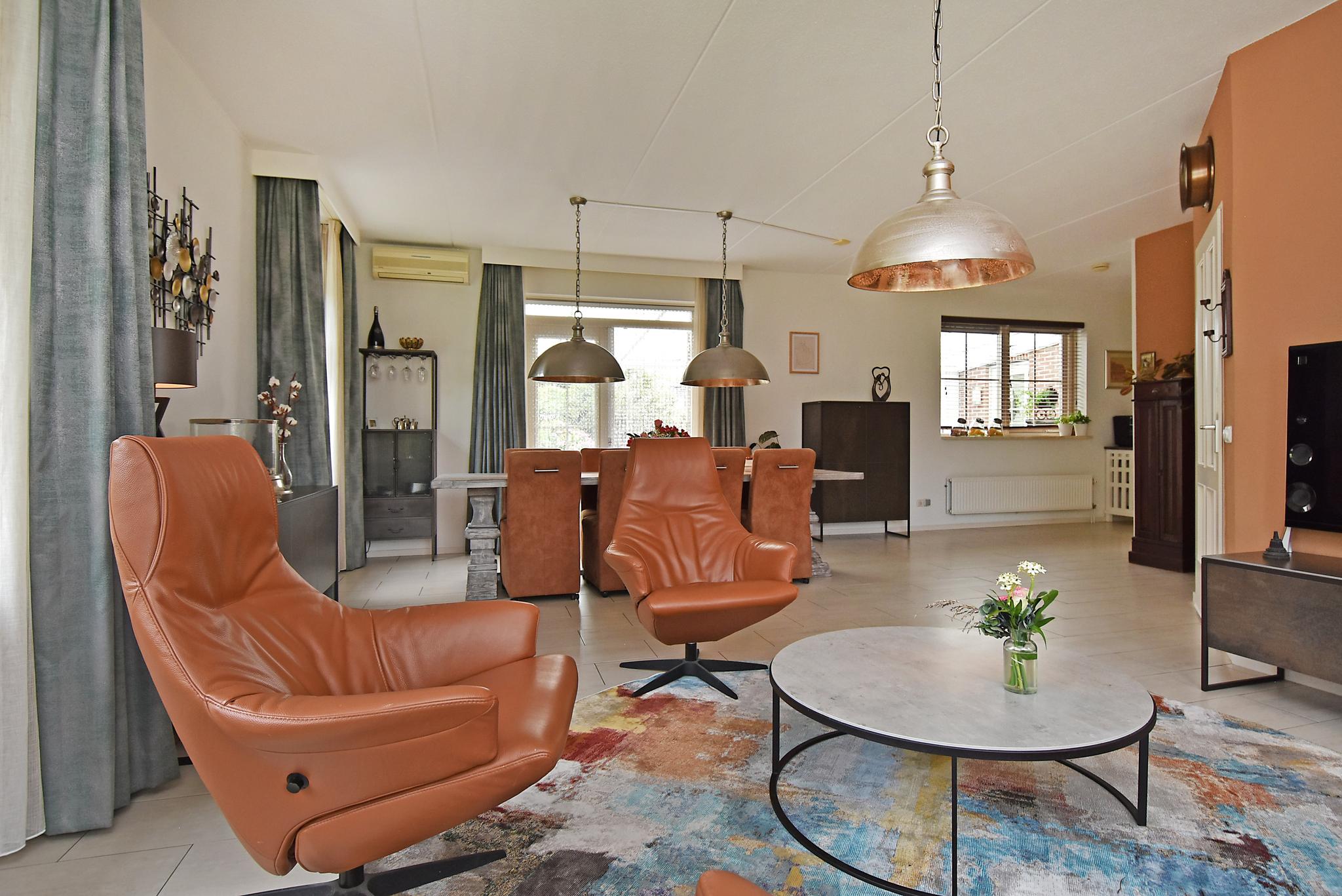 Ruime L-vormige woonkamer tevens voorzien van airco met veel lichtinval en openslaande deuren naar veranda. De veranda kan ook volledig afgesloten worden, hierdoor is het optimaal genieten van de achtertuin zonder afhankelijkheid van weersomstandigheden.