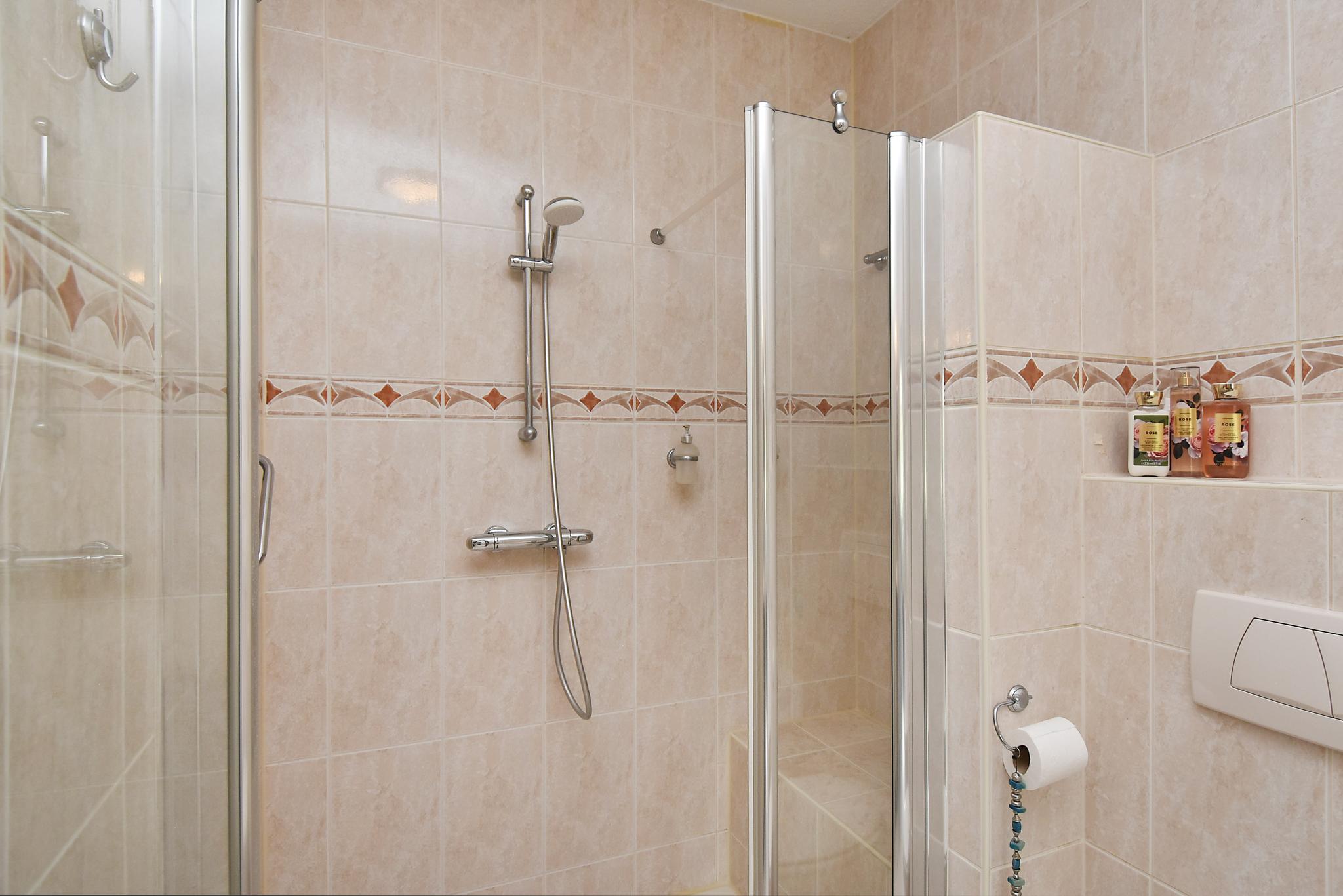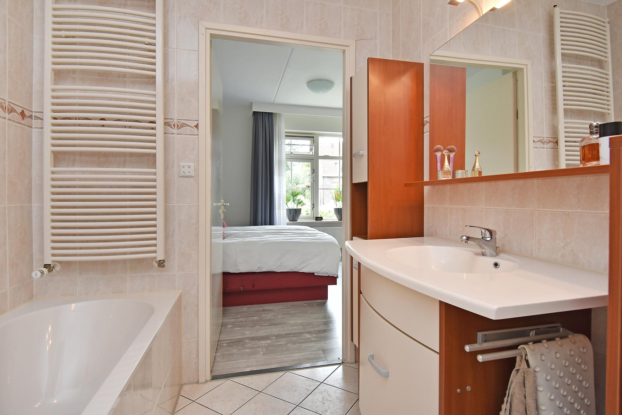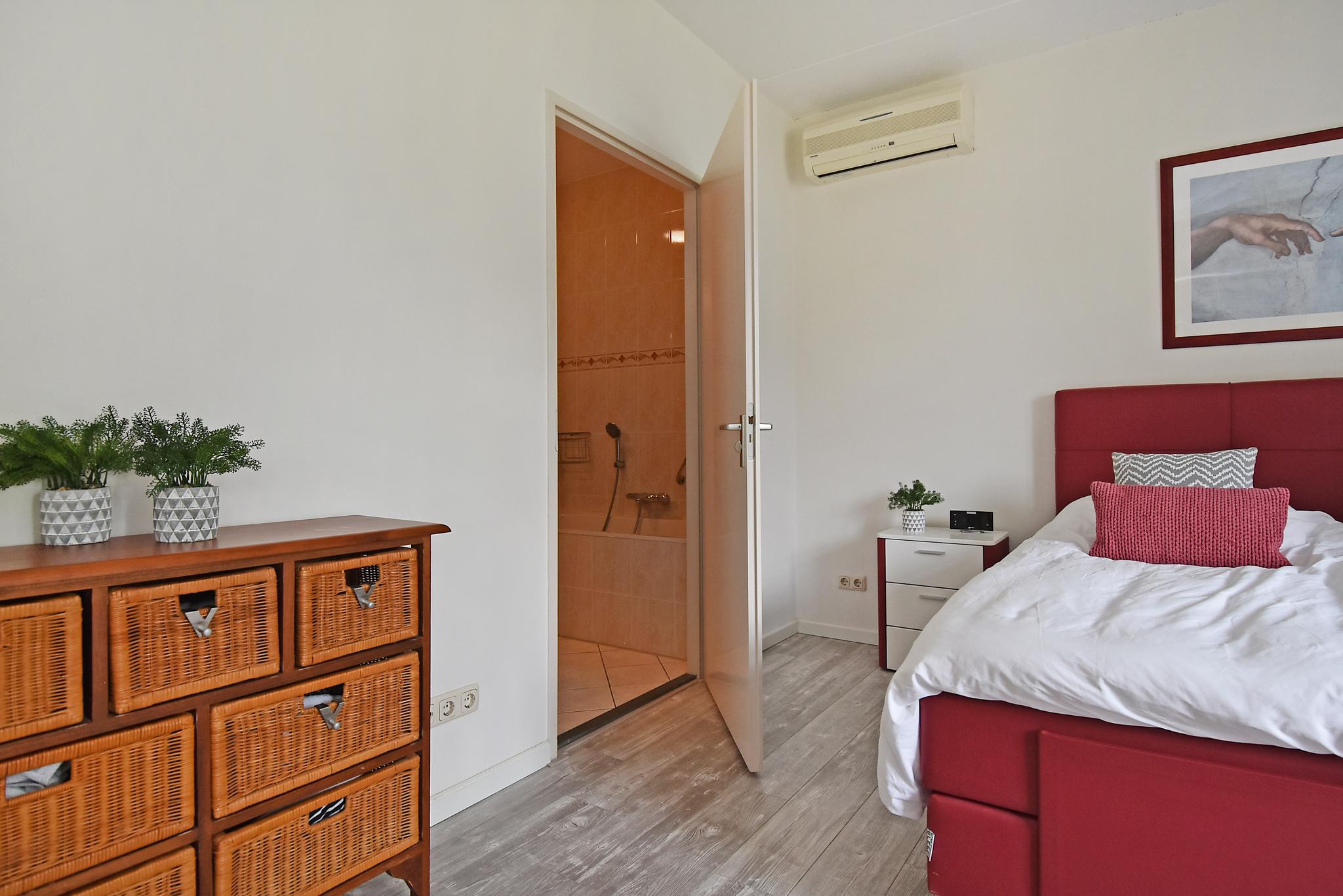 De ruime slaapkamer is voorzien van airco en laminaatvloer met toegang tot een eigen badkamer met ligbad, vaste wastafel met ombouw en wandkasten, 2e toilet en brede grote douche met zitje en afgeschermd met een glazen wand.