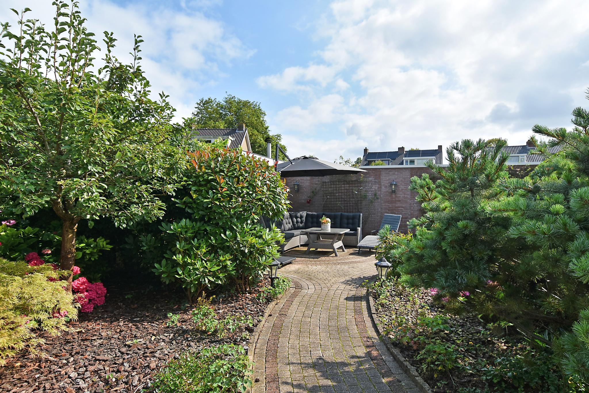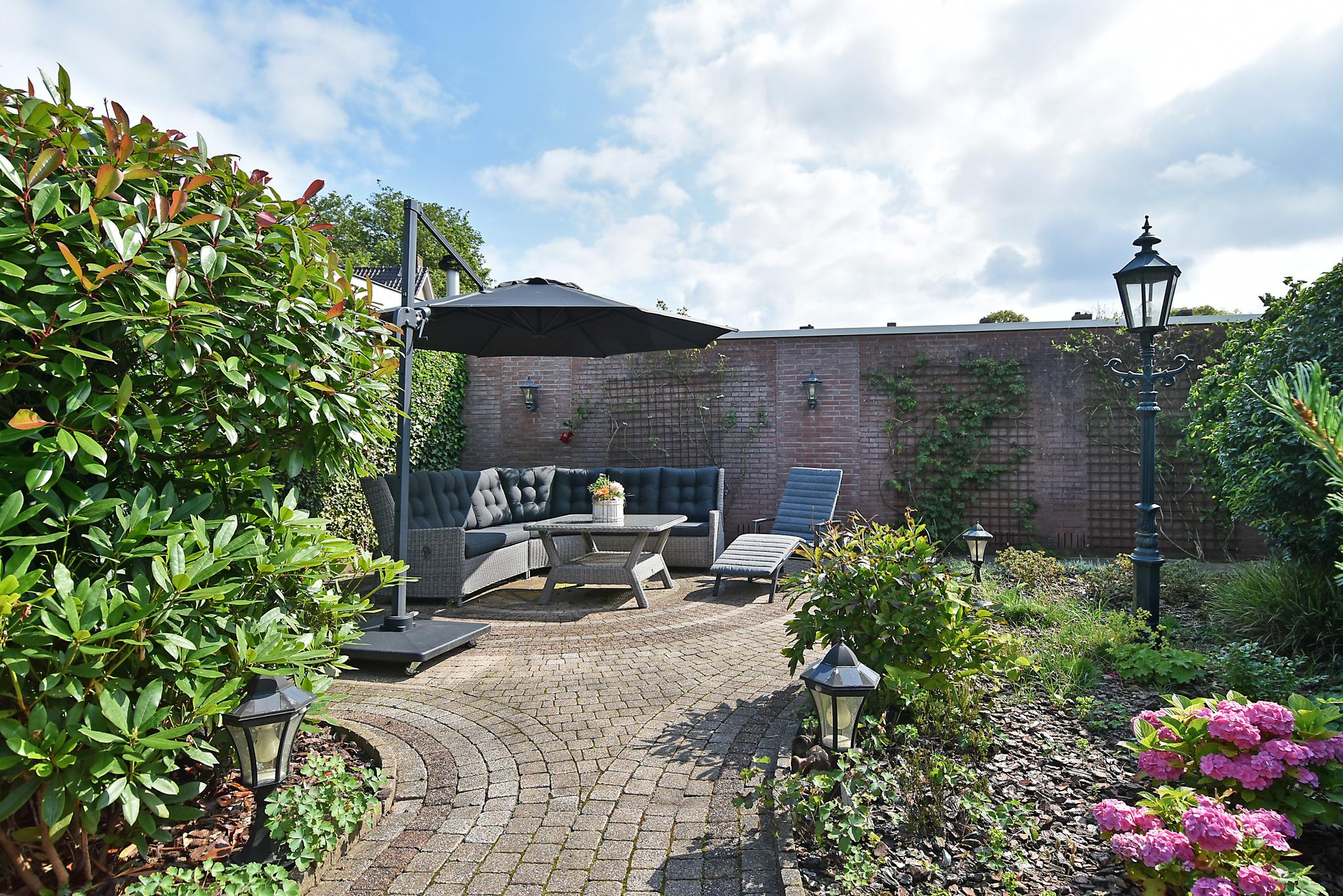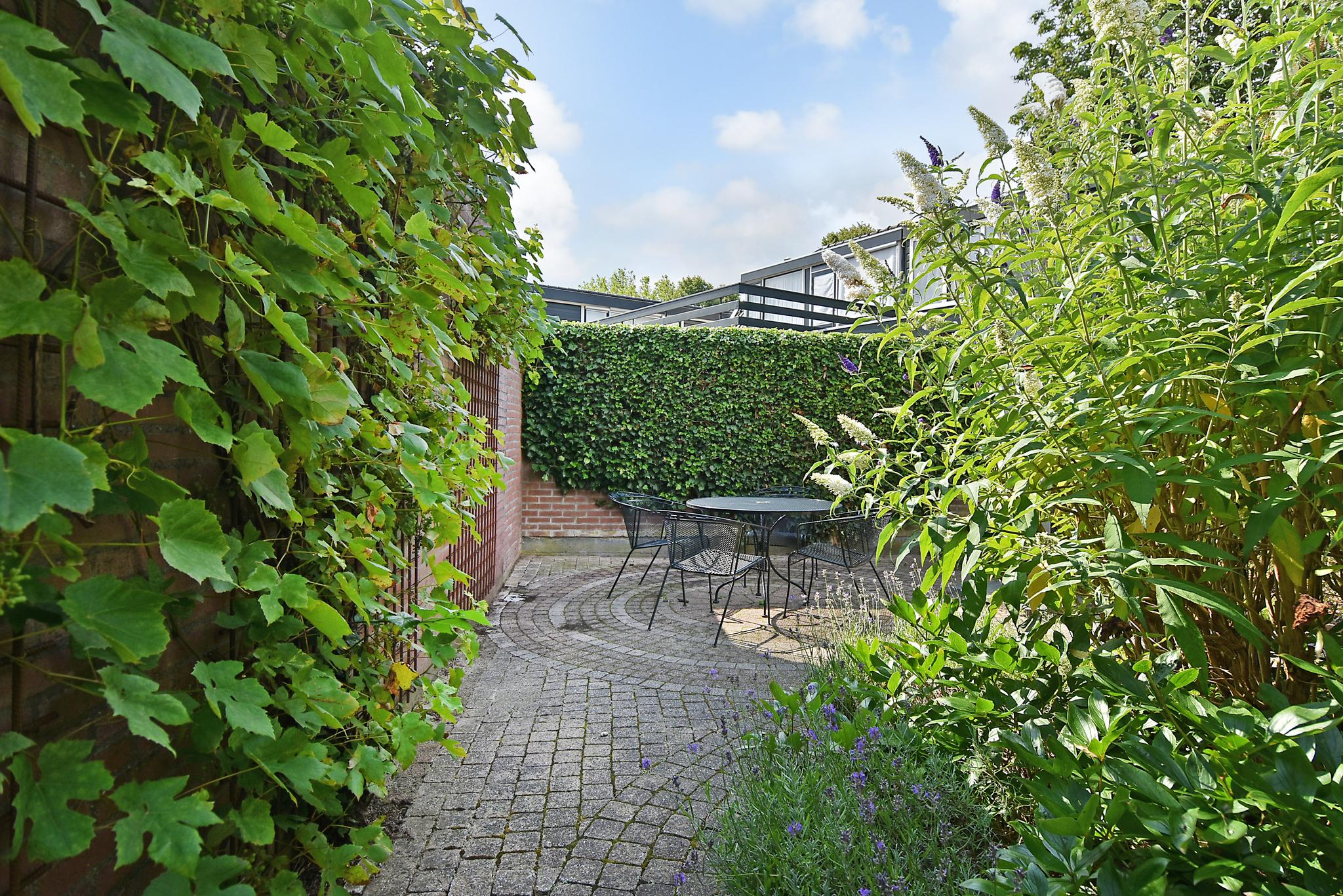 Grote voortuin met prachtige ‘Annabelles’ (hortensia’s) aangelegd. De tuin is afsluitbaar met een prachtig sier hekwerk, op eigen terrein is ruimte het parkeren van 2 auto’s.