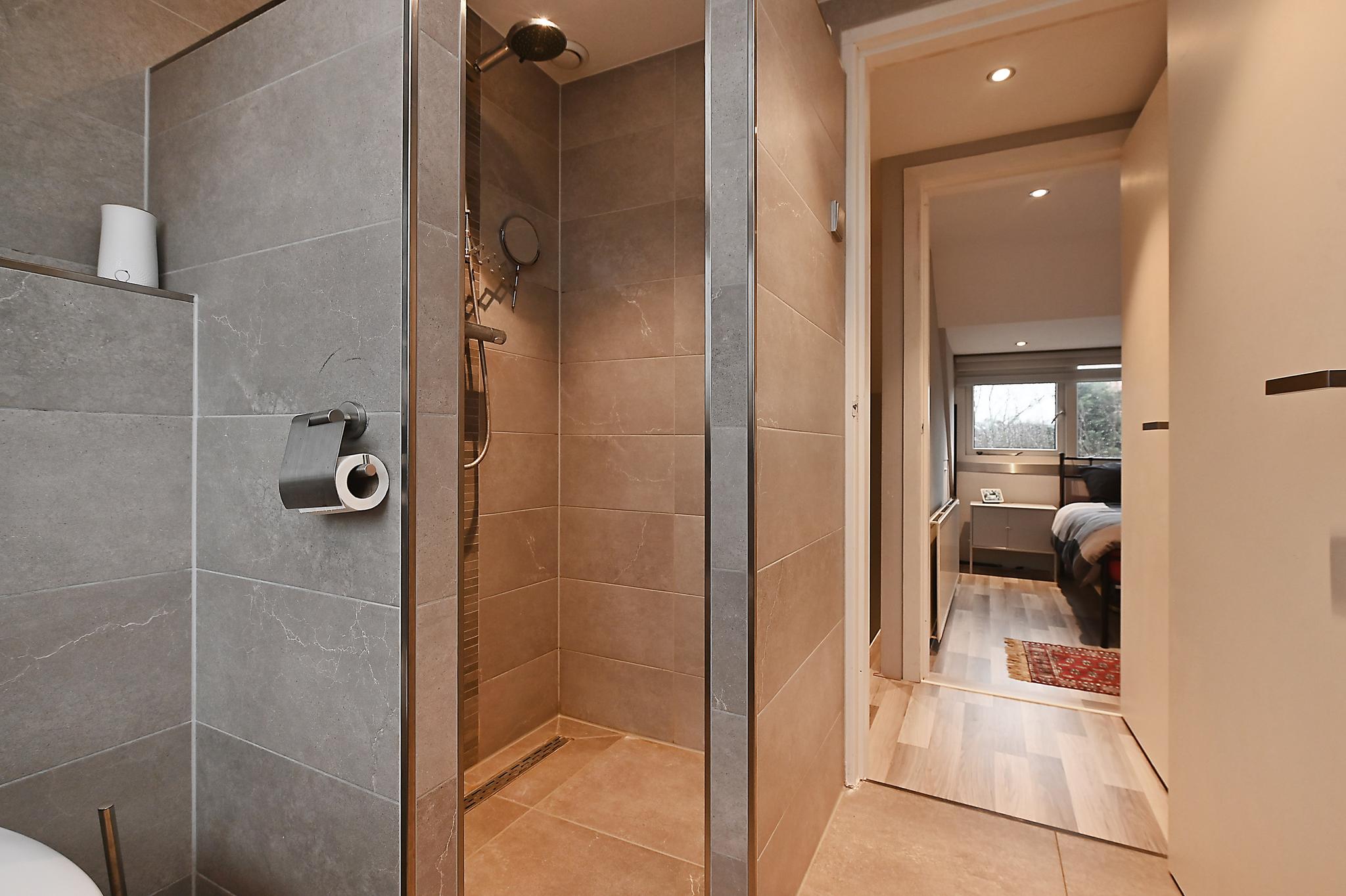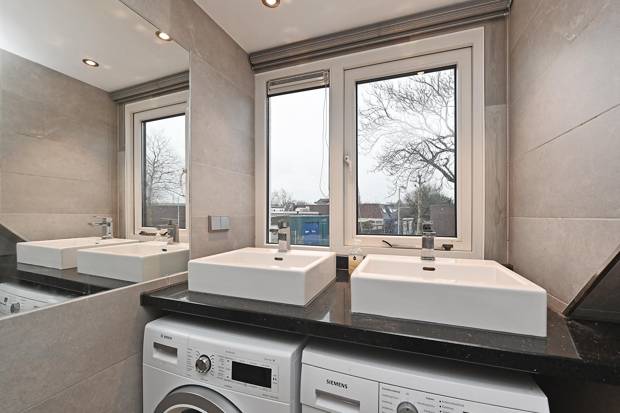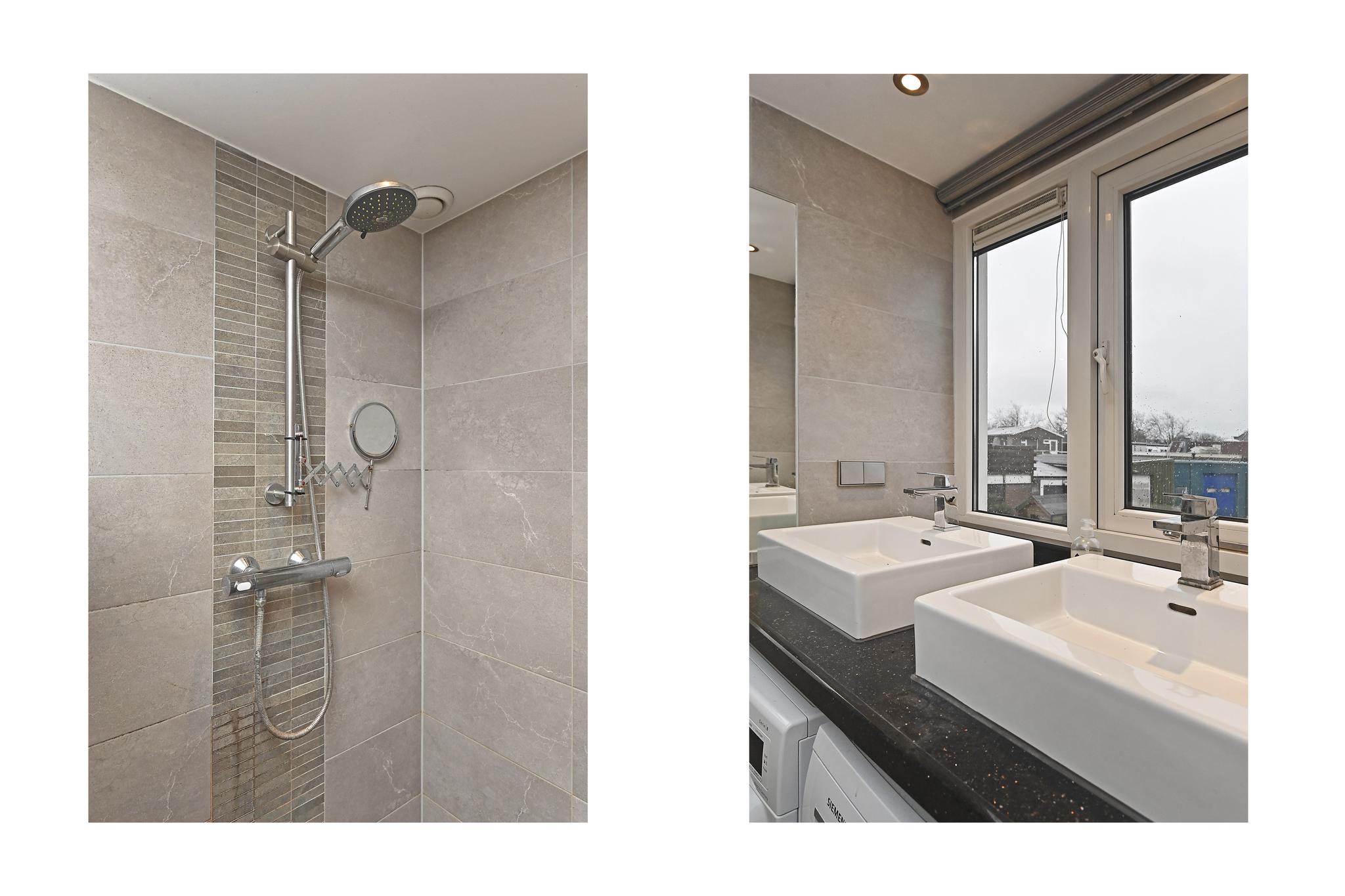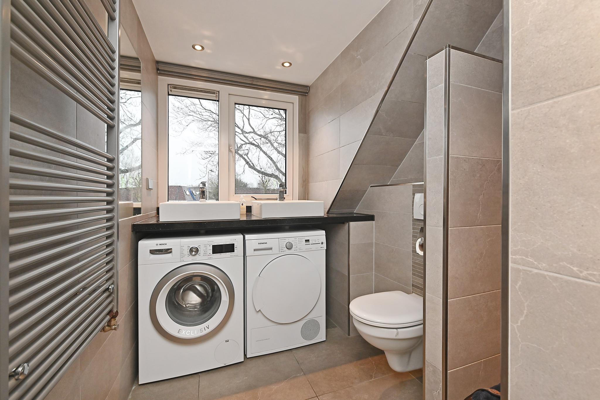 1e etage: voor en achterzijde dakkapel, overloop, 2 slaapkamers, keurig ingerichte badkamer met designradiator, wastafelmeubel, douchecabine, 2e (zwevend) toilet en aansluiting voor machine en droger.