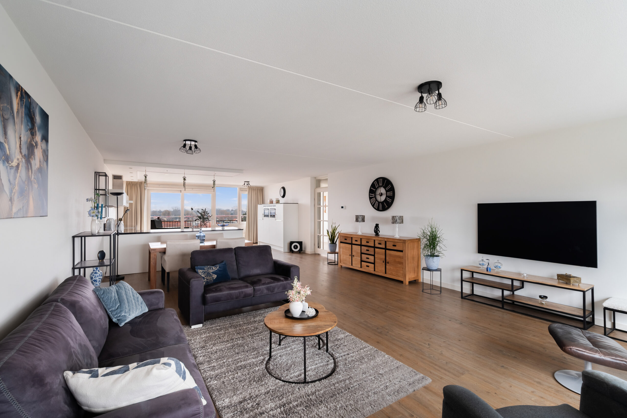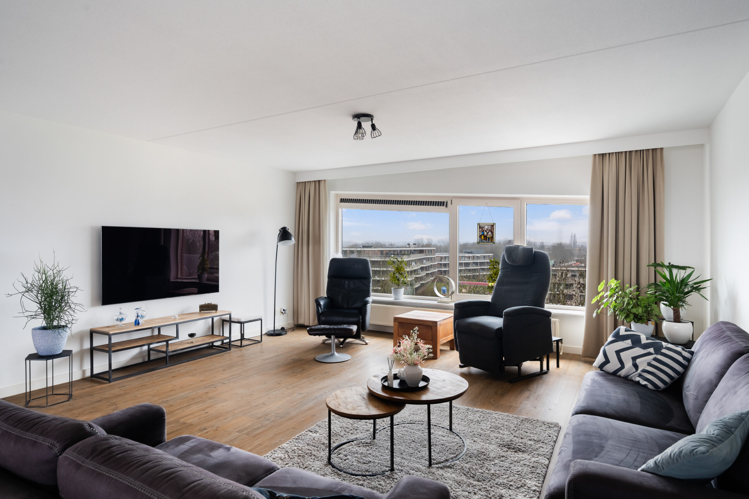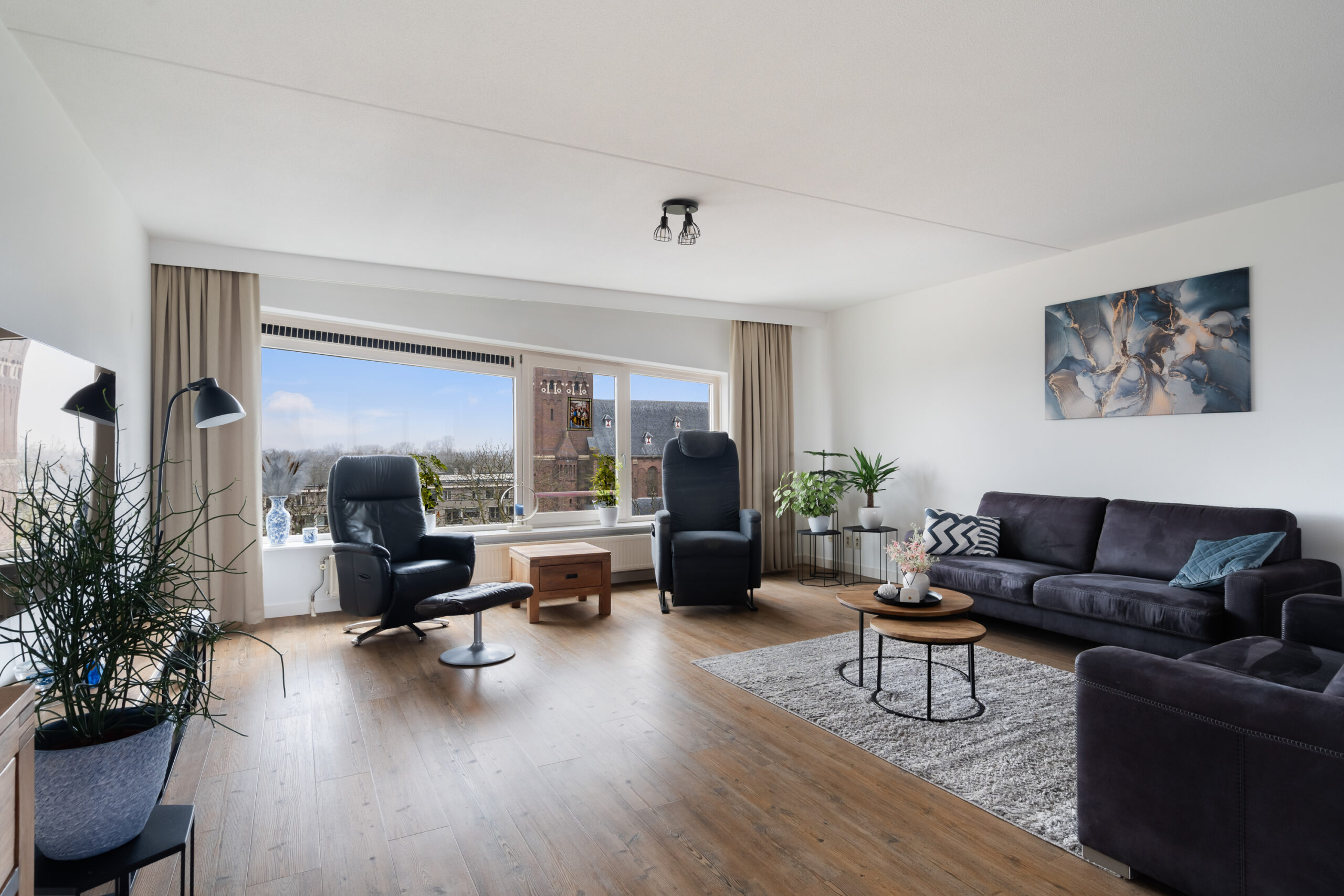 Zeer ruime en lichte woonkamer met uitzicht op de kerk en de Oostlaan.