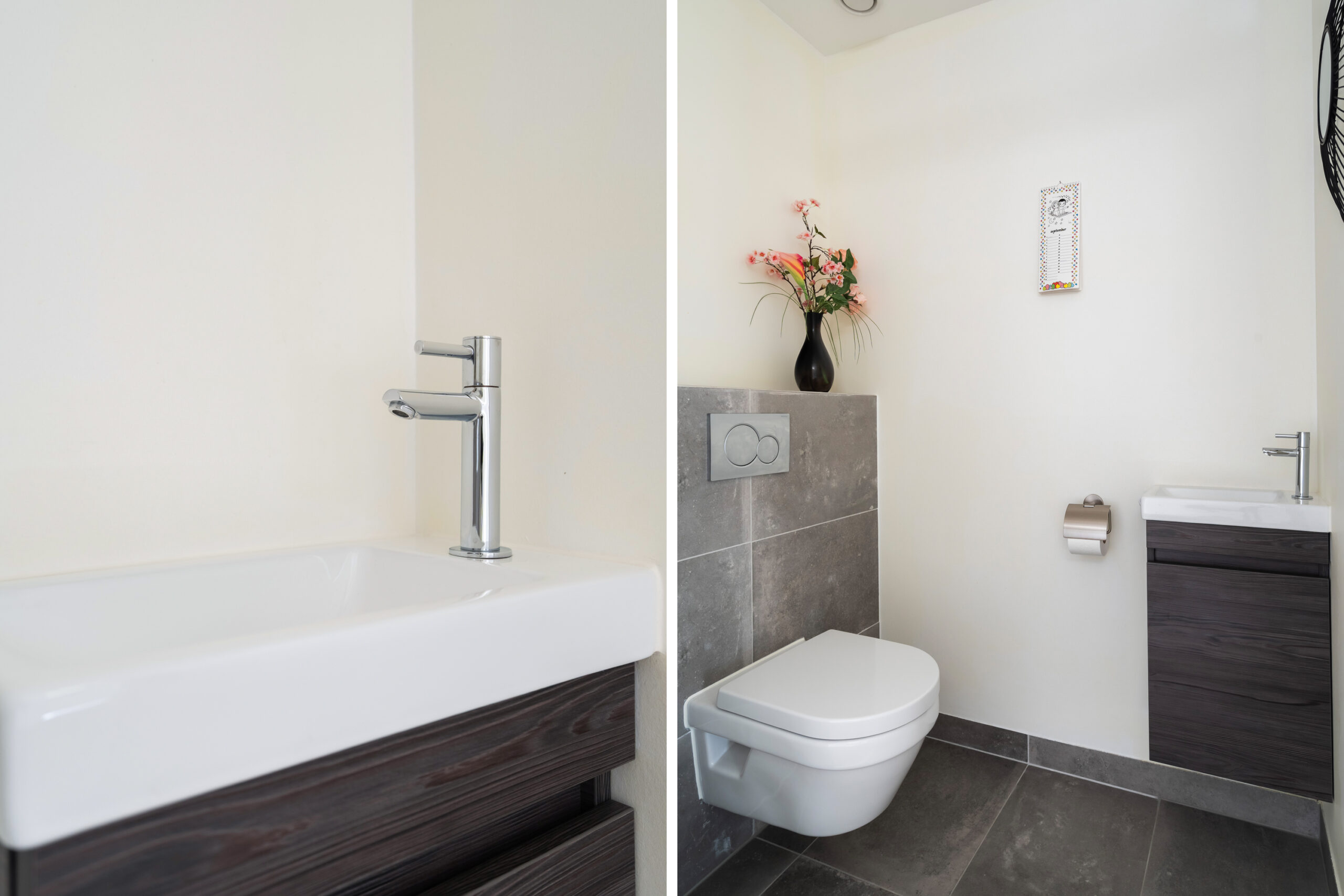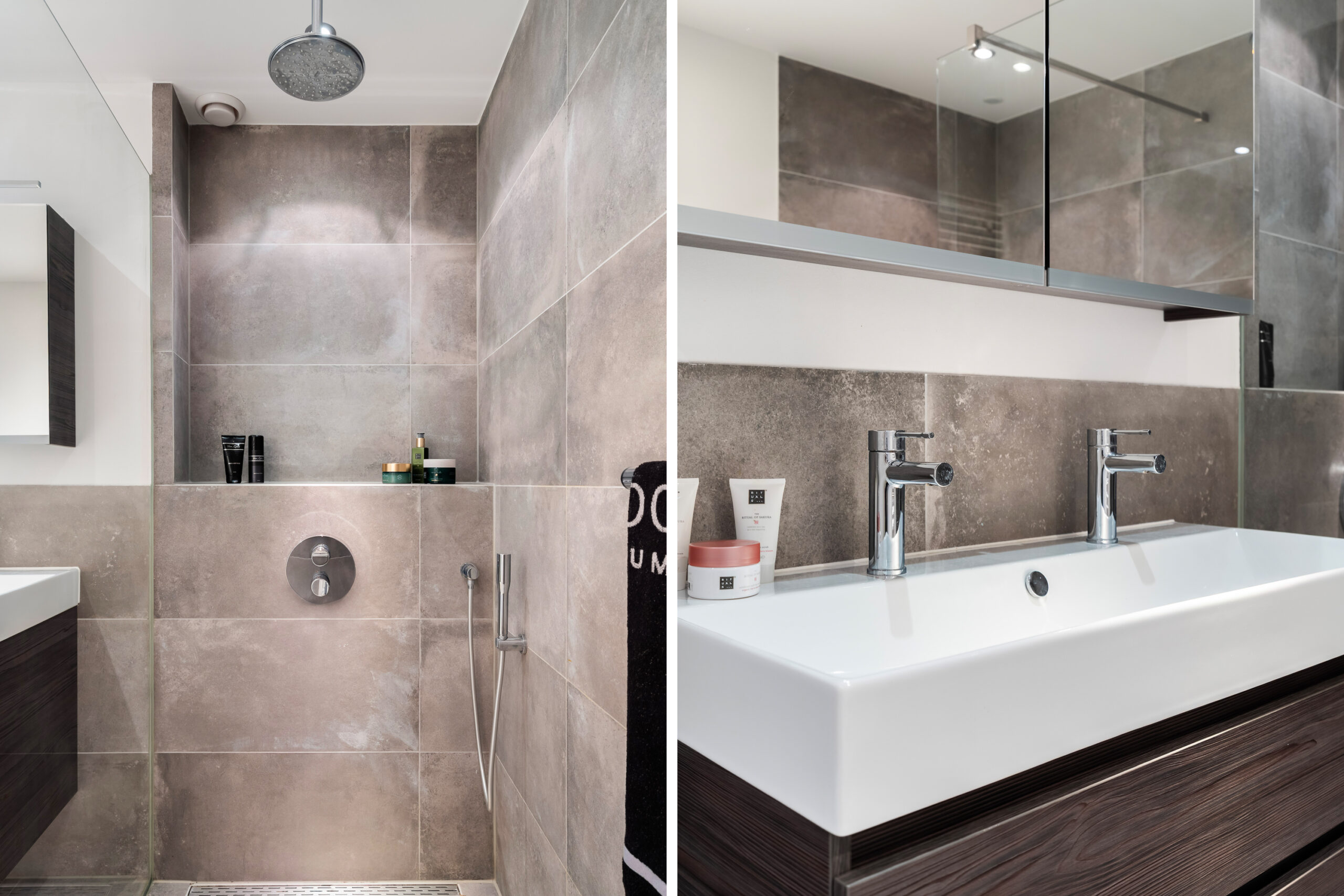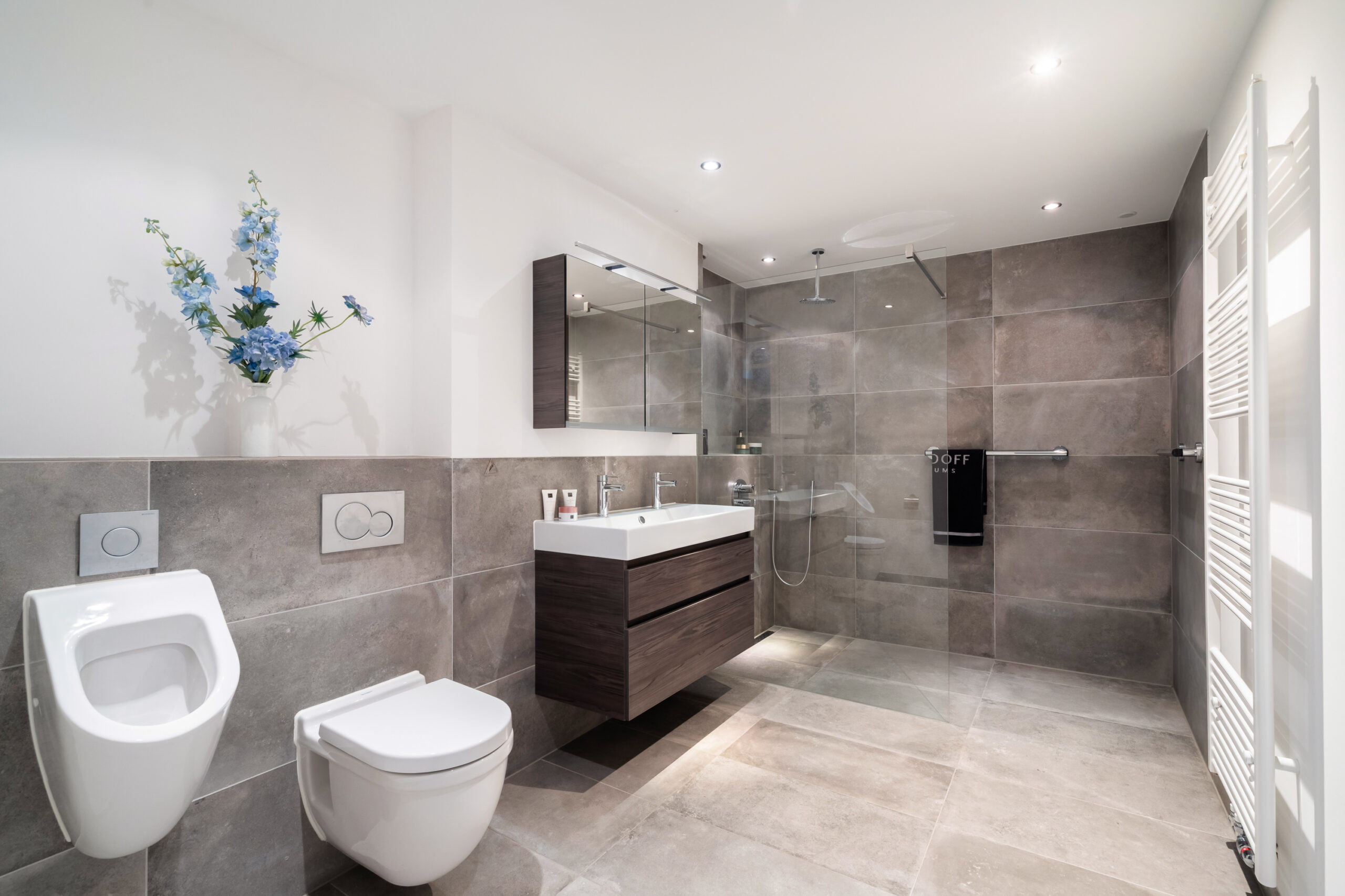 Riante badkamer met ruime inloopdouche, groot wastafelmeubel, 2e toilet en bidet.