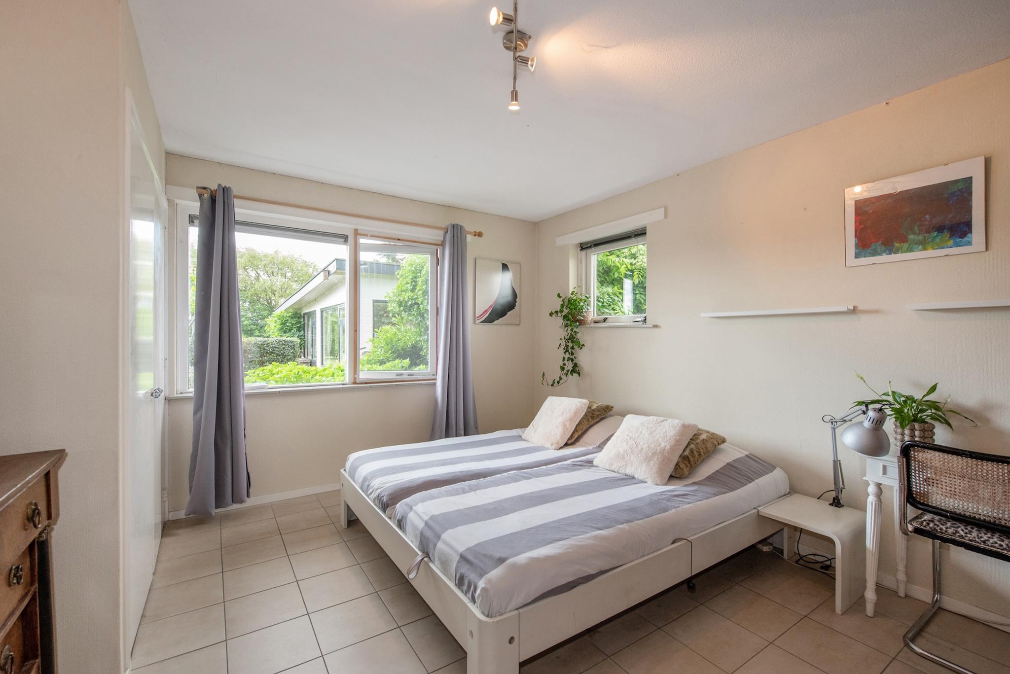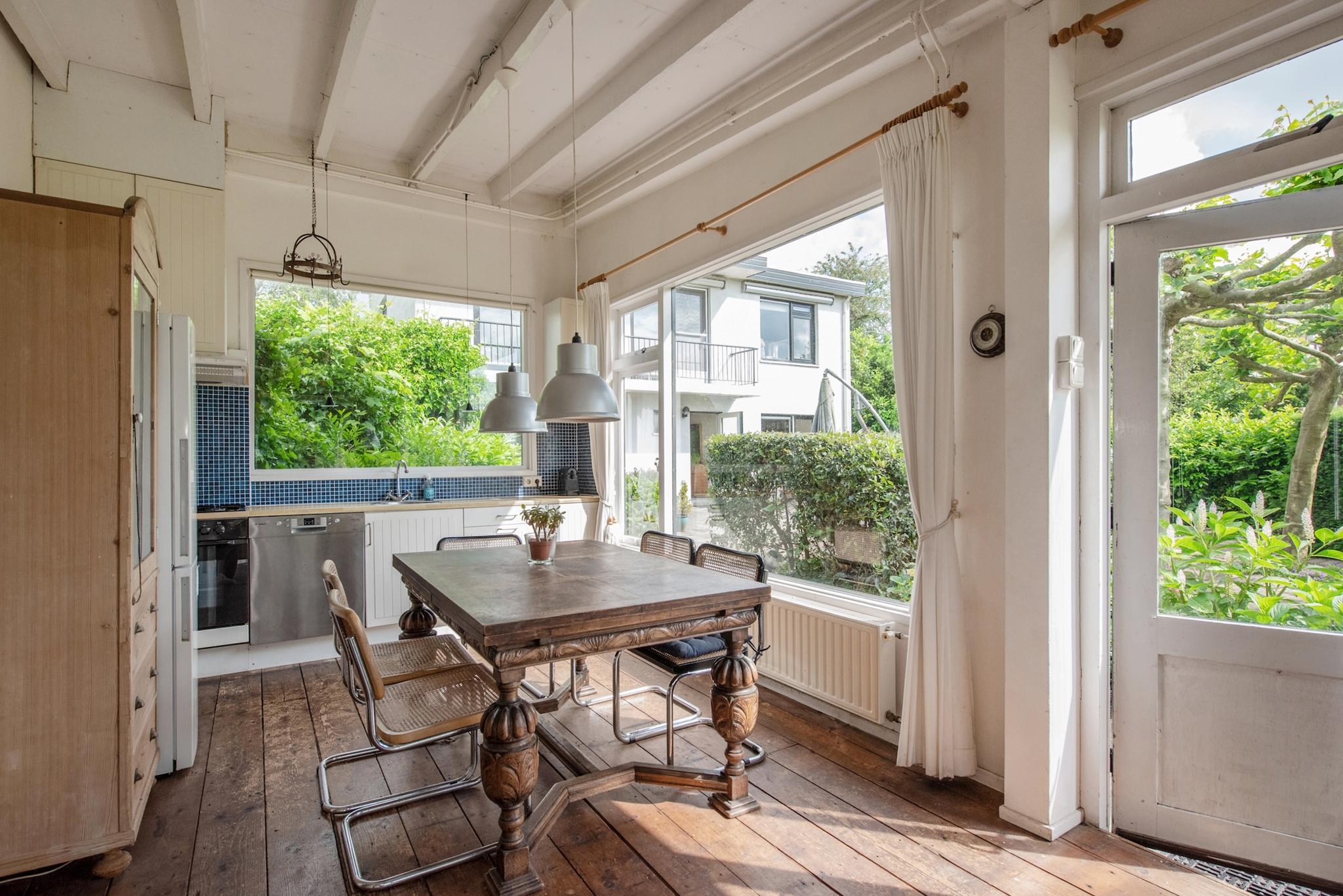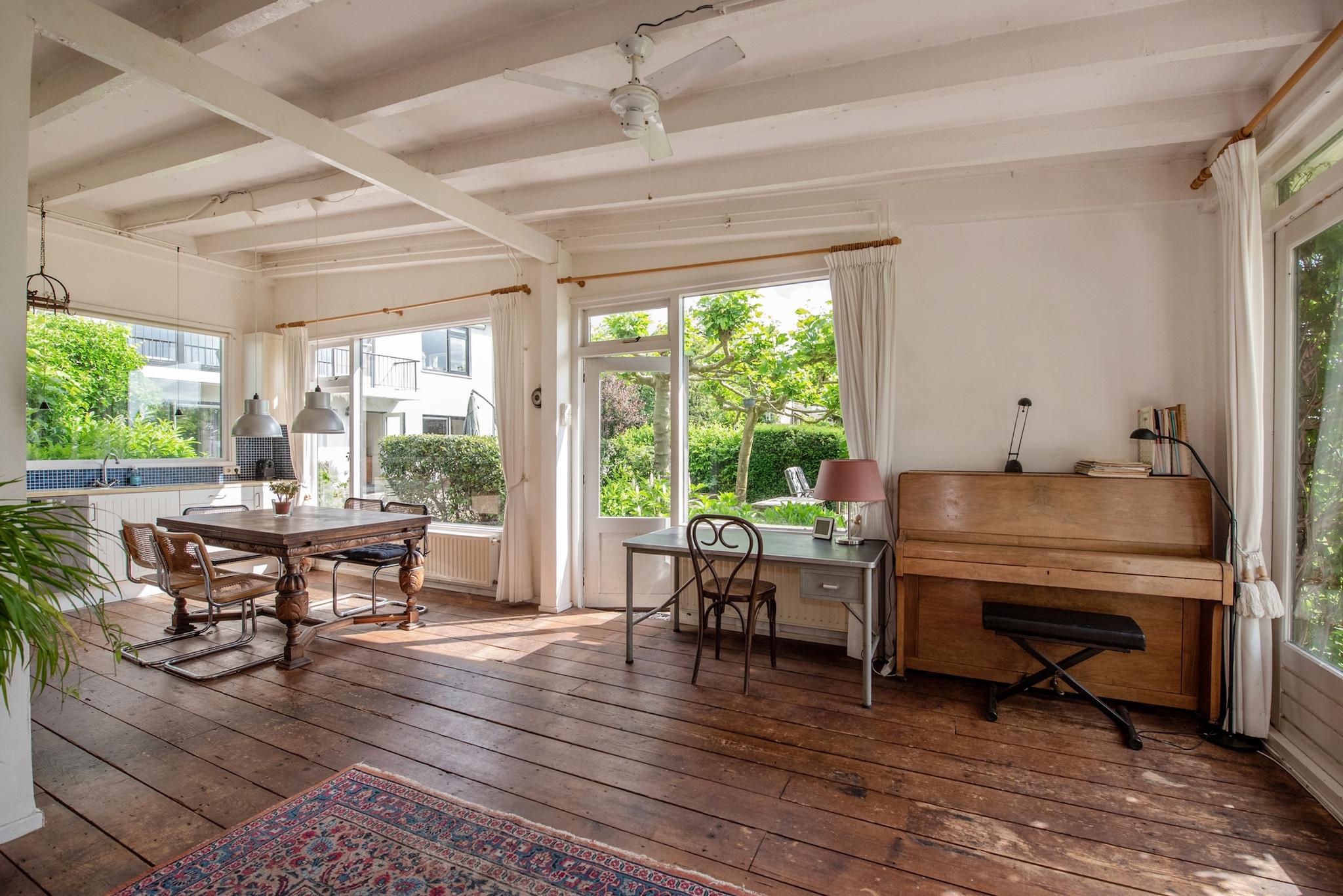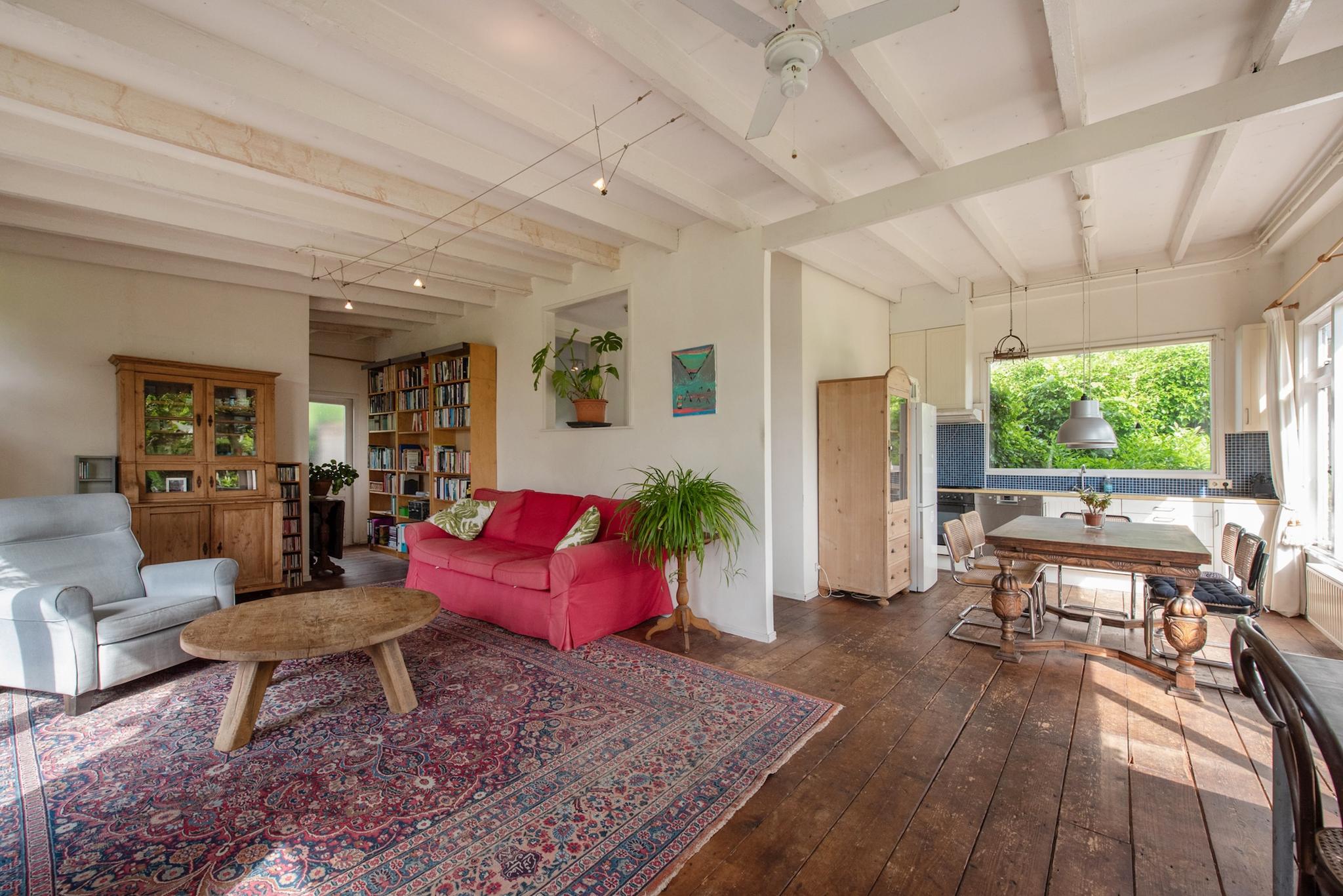 Indeling atelier: Grote ruimte/woonkamer met openslaande deuren naar de tuinzijde, open keuken met enige inbouwapparatuur en opstelling CV ketel t.b.v. atelier. Via trapje/niveauverschil toegang naar slaapkamer en badkamer. Het atelier biedt meerdere gebruiksmogelijkheden zoals praktijk aan huis, thuis werken, hobby/schilderen, semi zelfstandig (in)wonen van kinderen of ouders. Let wel: 1 huisnummer, splitsen is niet mogelijk.