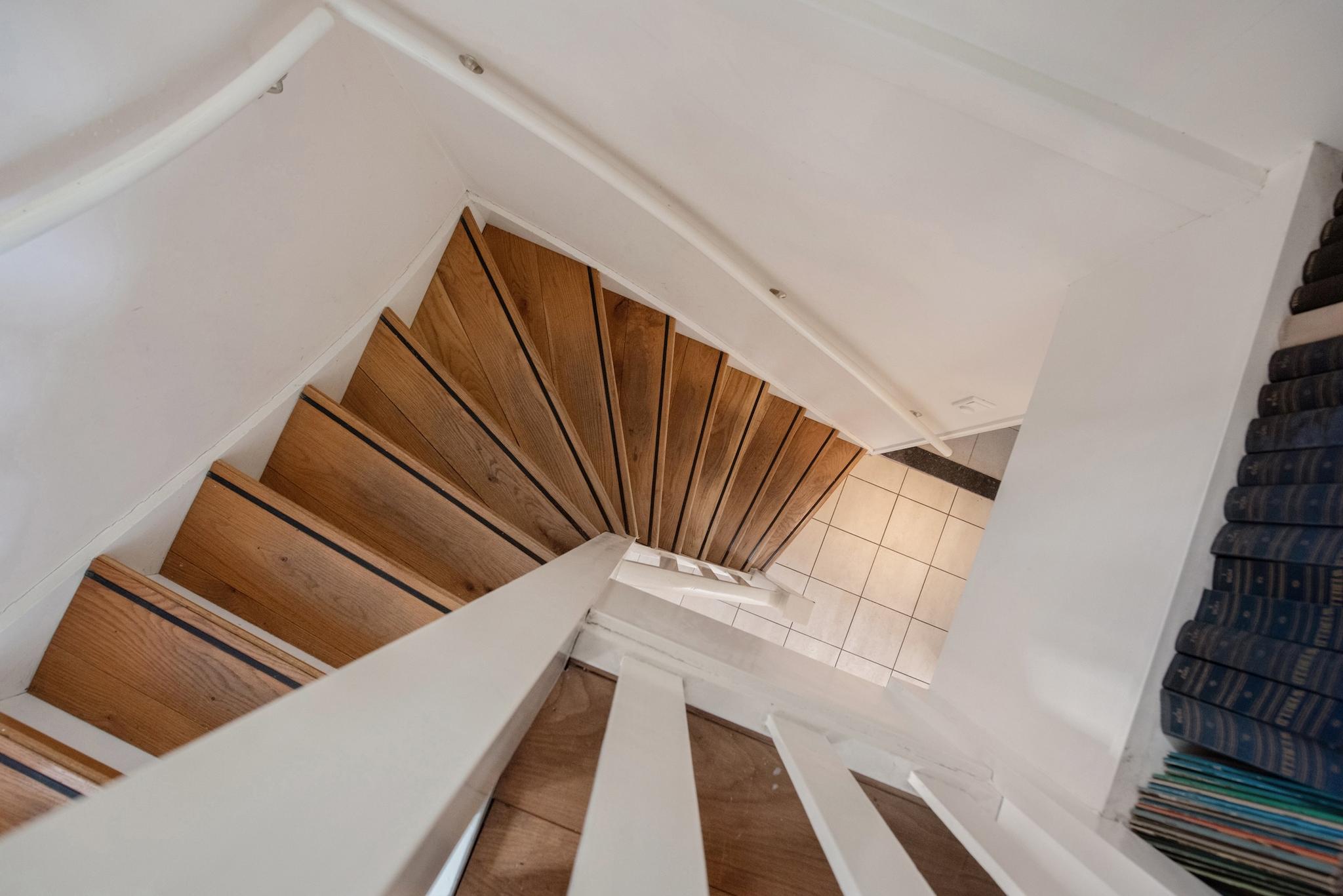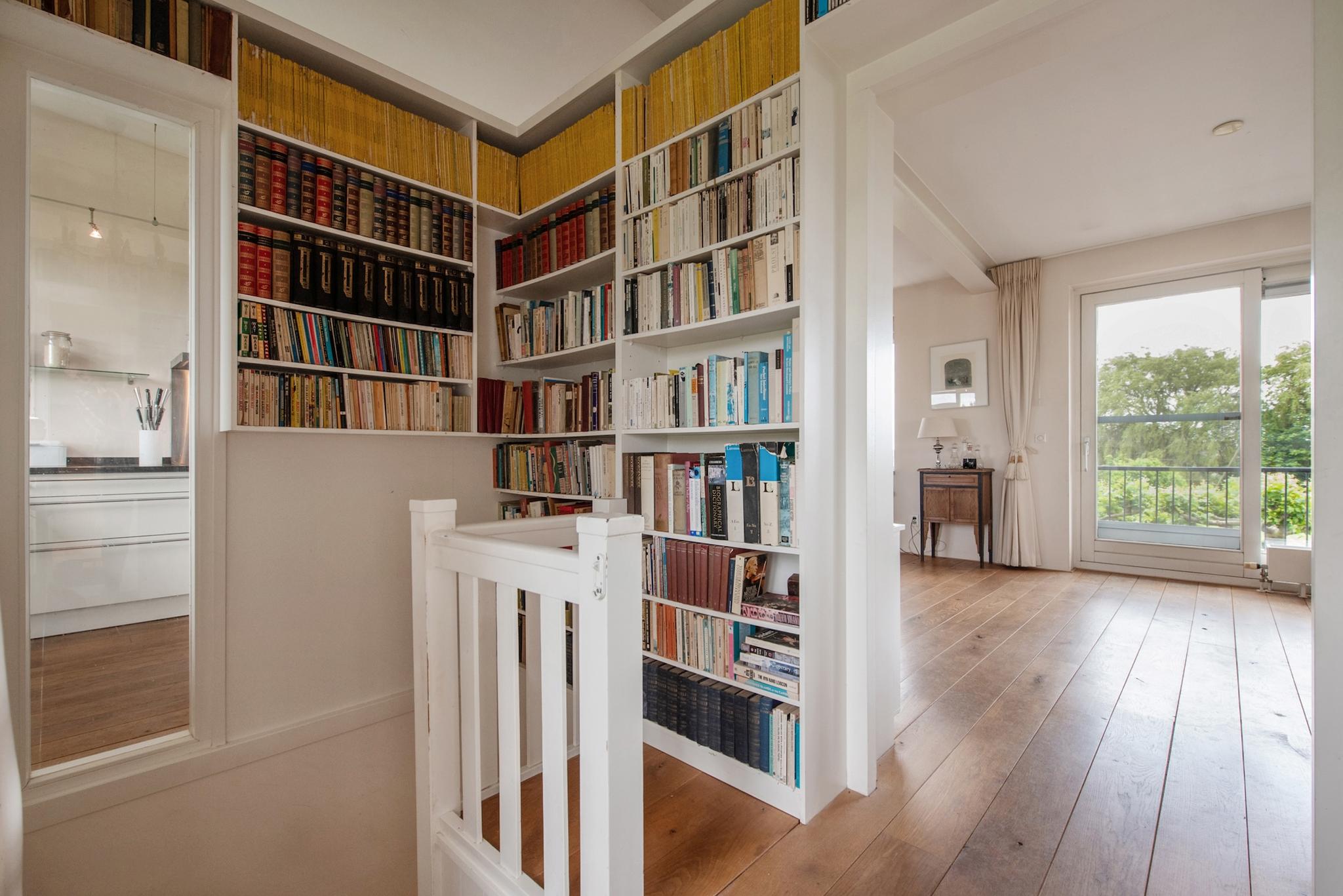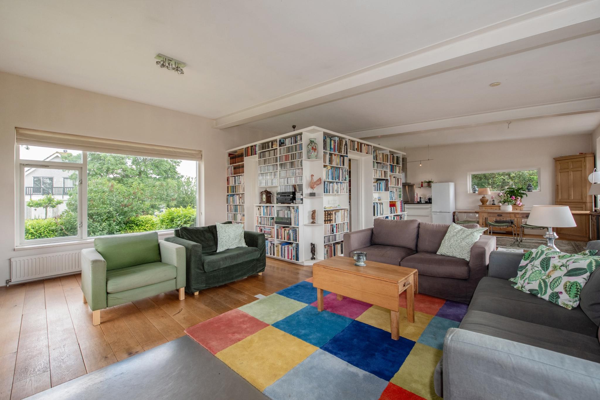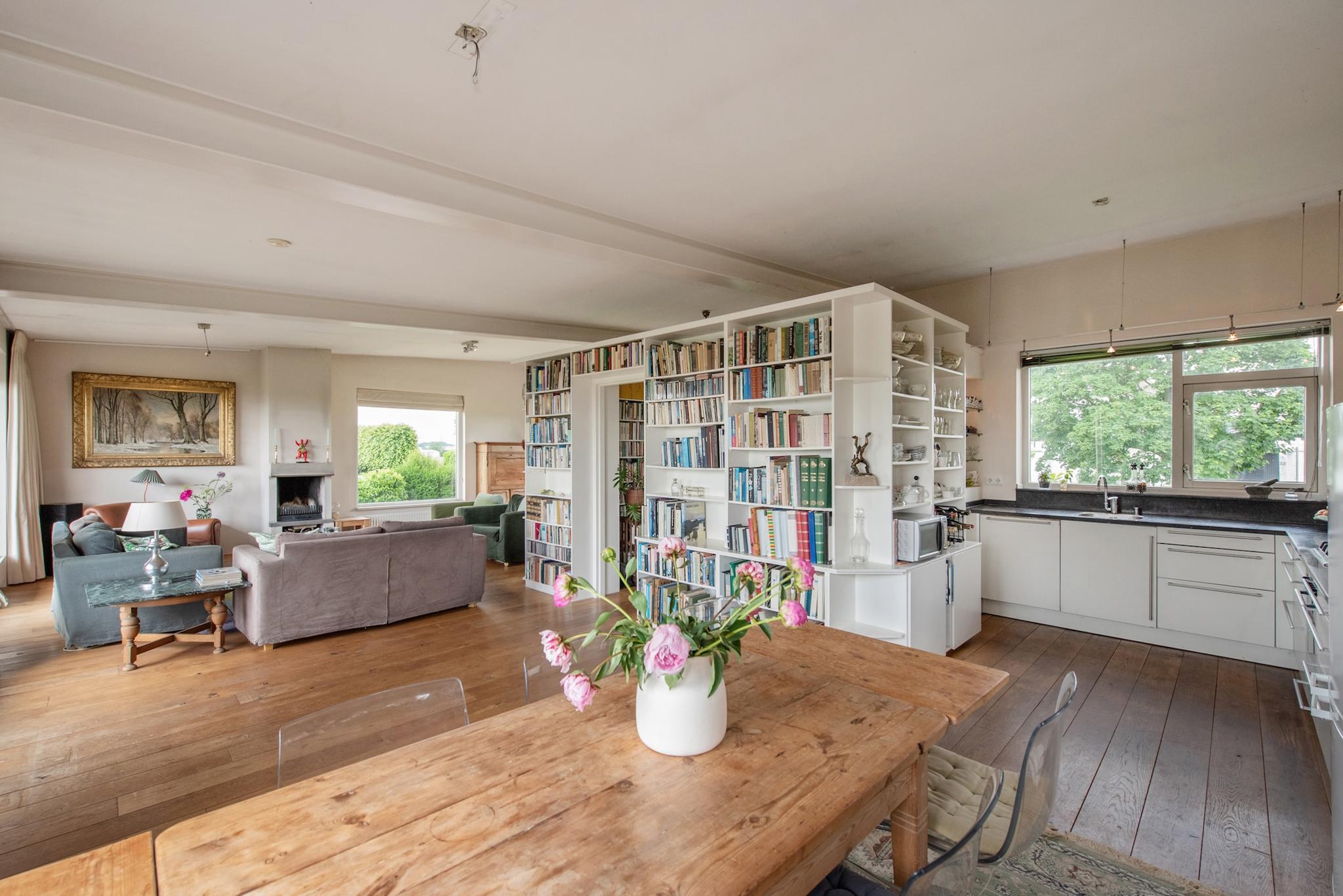 Indeling woning: Beletage, kleine hal met trap naar souterrain, meterkast. Grote open woonetage in een U-vorm rondom de entree. Veel lichtinval doordat de woonkamer rondom voorzien is van grote raampartijen. Een robuuste open haard partij geeft gelegenheid voor veel gezellige momenten. Aan voorzijde van de woning bevindt zich de ruime in U-vorm opgestelde keuken die met enige inbouwapparatuur is uitgerust. Deze etage is v.v. een houten vloer.