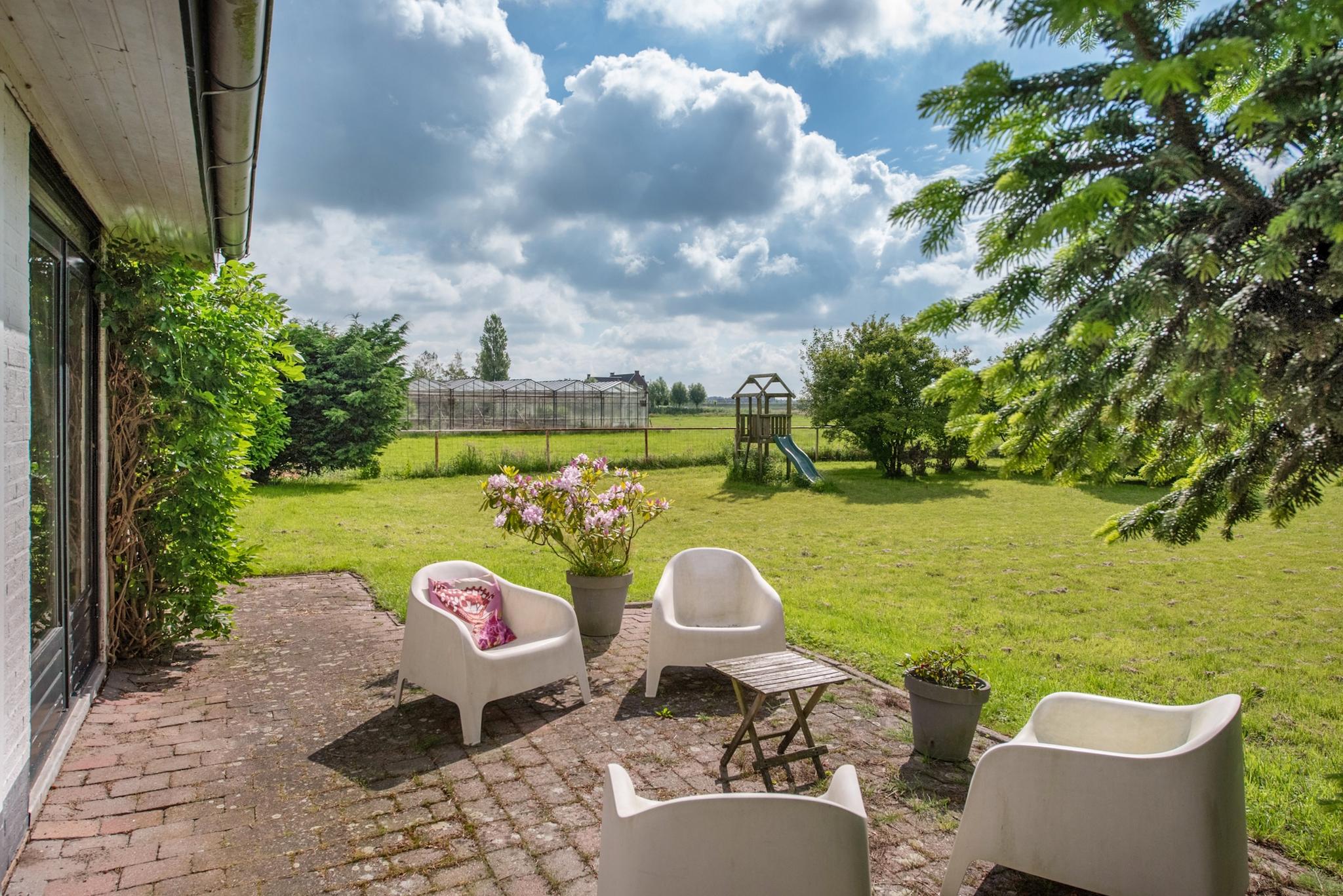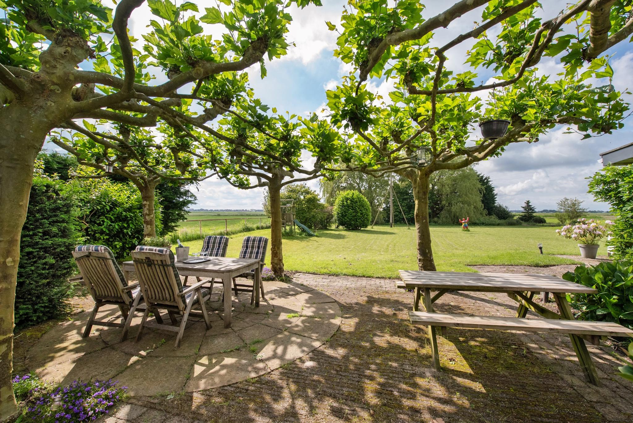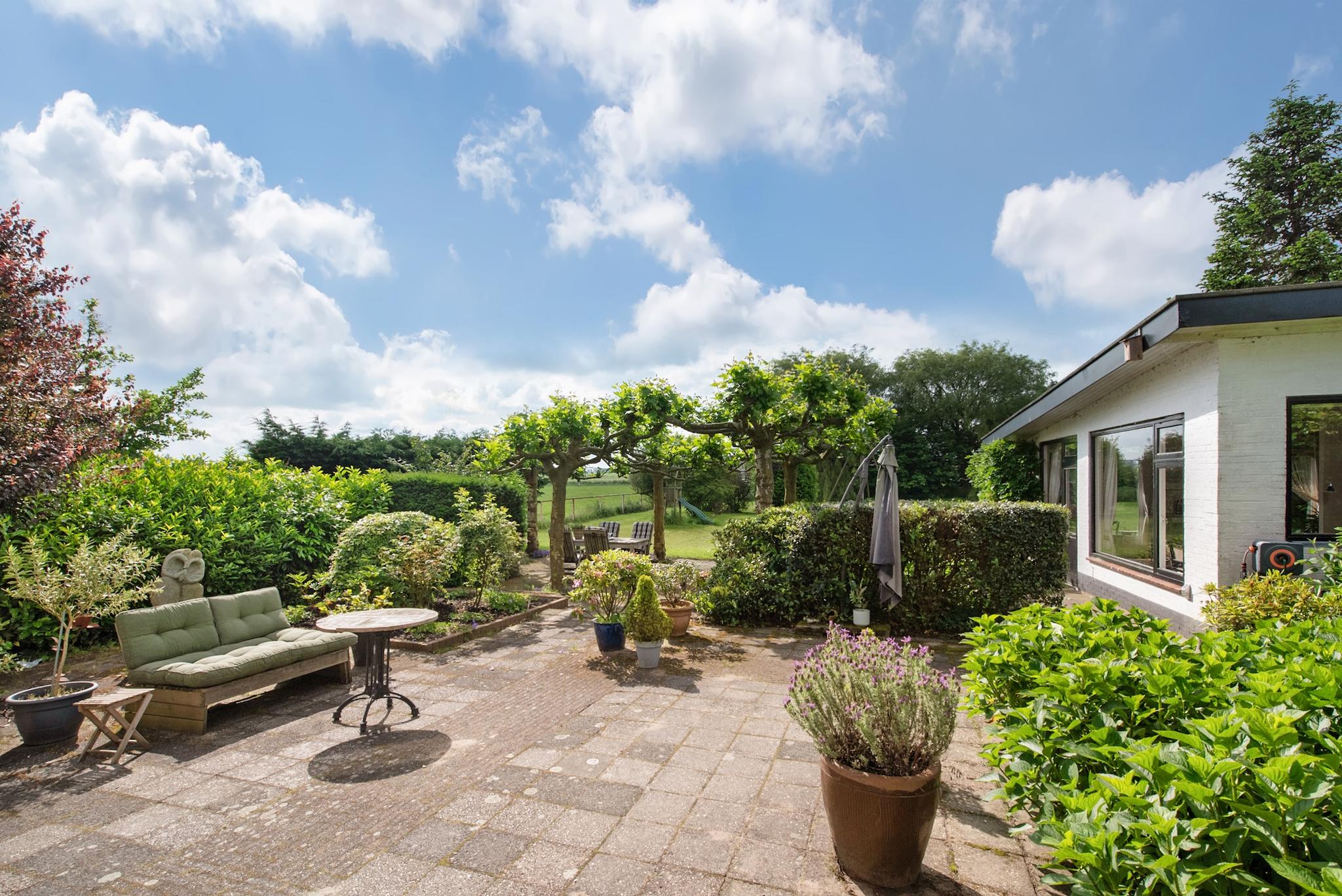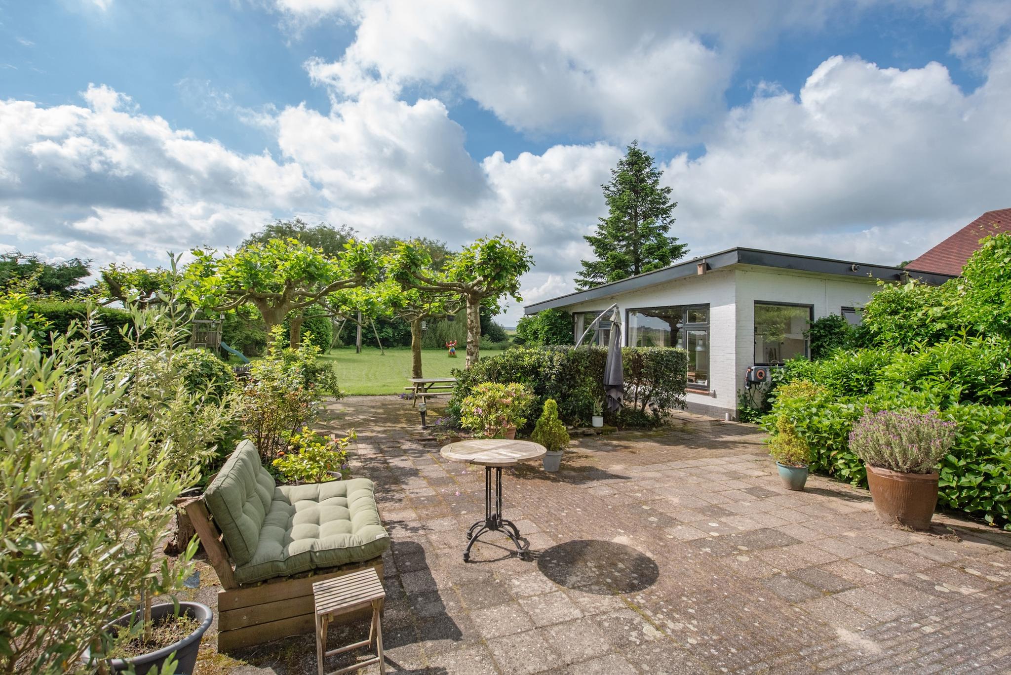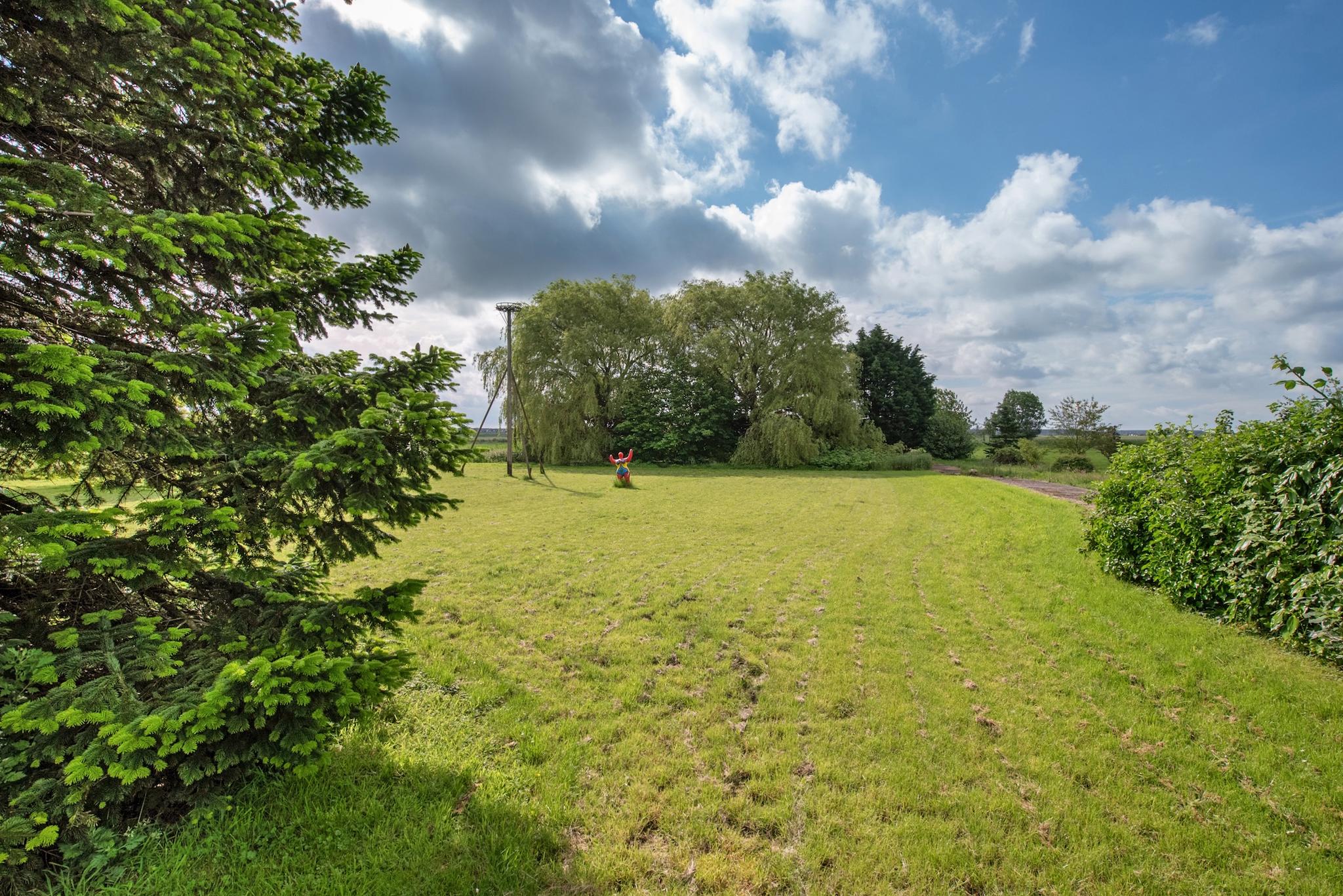 Tuin: Rondom tuin, er zijn verschillende “tuin” kamers ingericht met zitjes en terrassen. Het perceel heeft veel weiland/grasland met o.a. een ooievaarsnest, nu maar hopen dat de ooievaar zich komt nestelen. Aan de rand van het perceel staan grote bomen hetgeen een speelse horizon geeft in het landschap en veel extra natuurgeluiden door