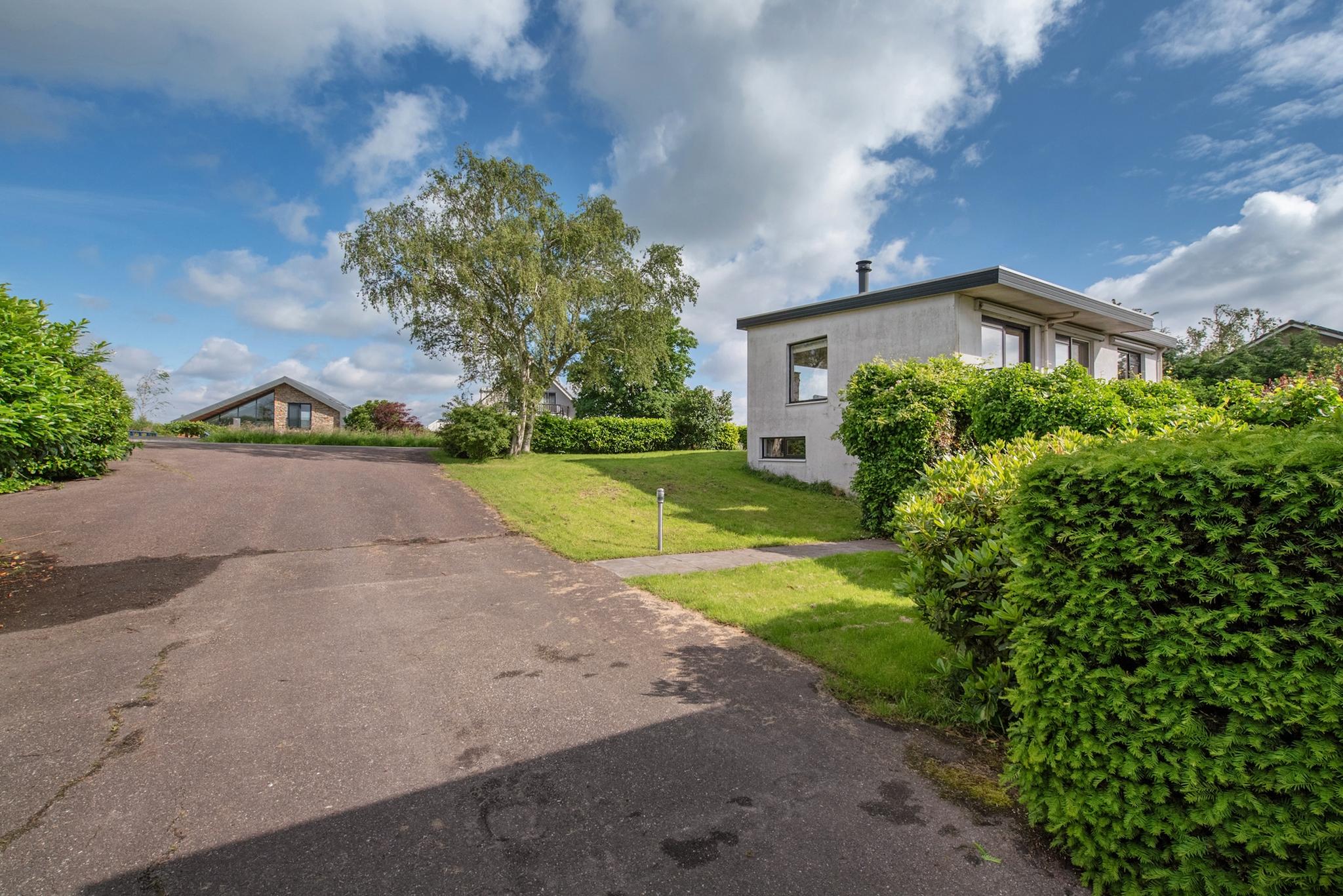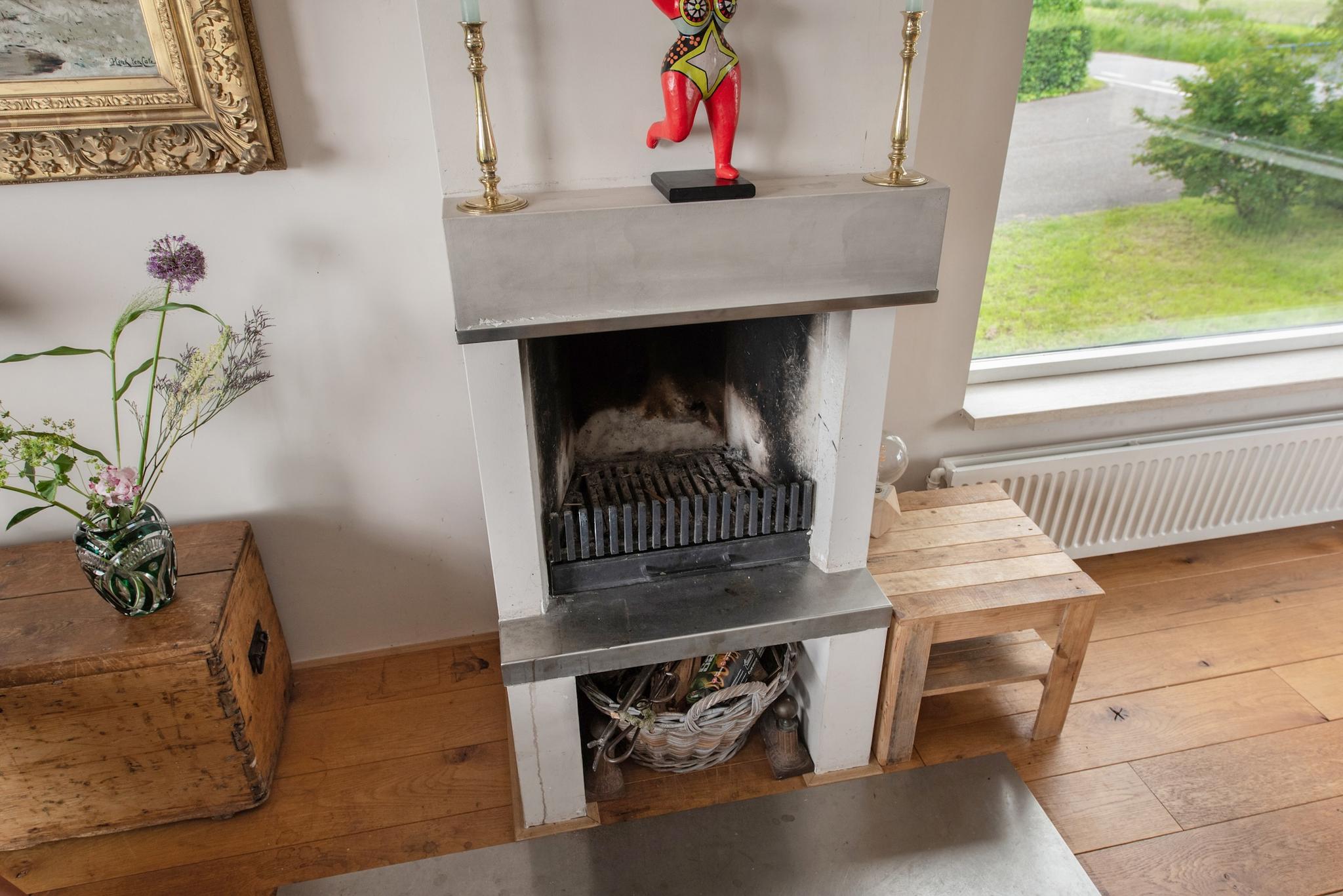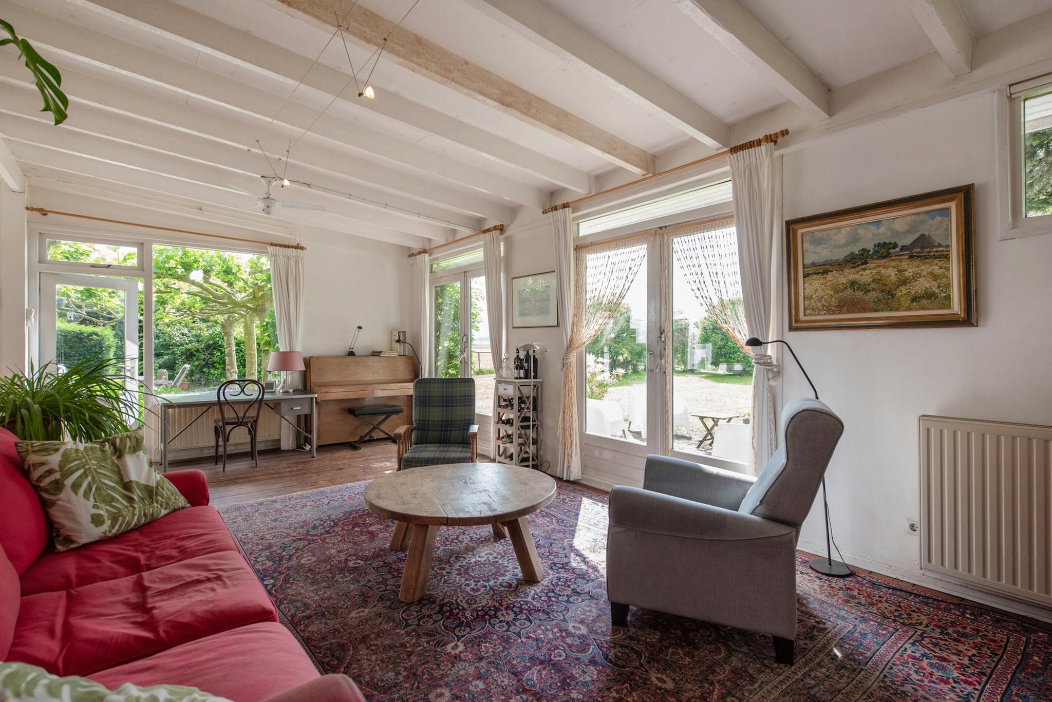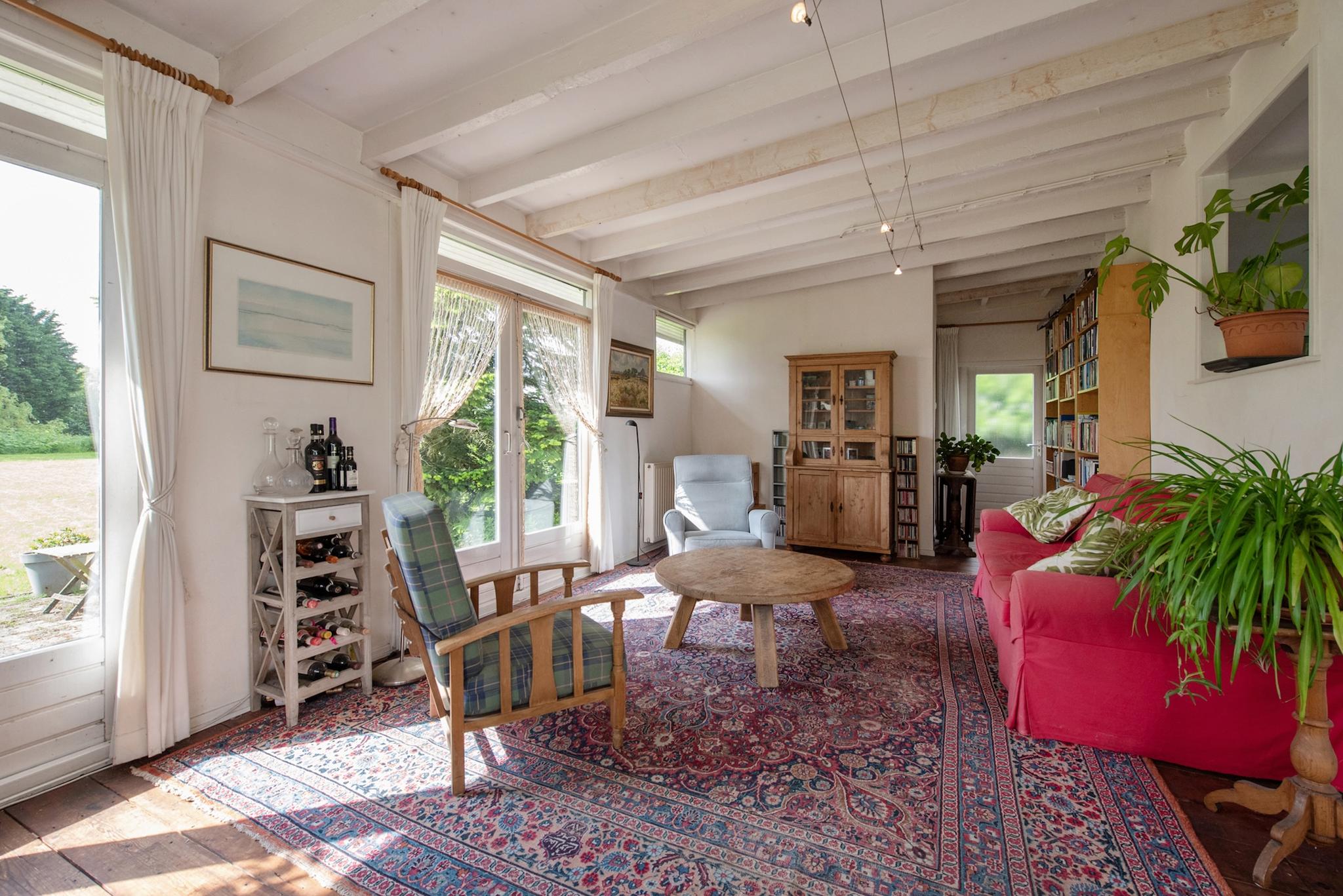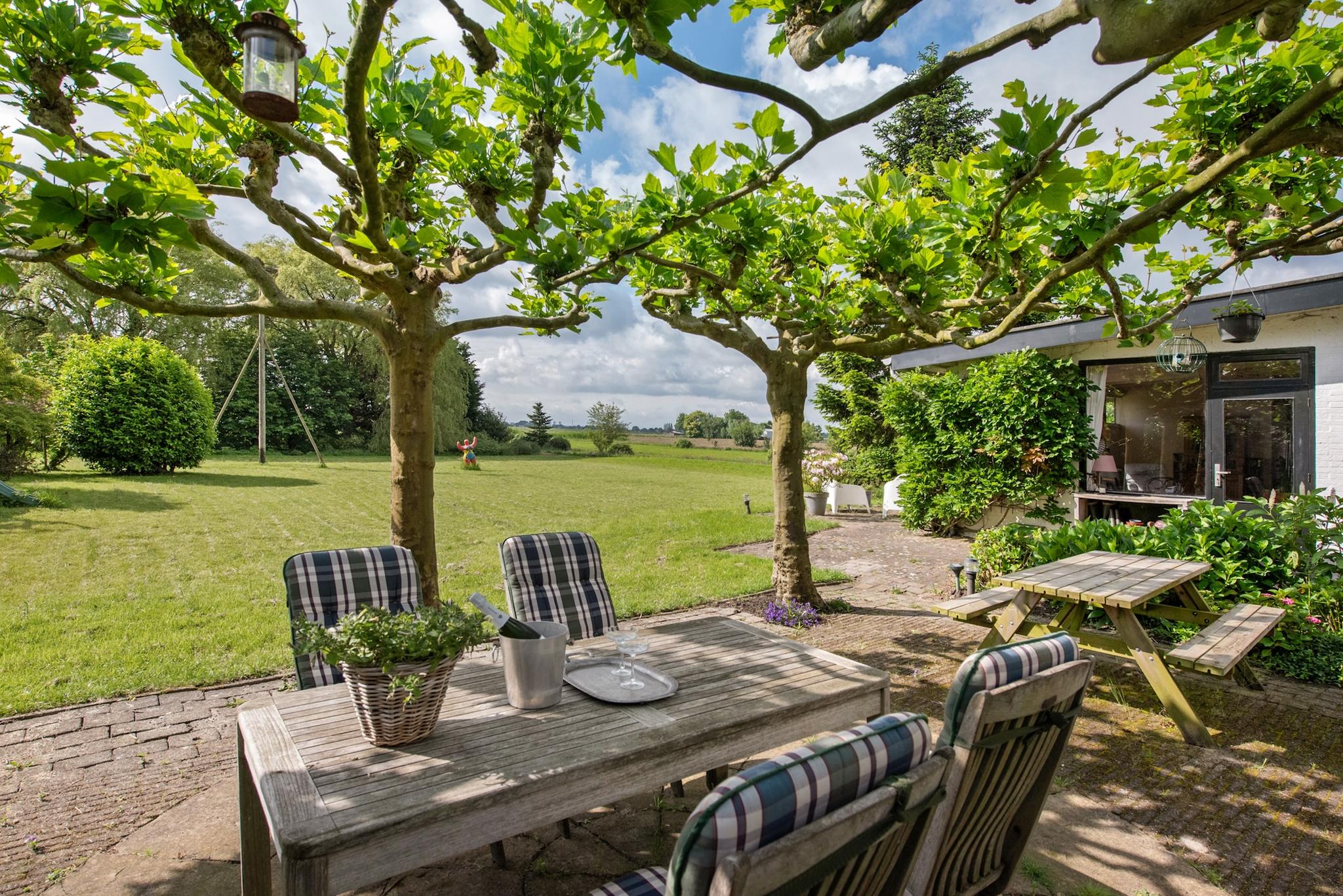 Tuin: Rondom tuin, er zijn verschillende “tuin” kamers ingericht met zitjes en terrassen. Het perceel heeft veel weiland/grasland met o.a. een ooievaarsnest, nu maar hopen dat de ooievaar zich komt nestelen. Aan de rand van het perceel staan grote bomen hetgeen een speelse horizon geeft in het landschap en veel extra natuurgeluiden door
